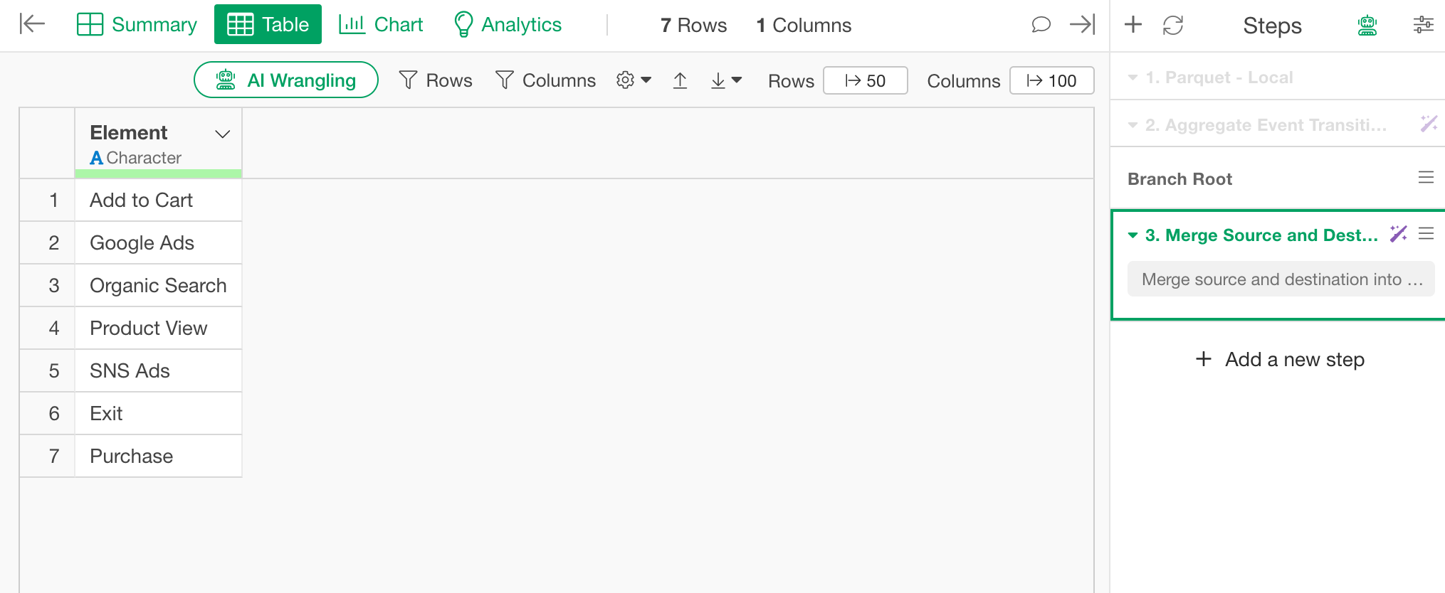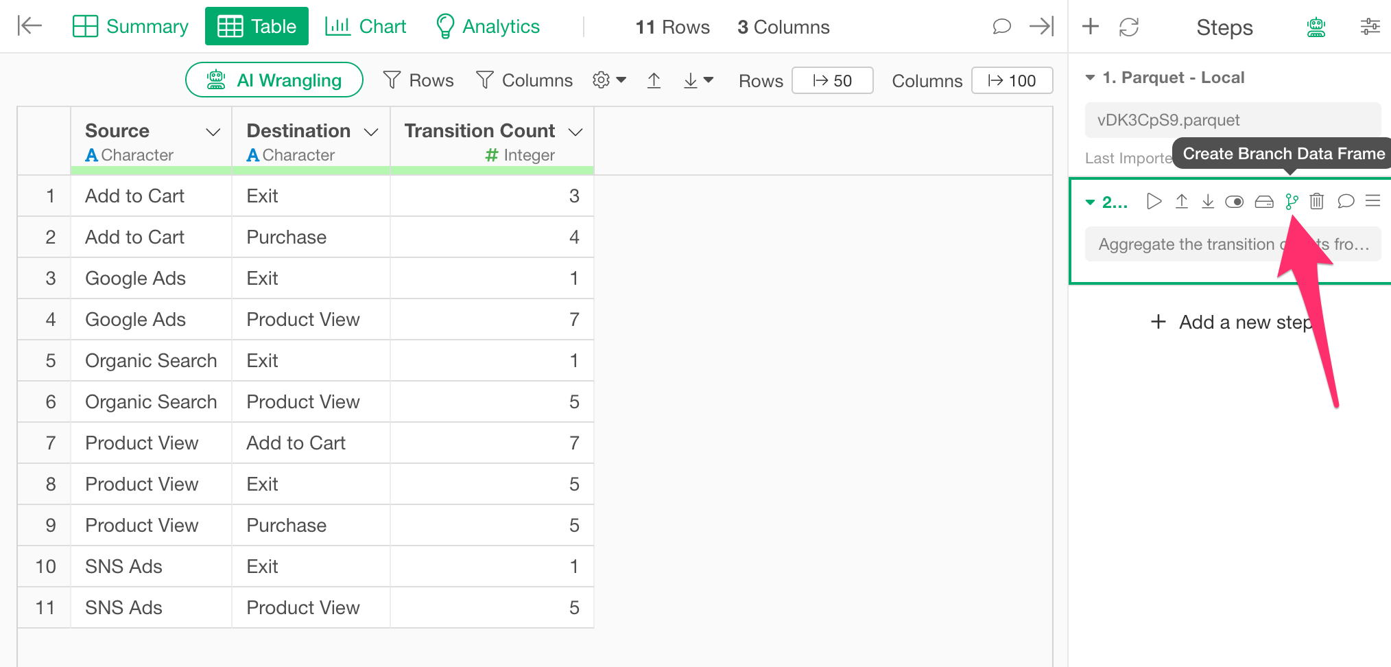 Return to the original data frame (log data) where you created the branch, and add a new step following the branch point.