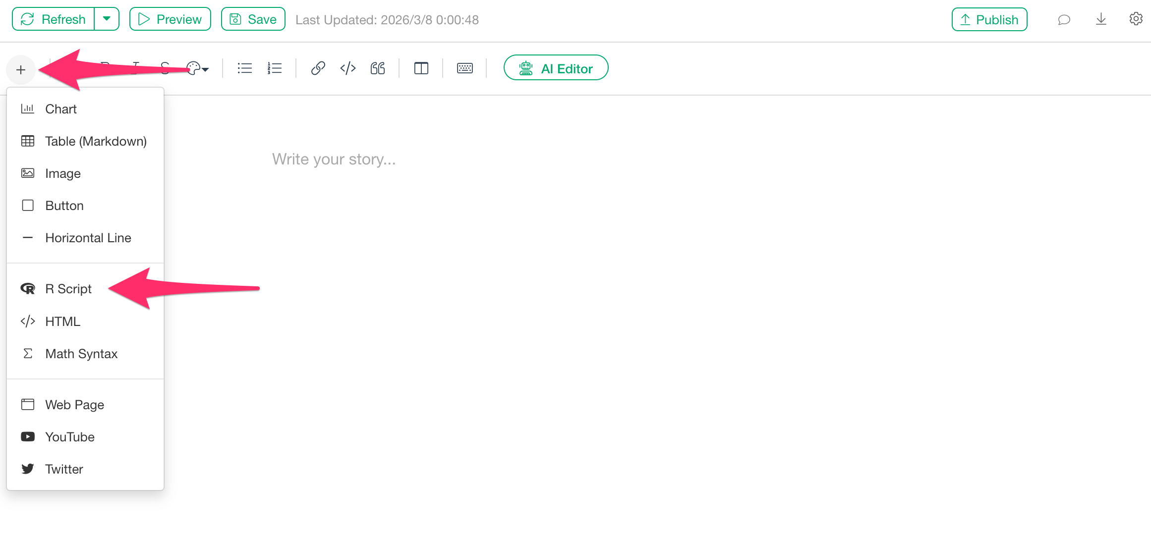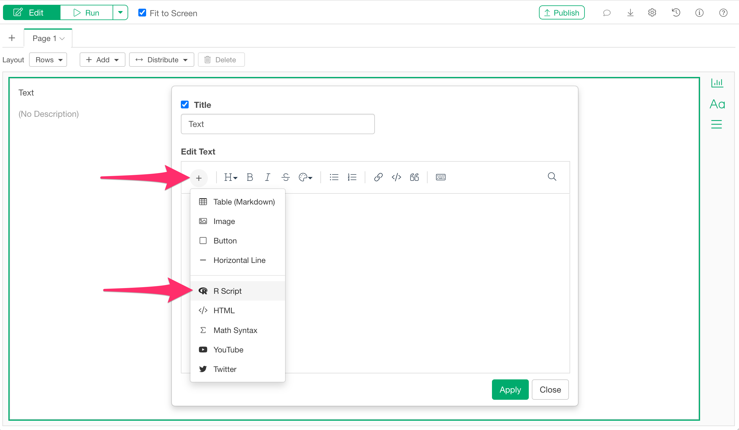 When the text editor opens, select “R Script” from the “Add Content” button.