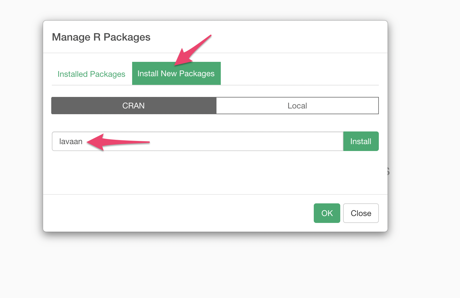 When the R Package Management dialog appears, click “Install Package” and install the “lavaan” and “semPlot” packages.