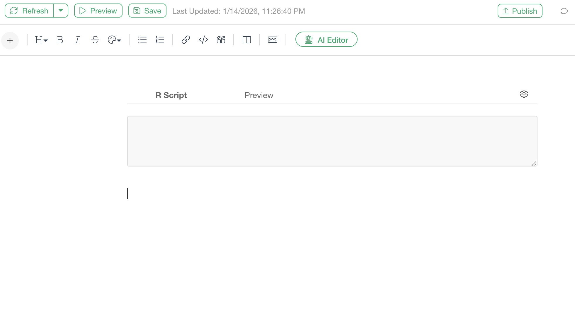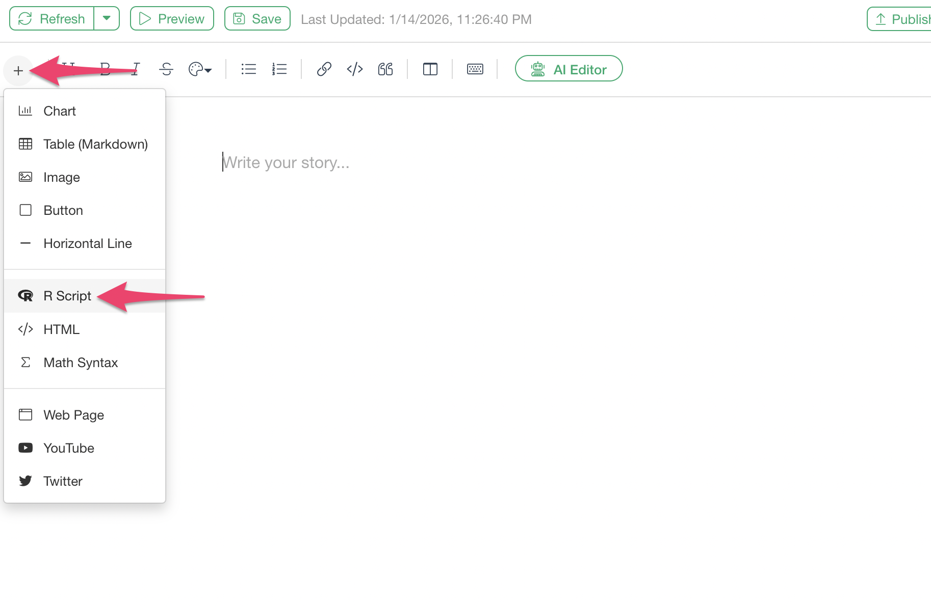 Once the Note window opens, click the plus button in the upper left and then click the “R Code” button.