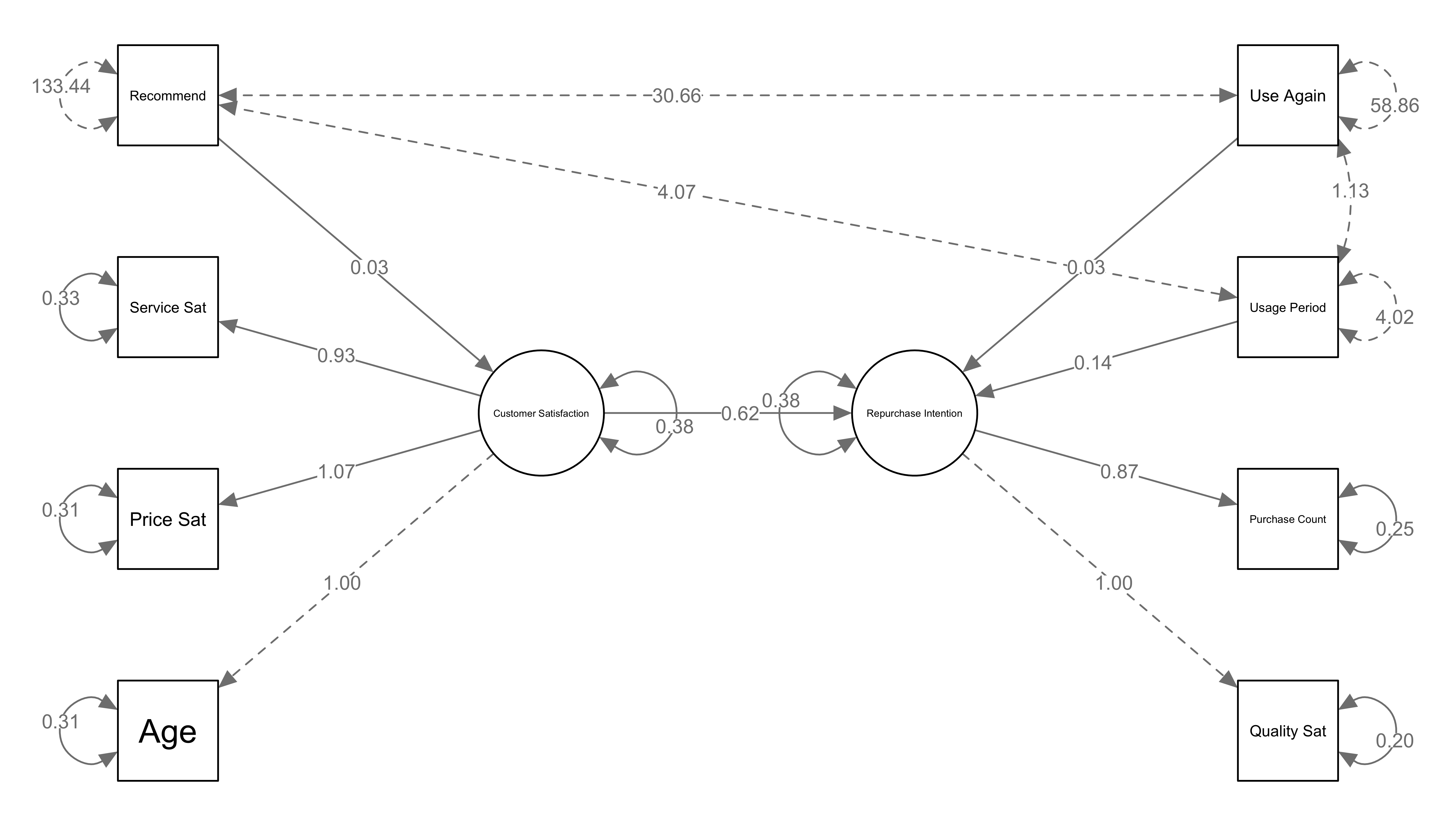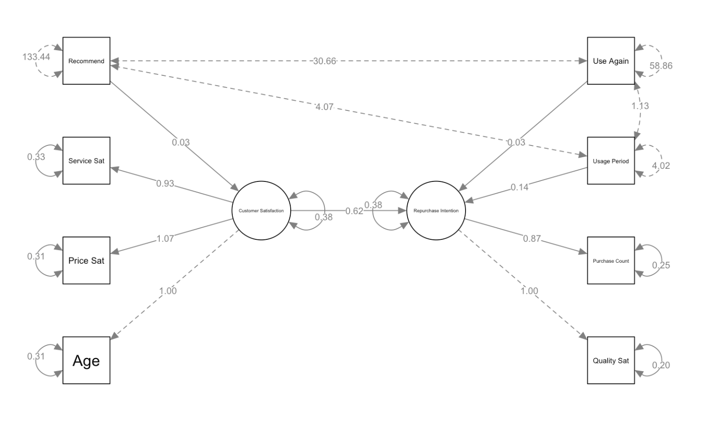 Structural Equation Modeling (SEM) is a powerful statistical method that introduces “latent variables” that cannot be directly measured and allows you to visualize and verify complex causal relationships between variables as path diagrams.