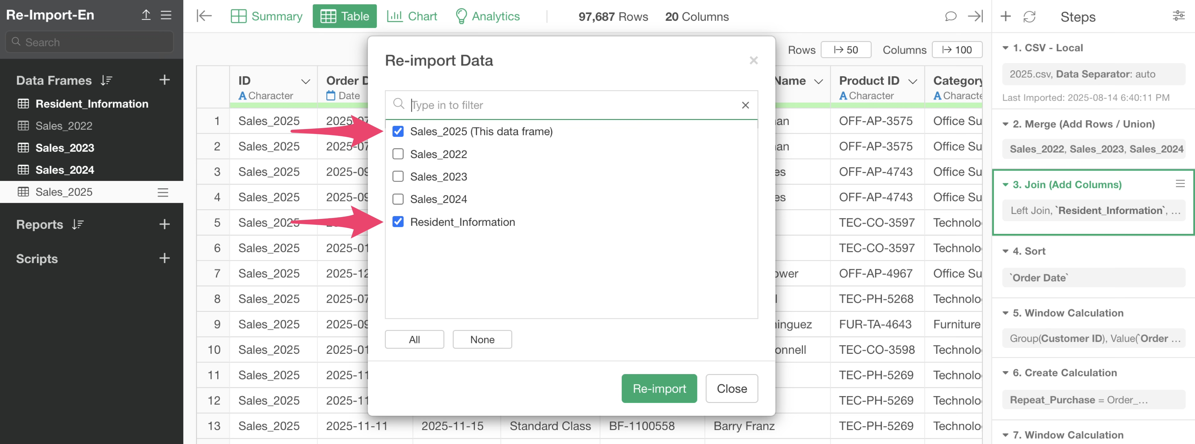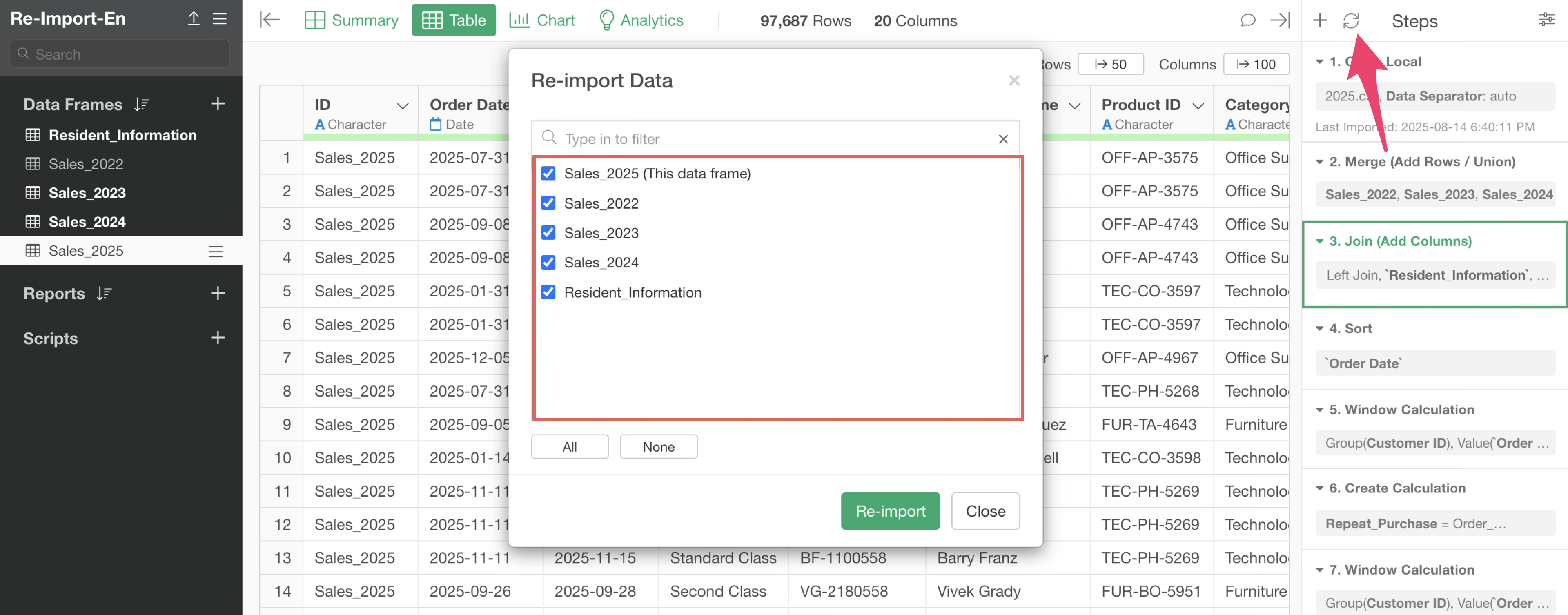 When you have steps that combine multiple data frames like in this case, clicking the re-import button will display all data frames related to the relevant data frame as a list.