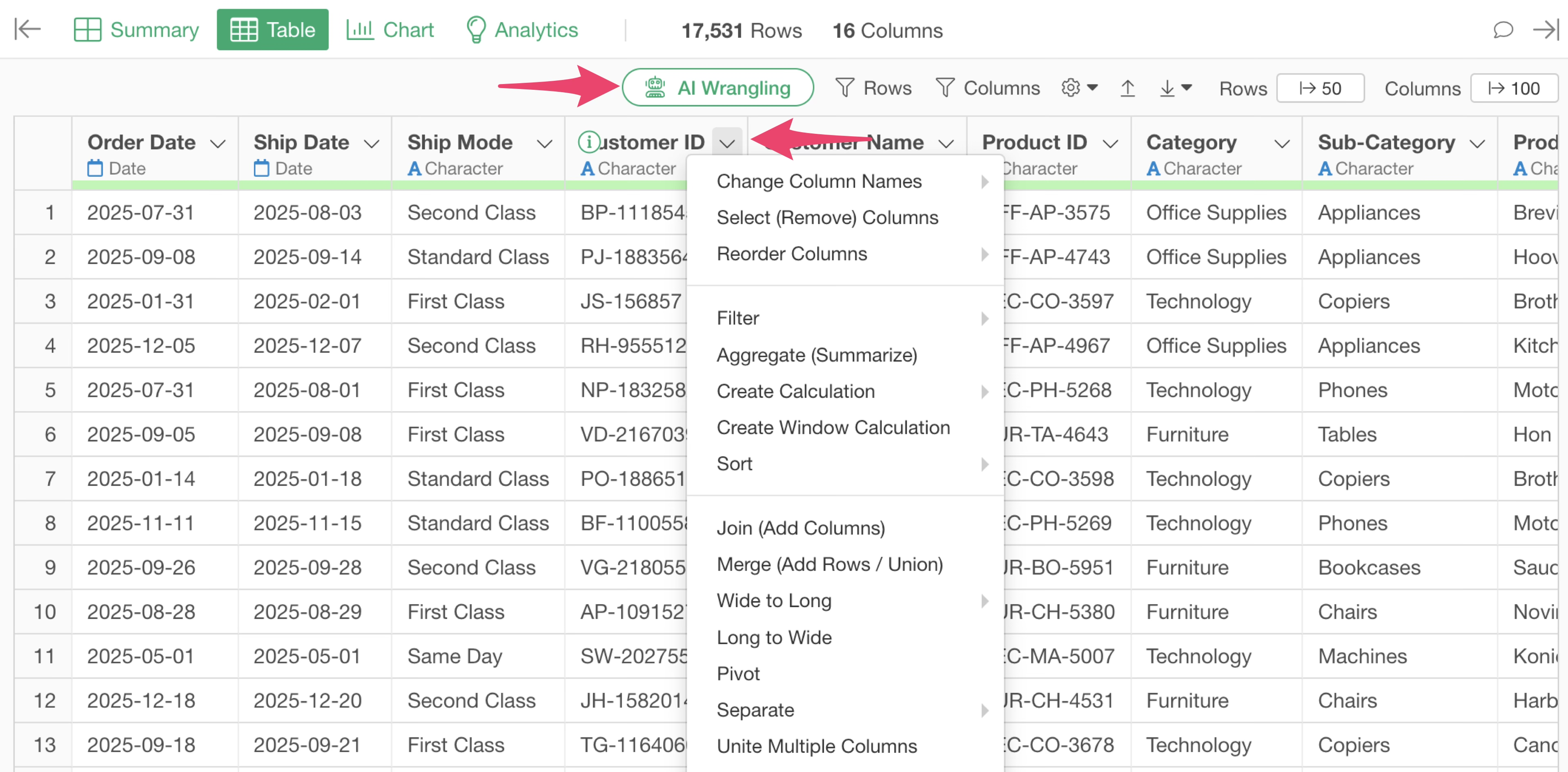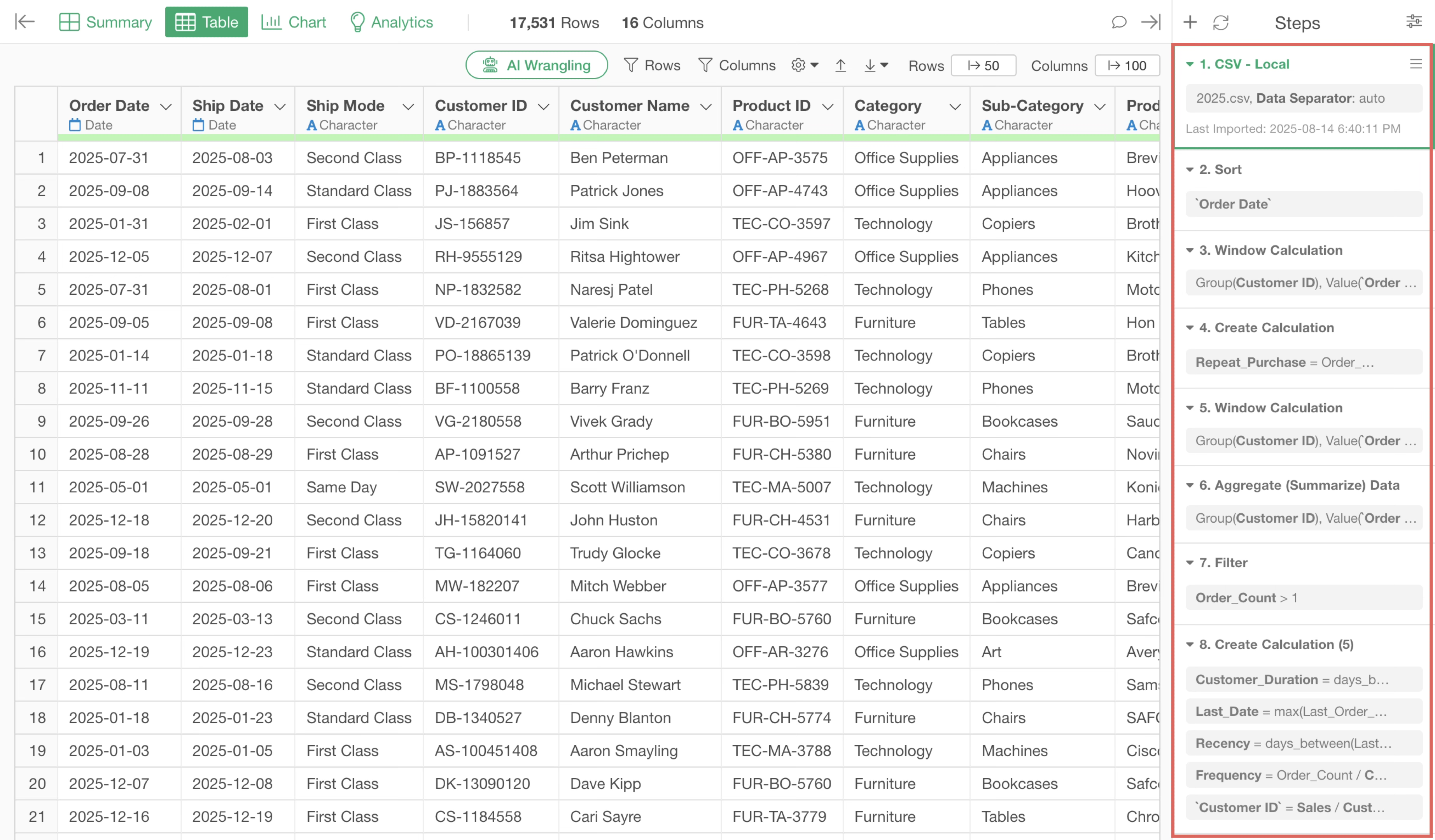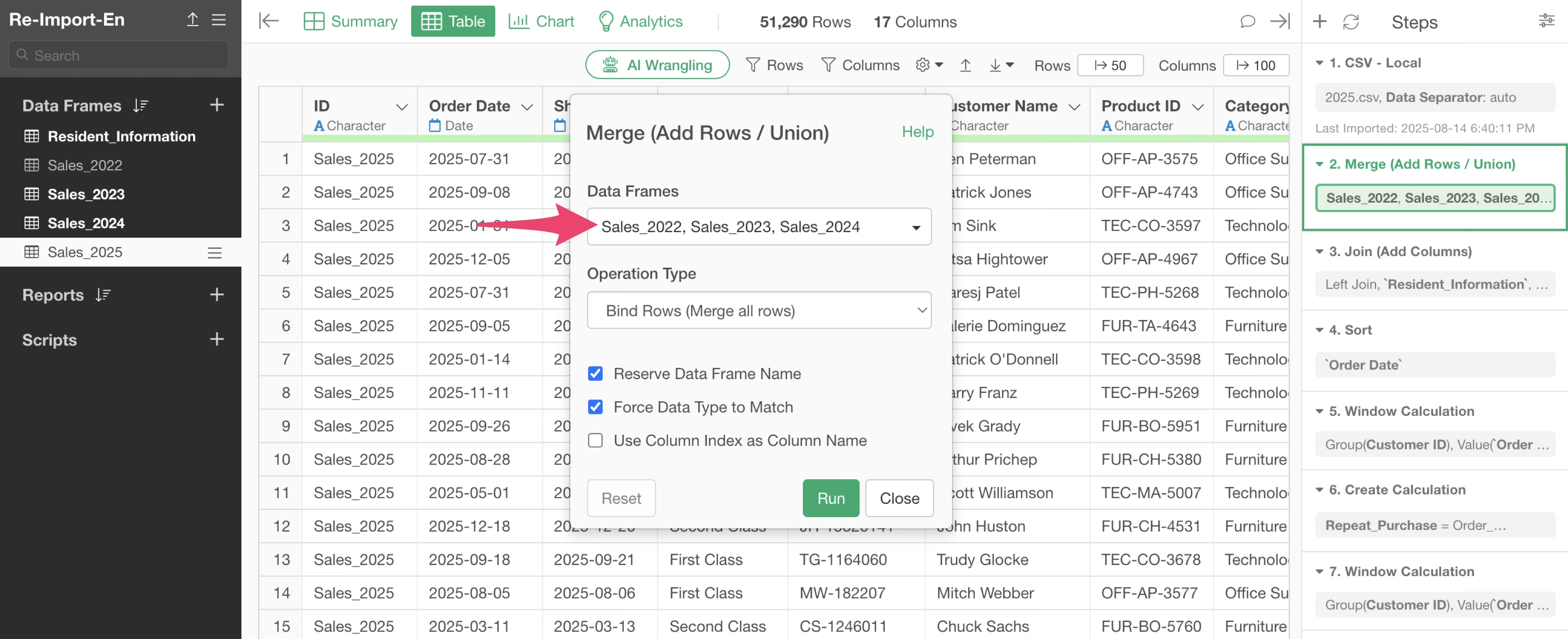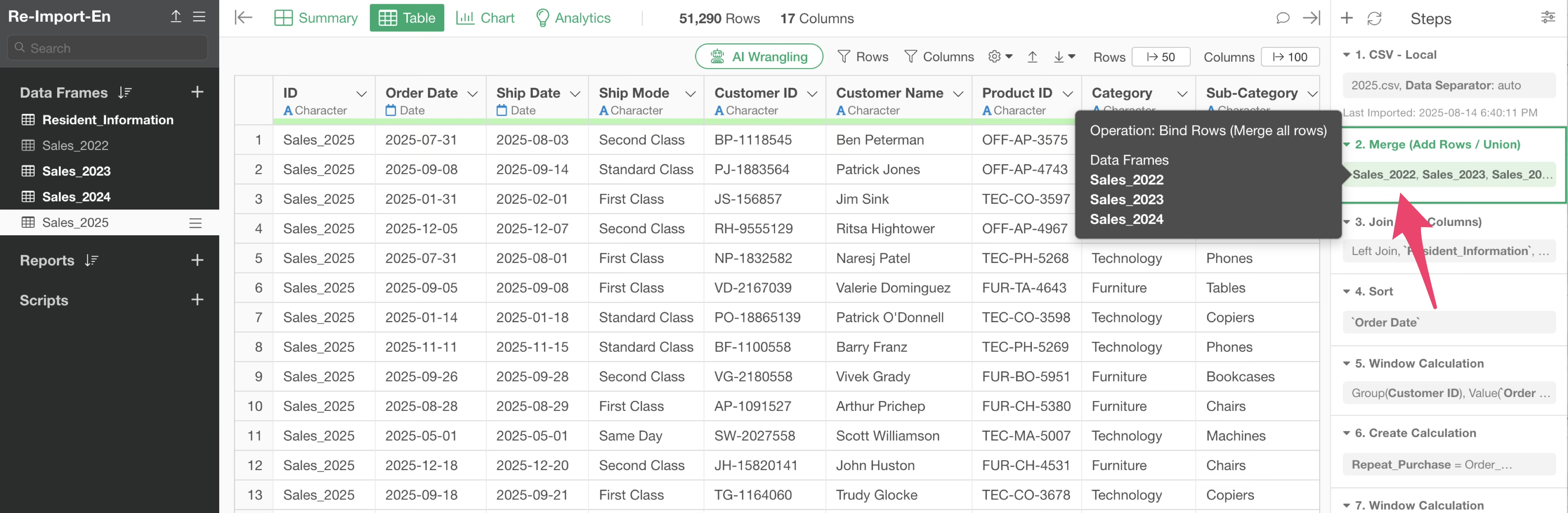 Also, the third step has a column join step that joins customer residential area information from the “Customer Residential Area” data frame.