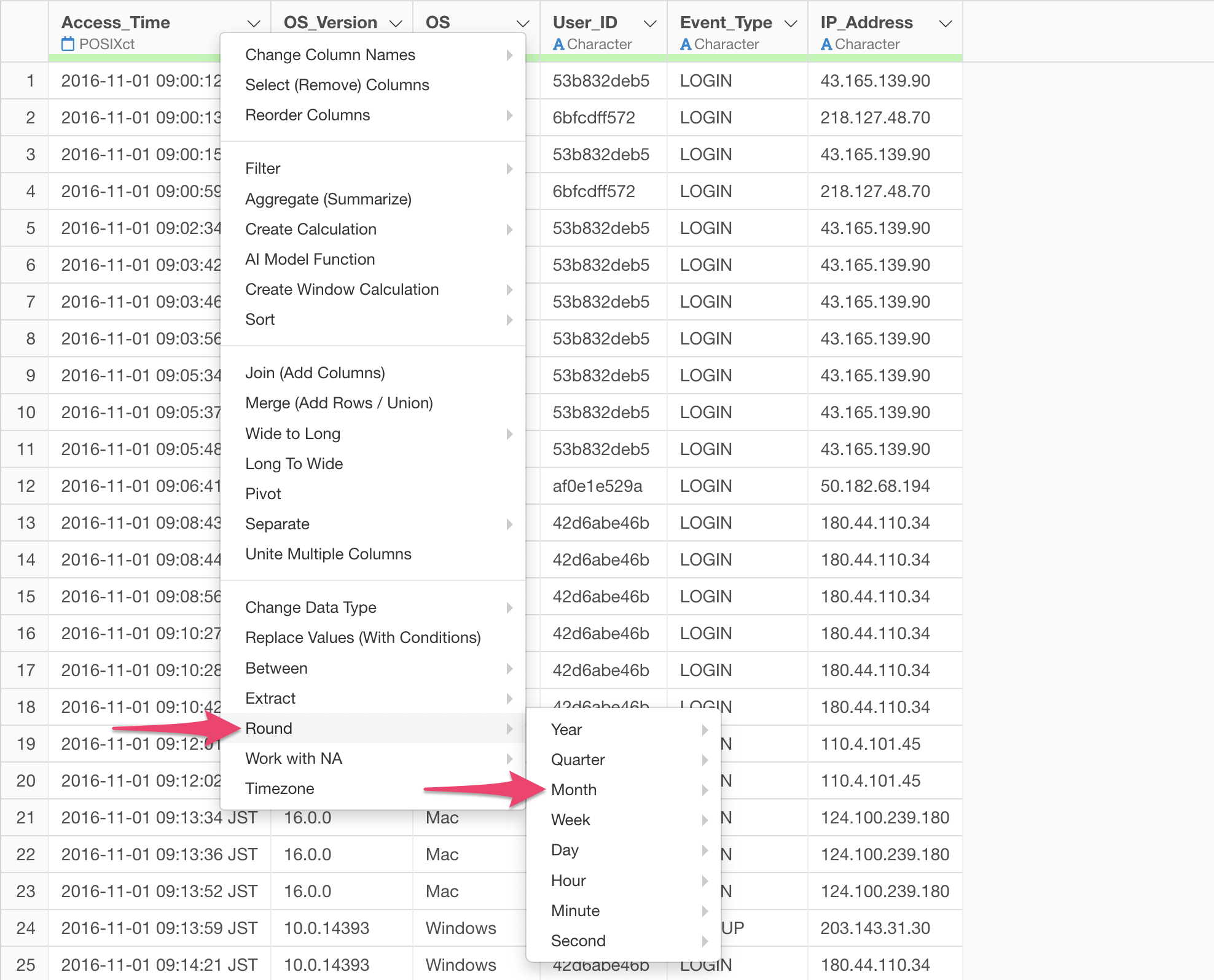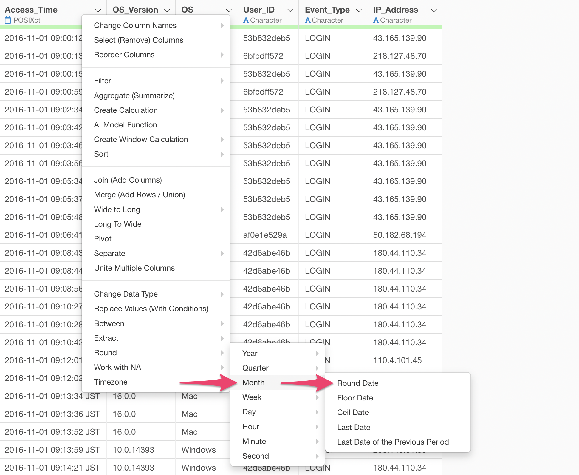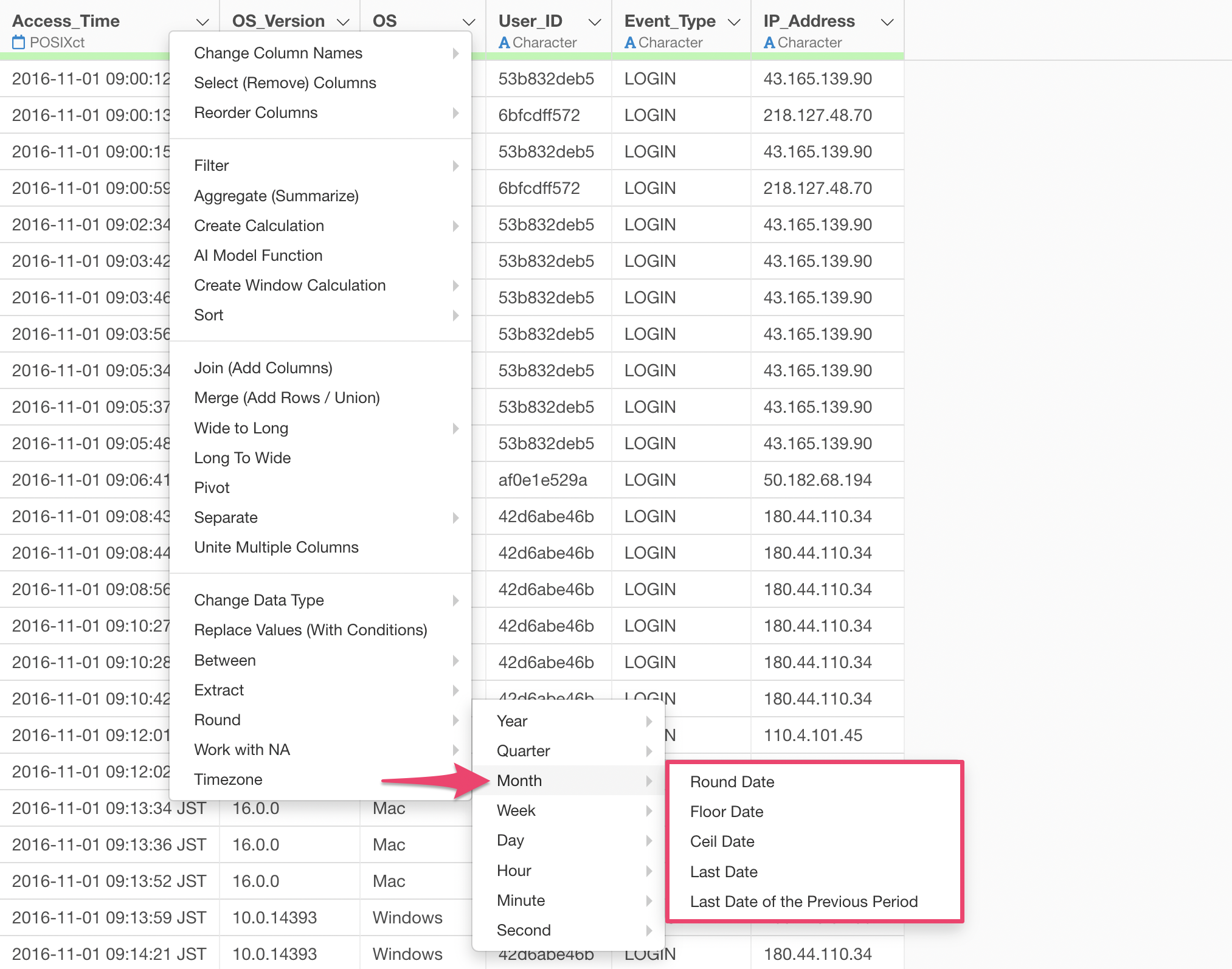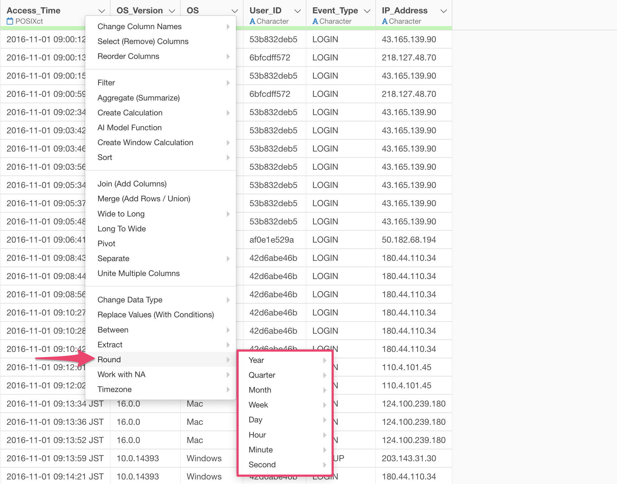 When you select “Rounding” from the Column Header Menu for a Date or POSIXct data type column, a menu appears allowing you to choose the unit of date to apply the rounding to: