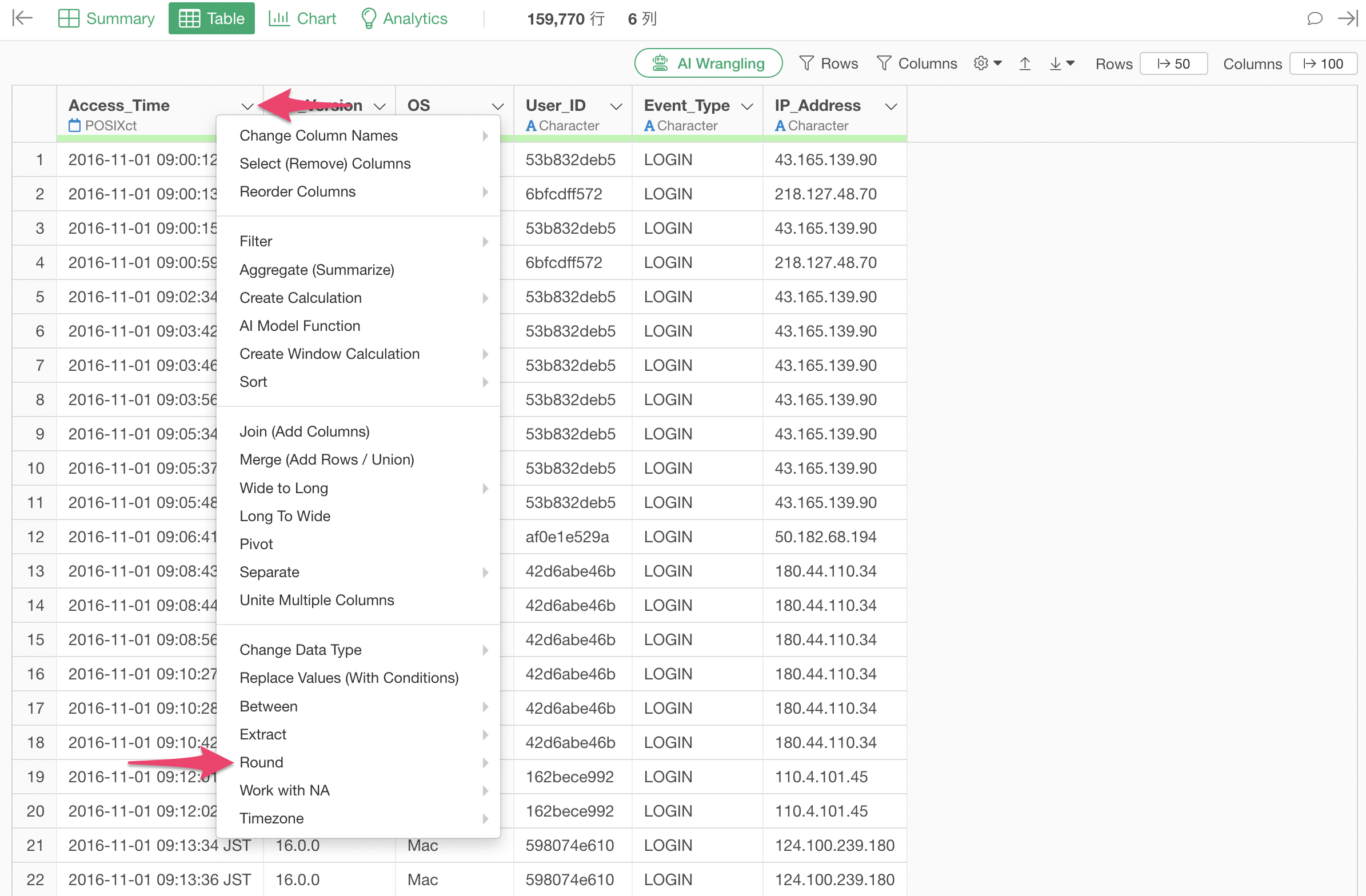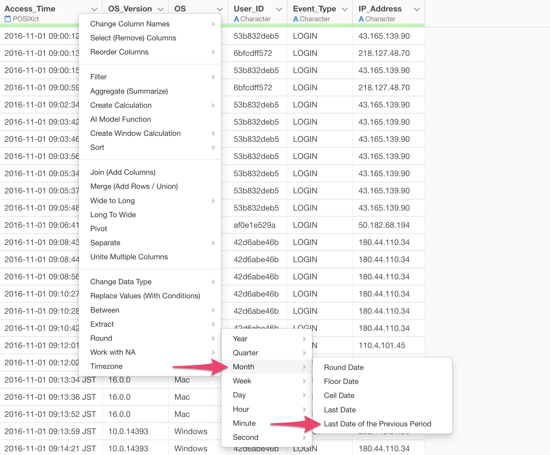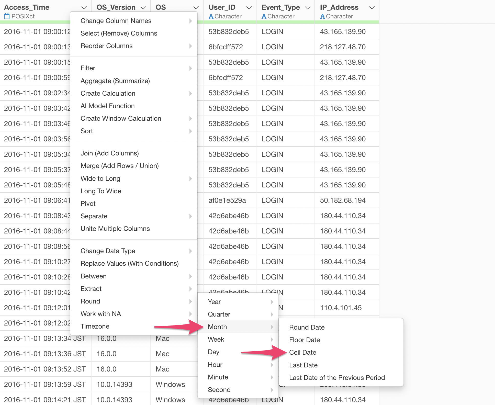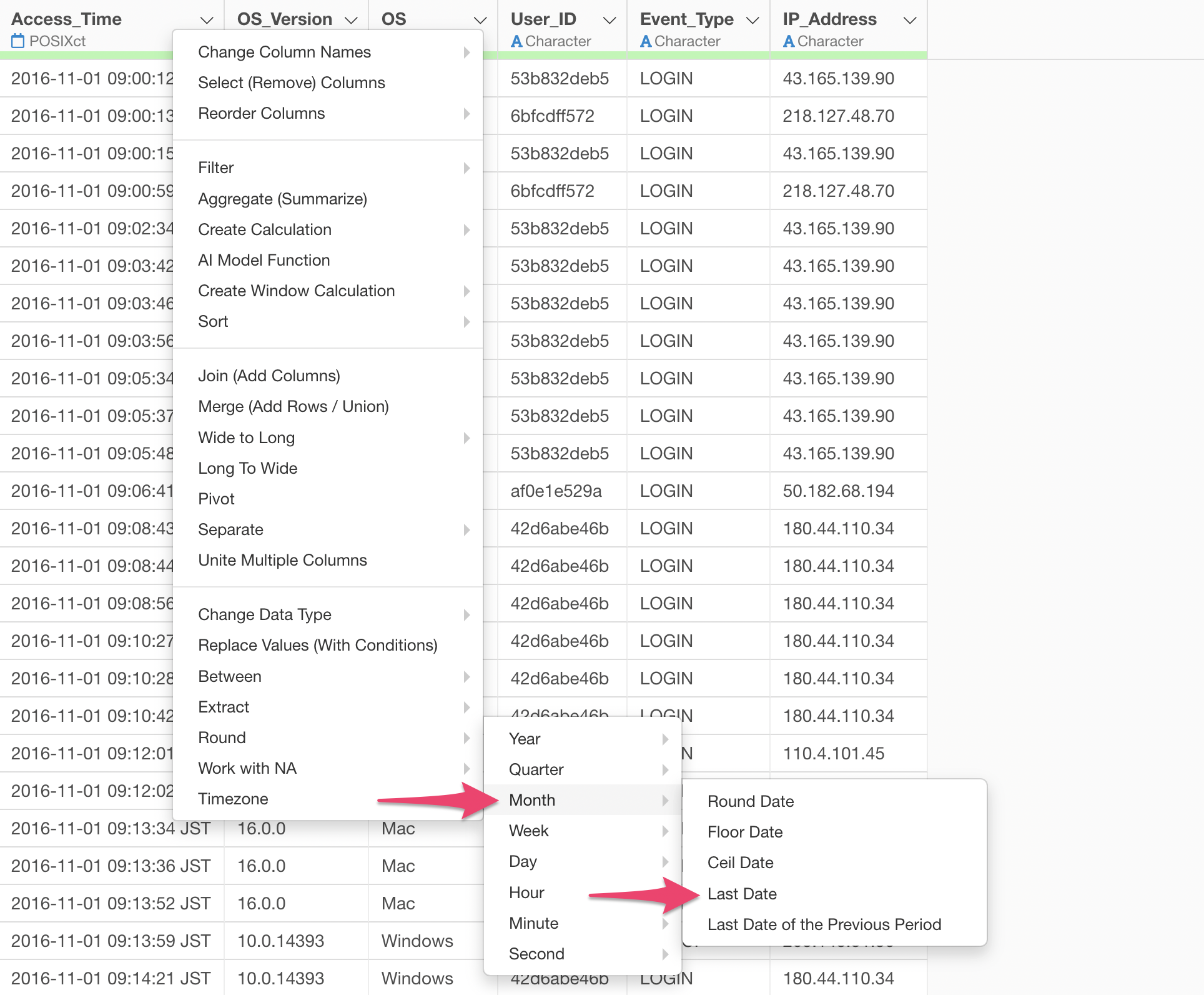 When you select “Rounding” from the Column Header Menu for a Date or POSIXct data type column, a menu appears allowing you to choose the unit of date to apply the rounding to: