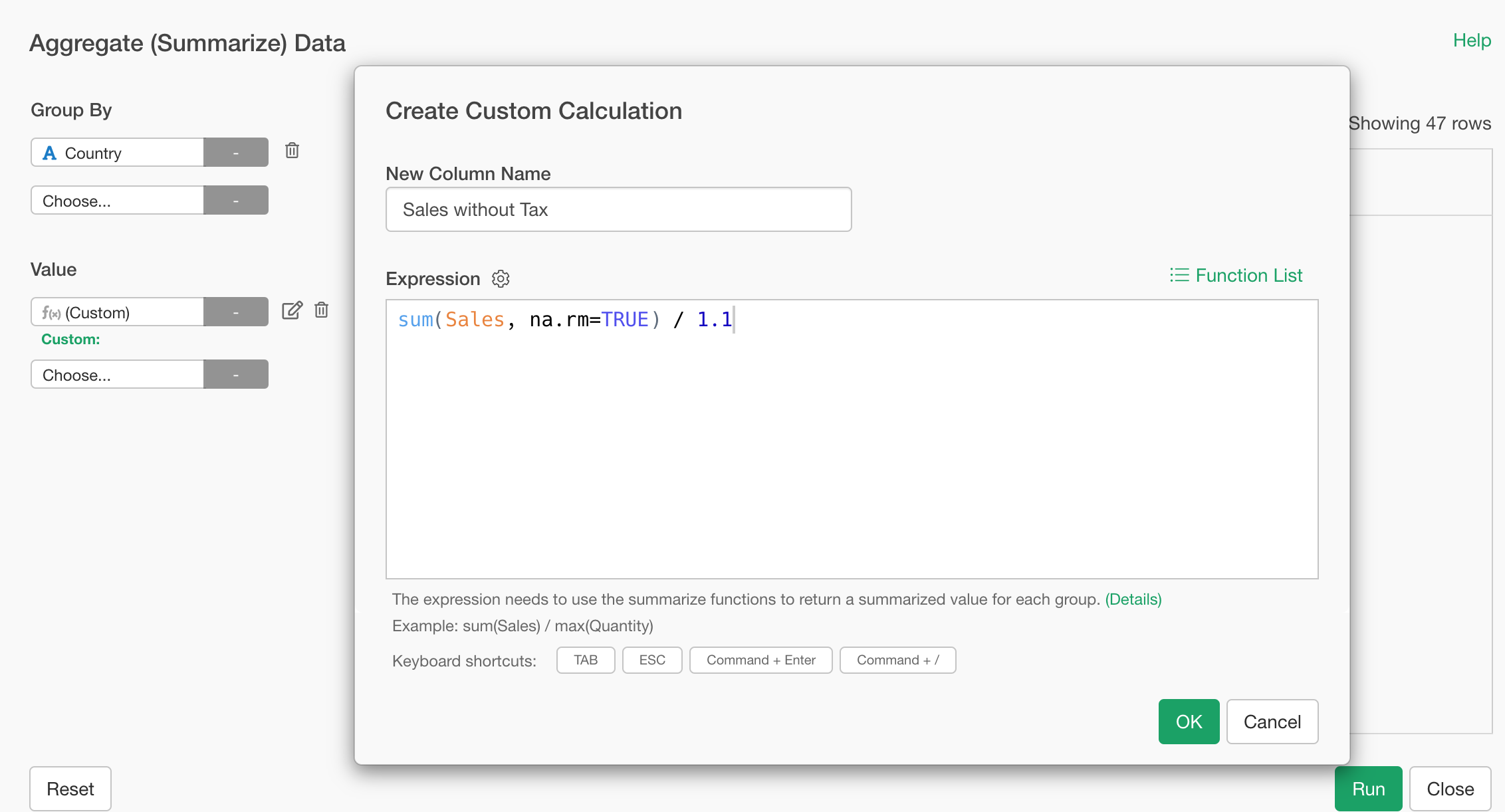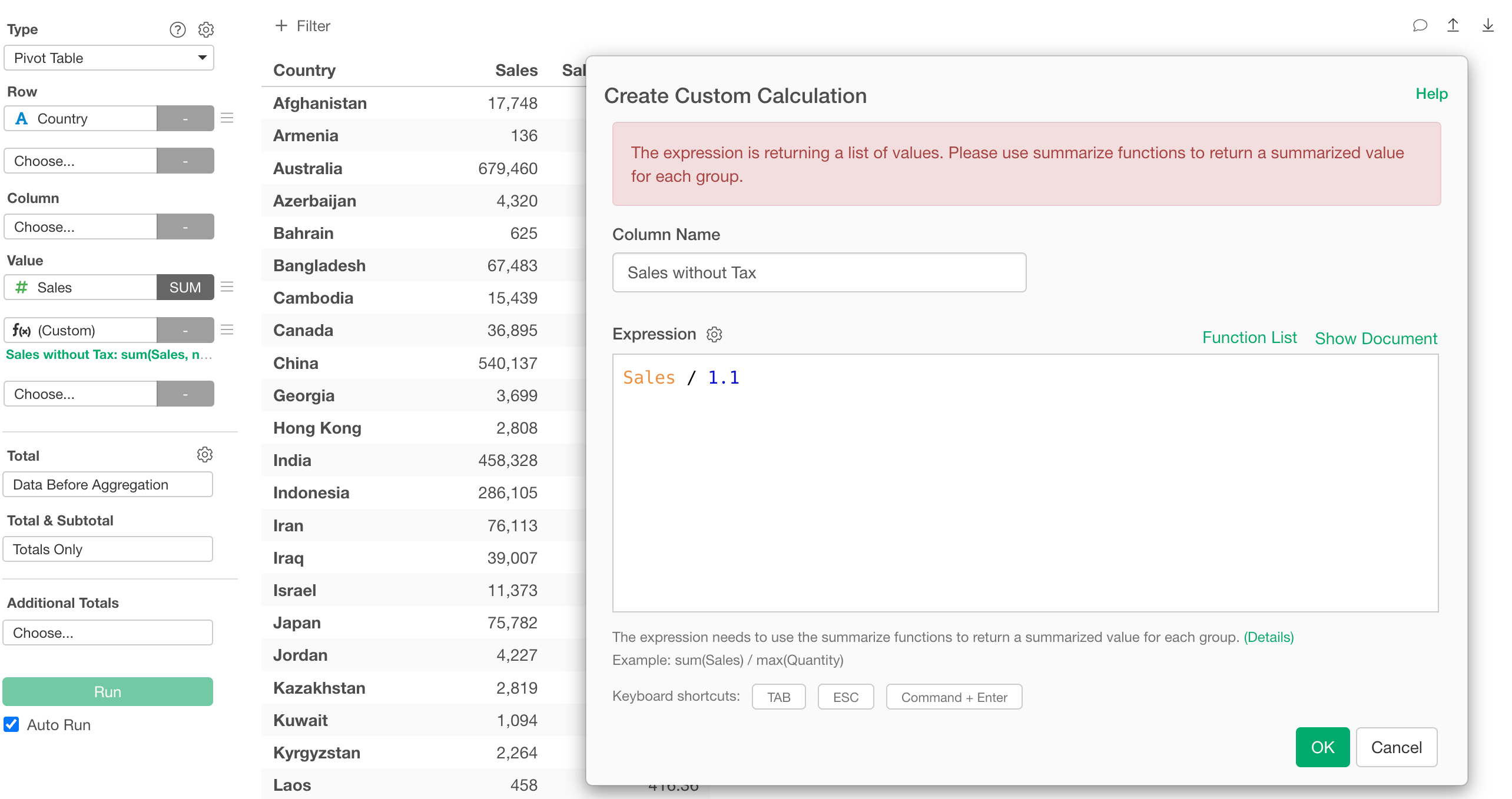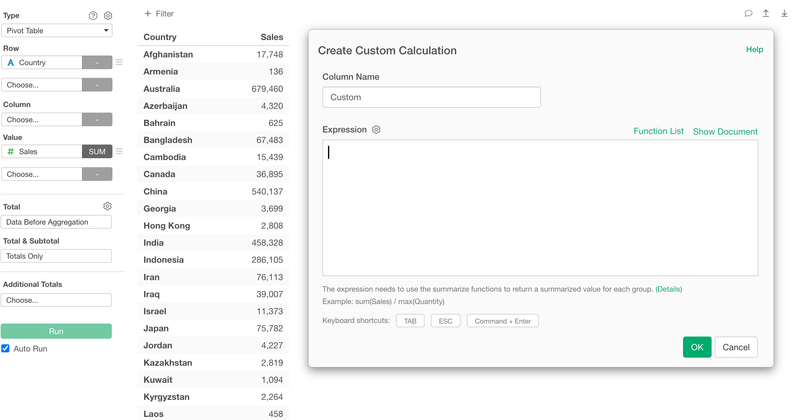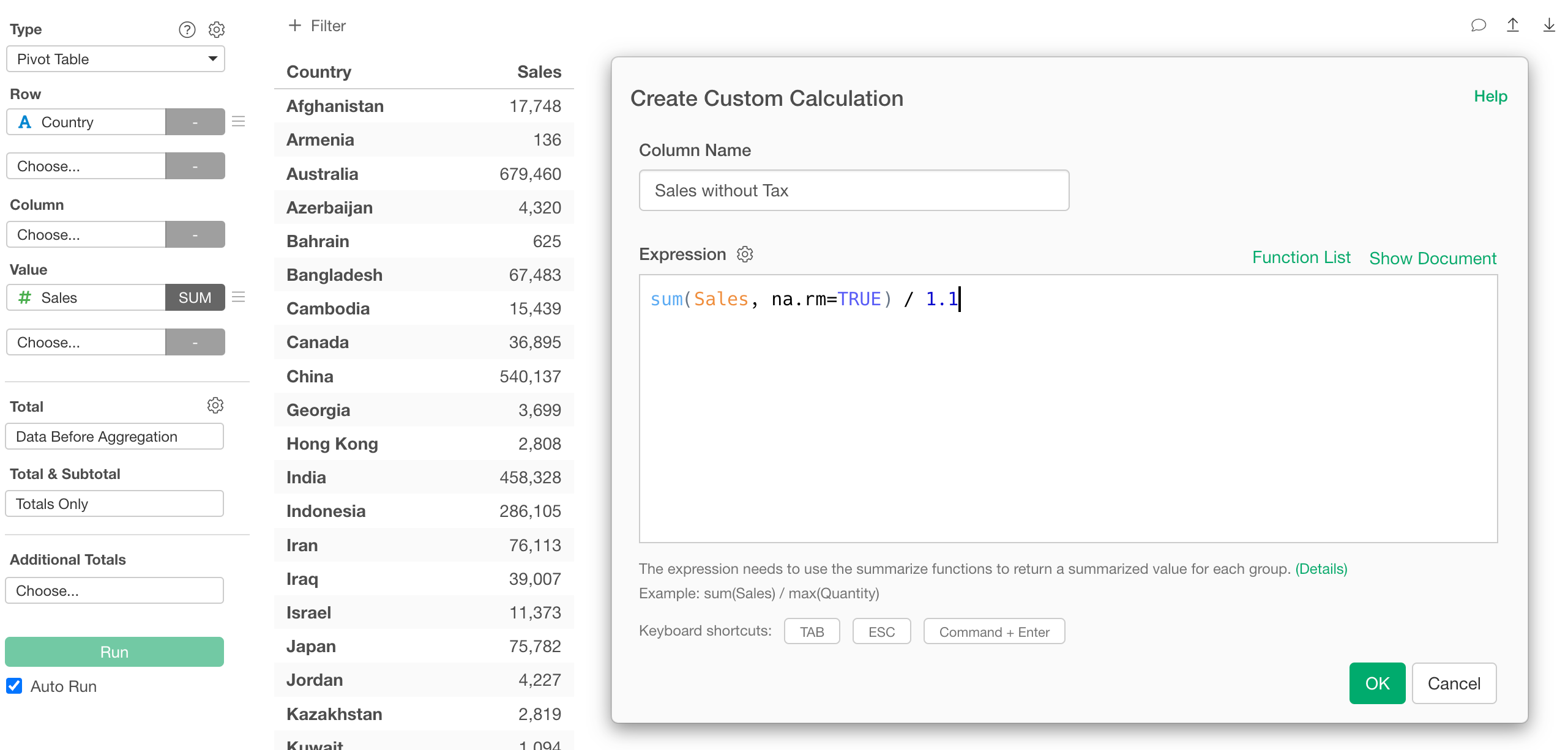 This will display the Custom Calculation dialog, which works the same way as in the chart example above.