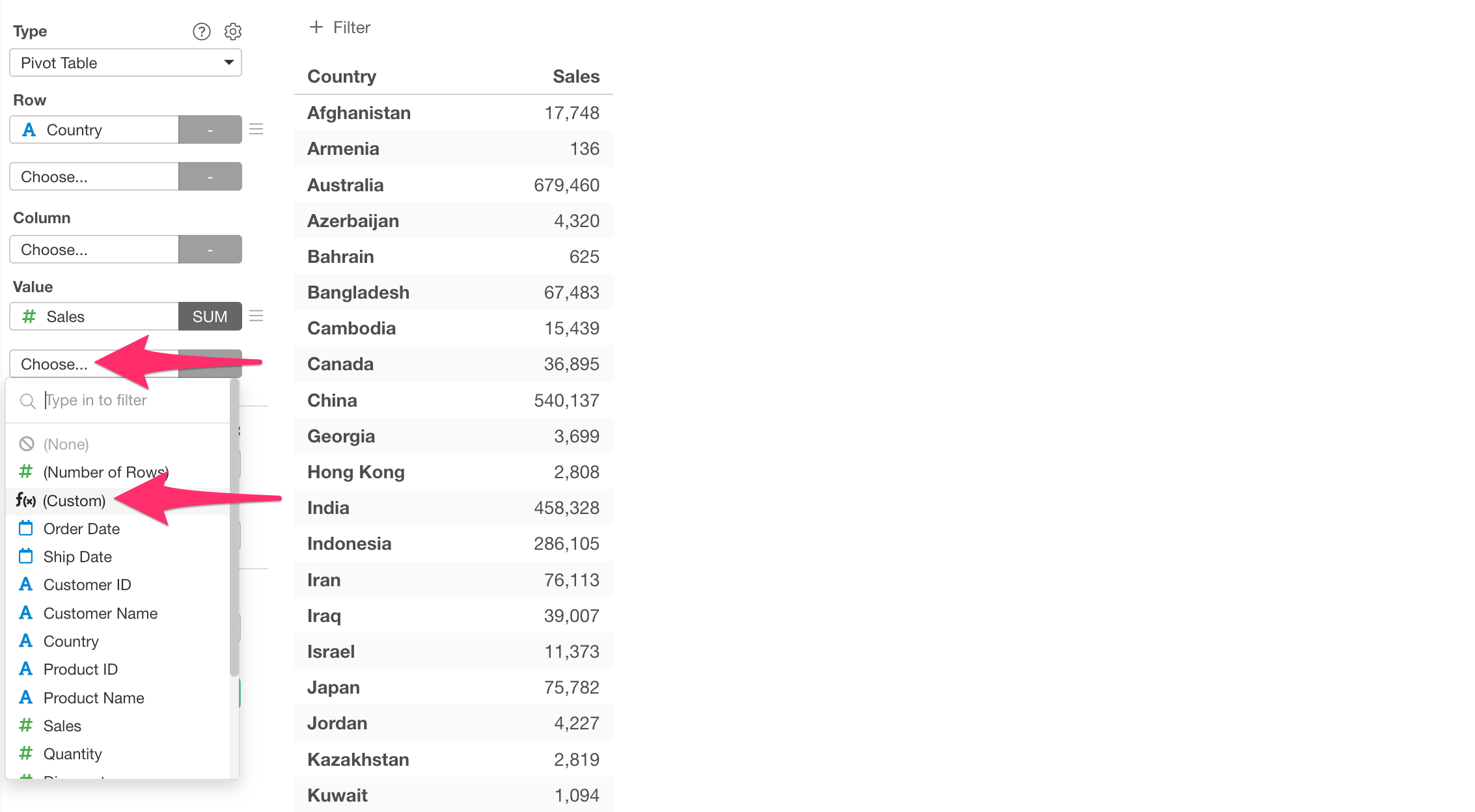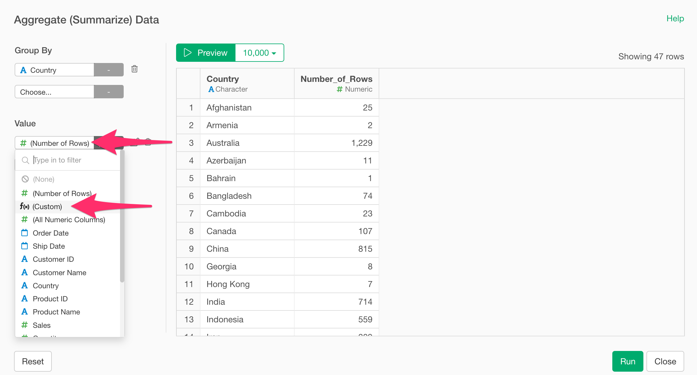 To use a custom calculation in the Summarize dialog, select Custom in place of an actual column under Values.