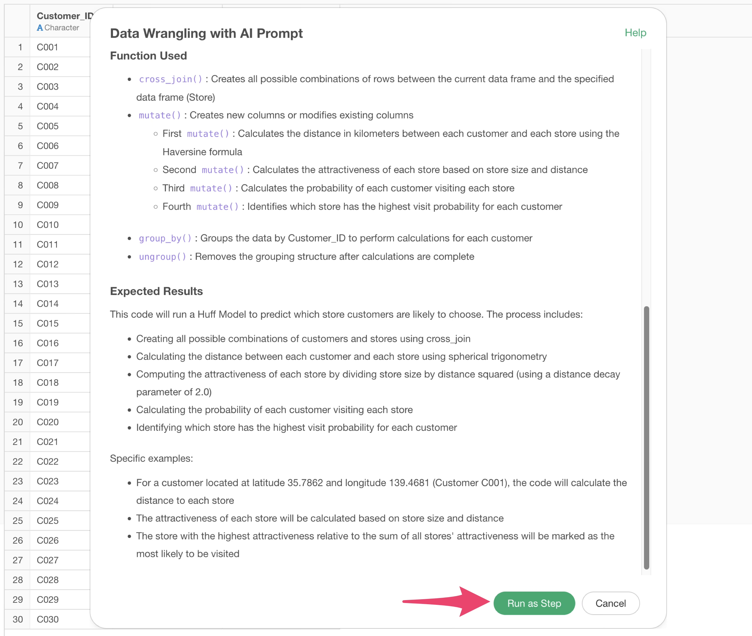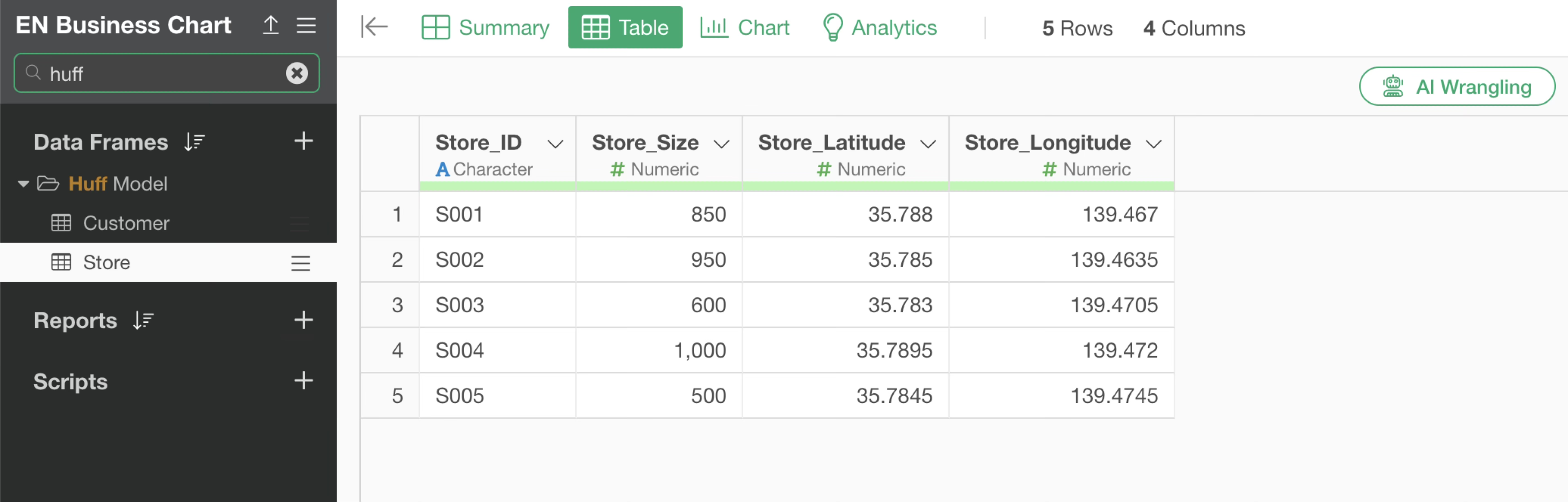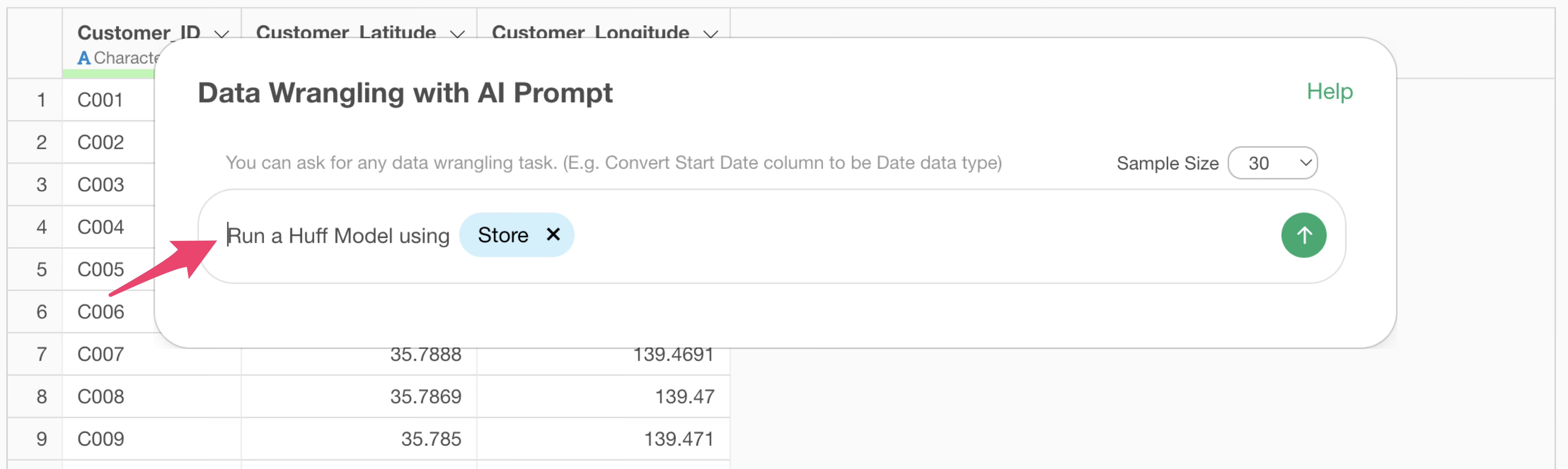 In this example, we will execute a Huff Model analysis using AI prompts with customer and store data. (Customer data can be downloaded here, and store data here.)