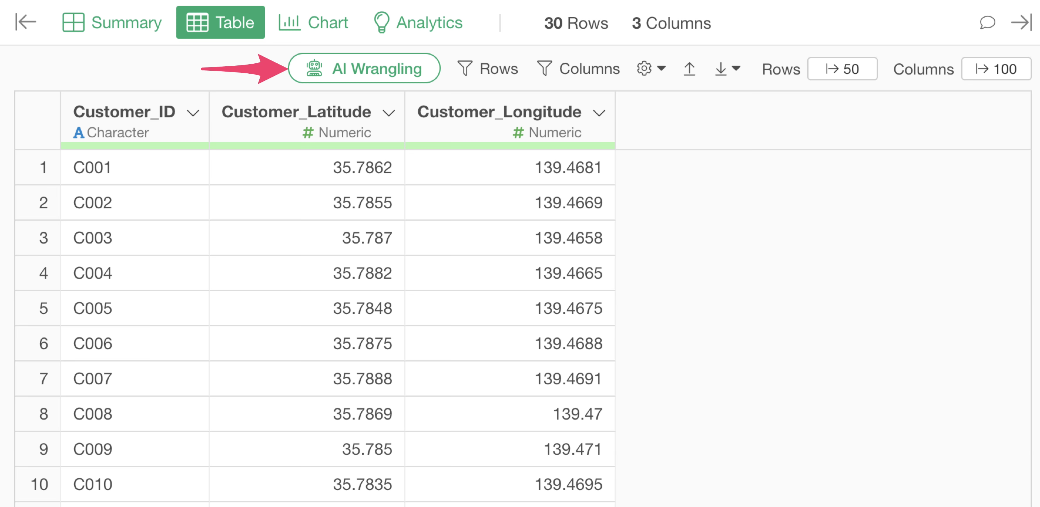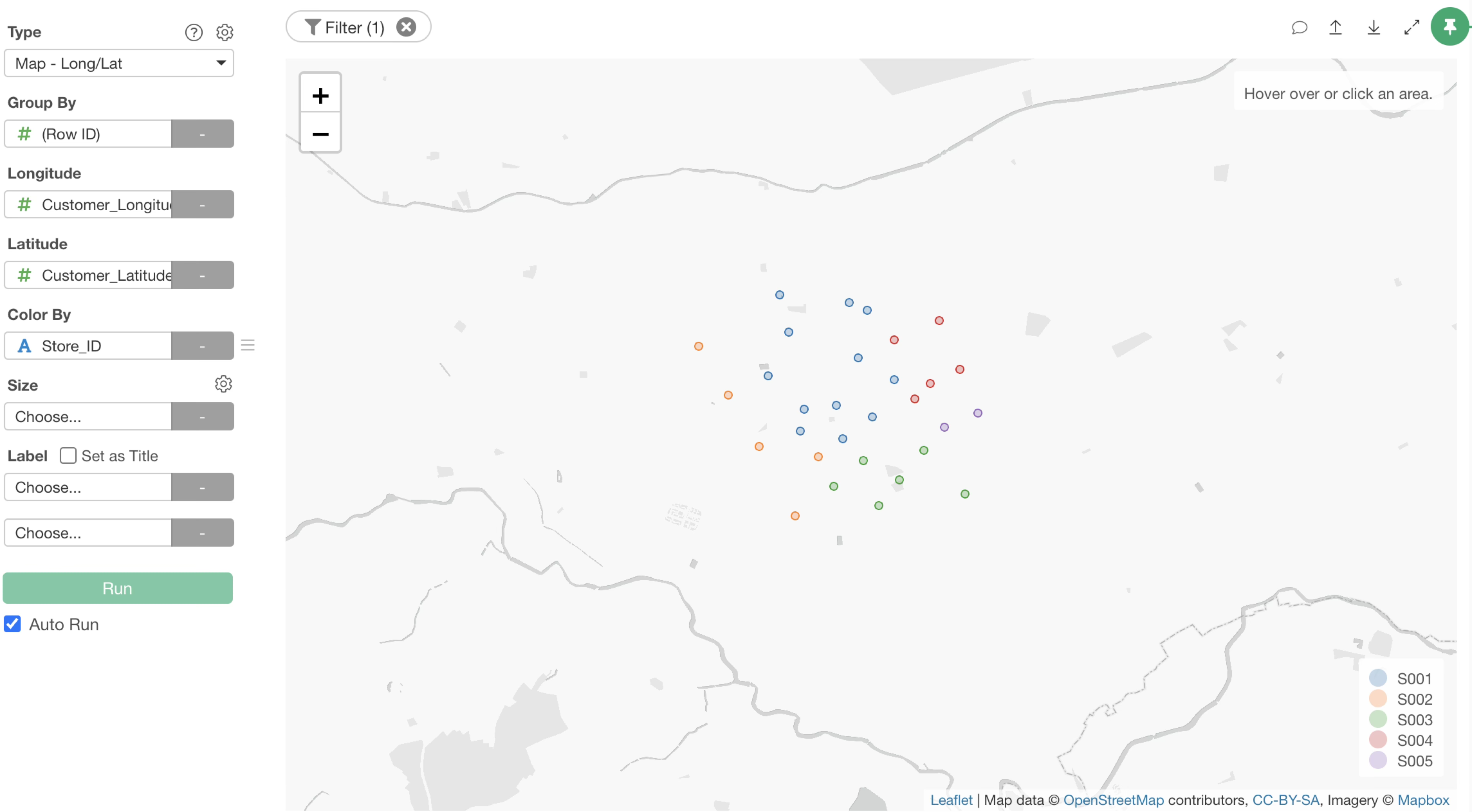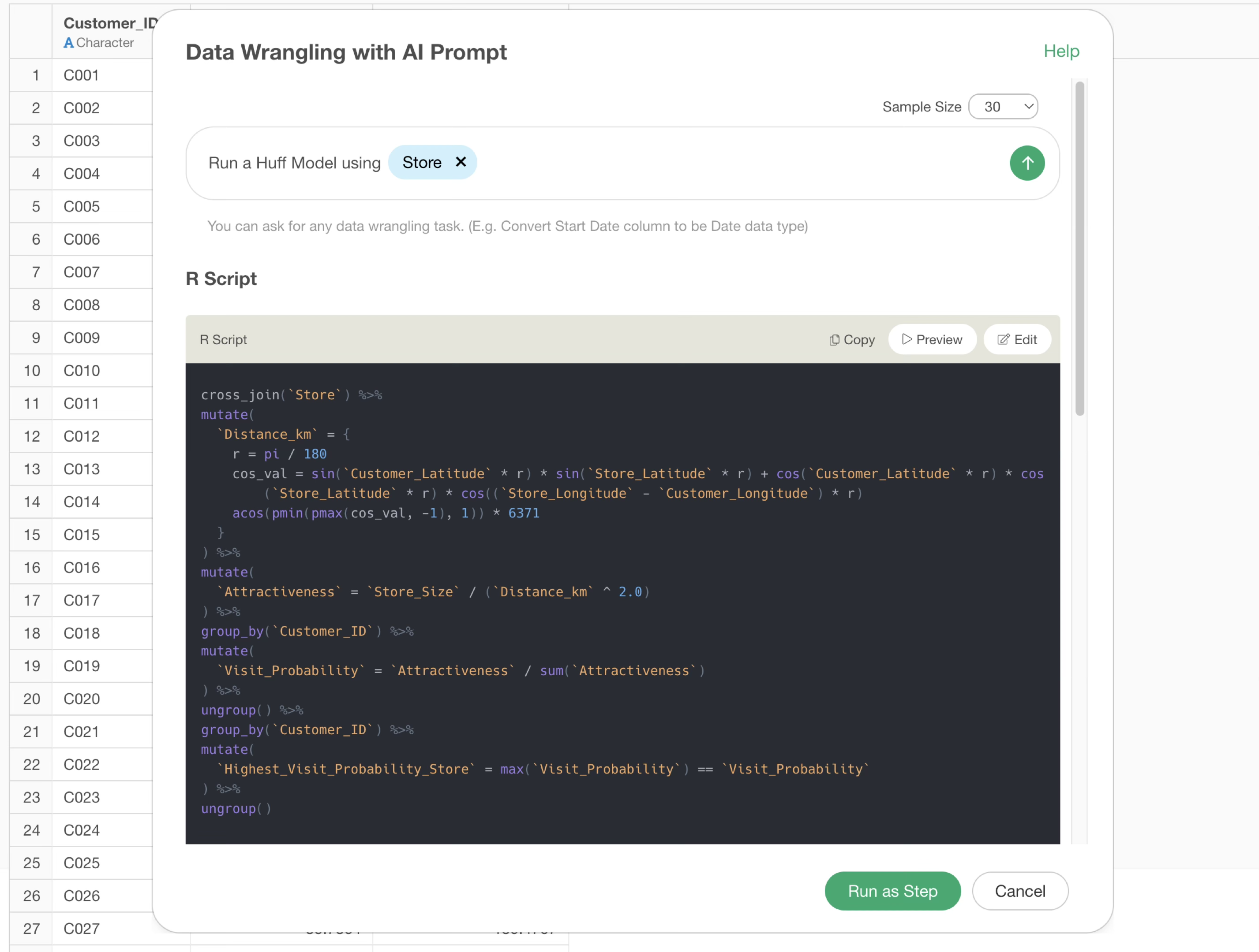 In this example, we will execute a Huff Model analysis using AI prompts with customer and store data. (Customer data can be downloaded here, and store data here.)