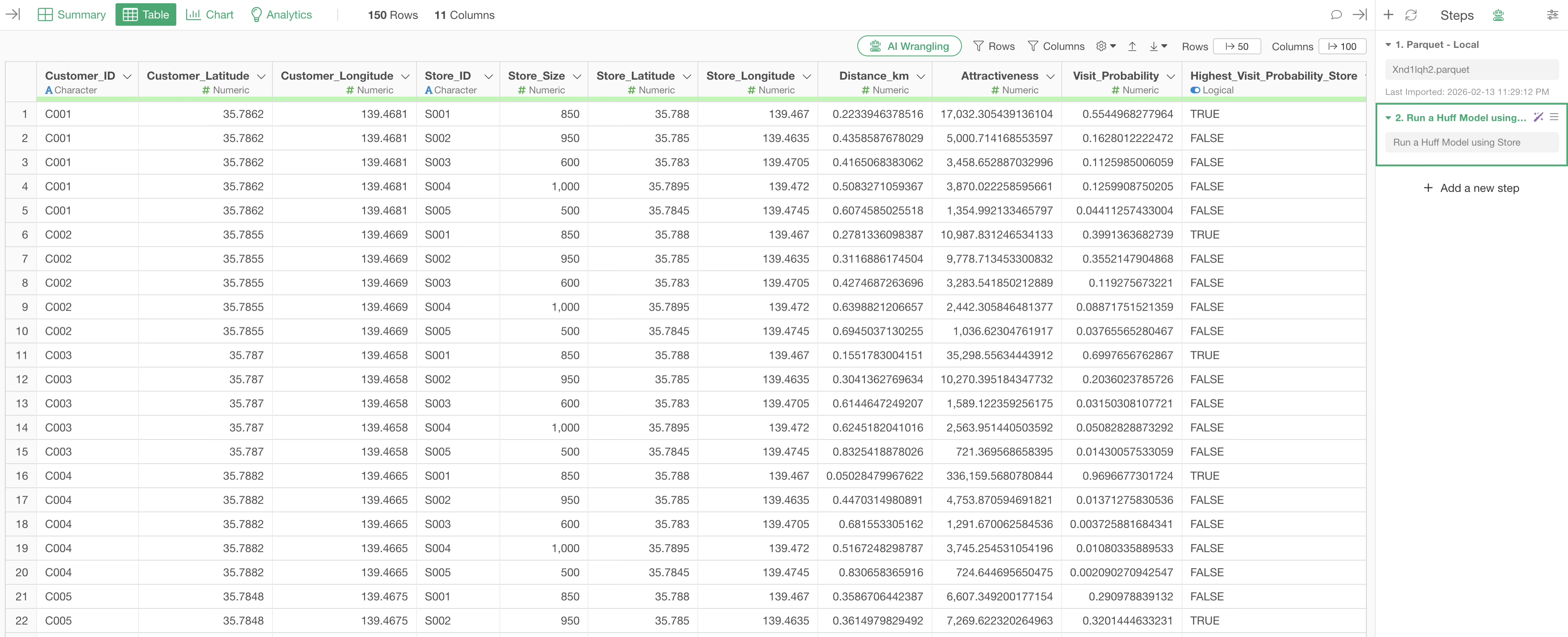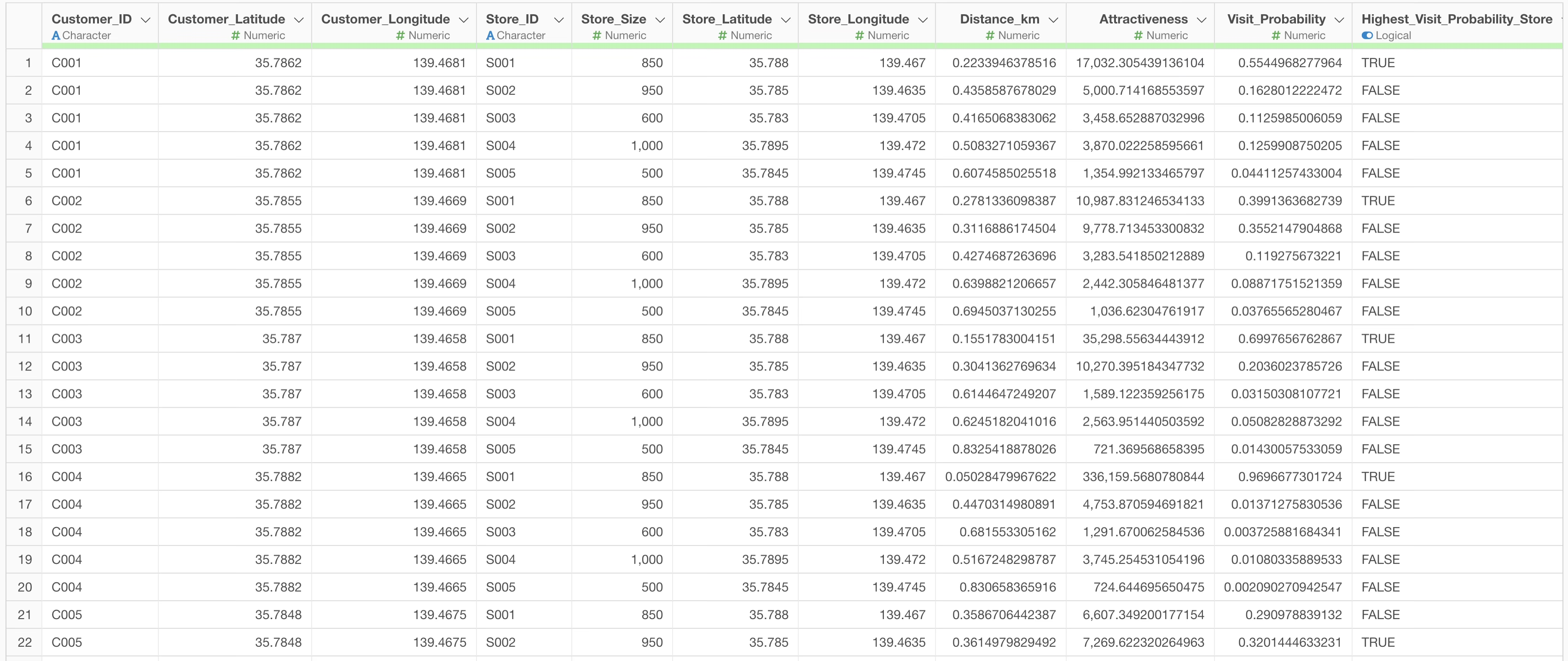 In the resulting data, distance, attractiveness, and visit probability are calculated for each combination of customer and store. Additionally, the store with the highest visit probability for each customer is identified.