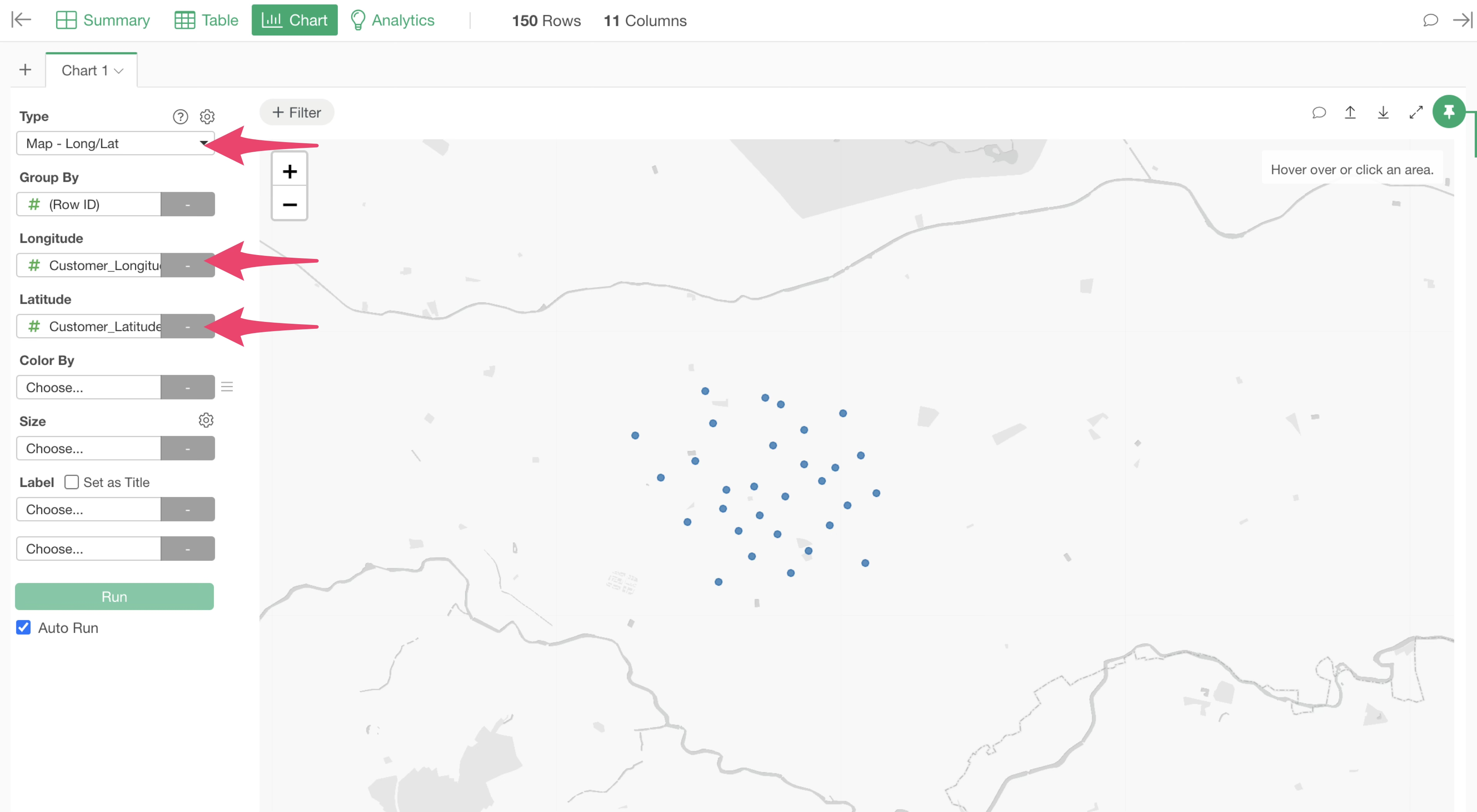 Go to the Chart view, select “Map - Latitude/Longitude” as the type, and select the customer’s longitude for Longitude and the customer’s latitude for Latitude.