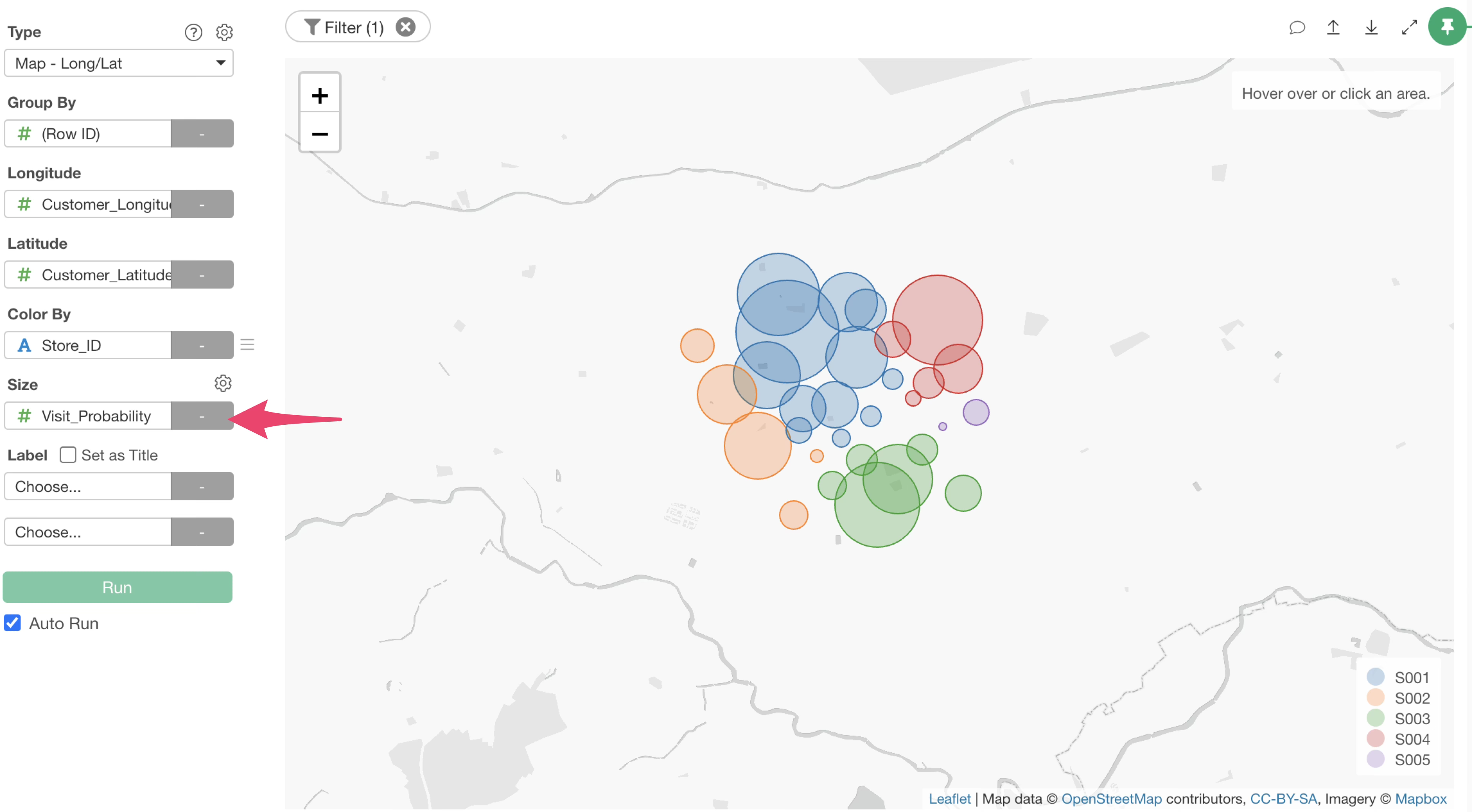 Finally, by selecting “Visit Probability” for Size, you can visualize the store with the highest visit probability for each customer along with the magnitude of that probability.