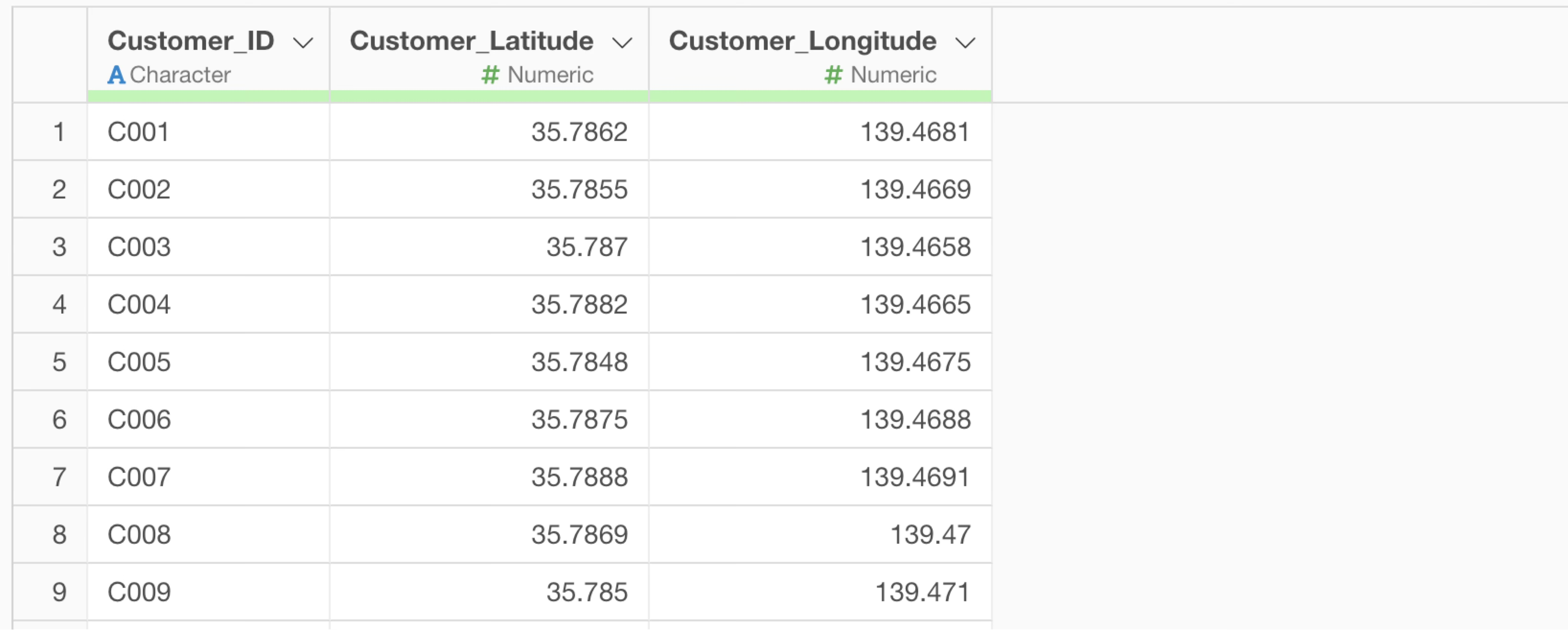 The customer data includes Customer ID and customer location information (Latitude/Longitude).