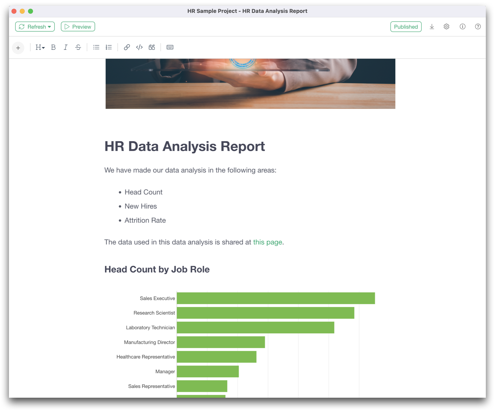 Insights obtained from charts and analytics in Exploratory can be quickly summarized in “Note” and shared interactively with others.