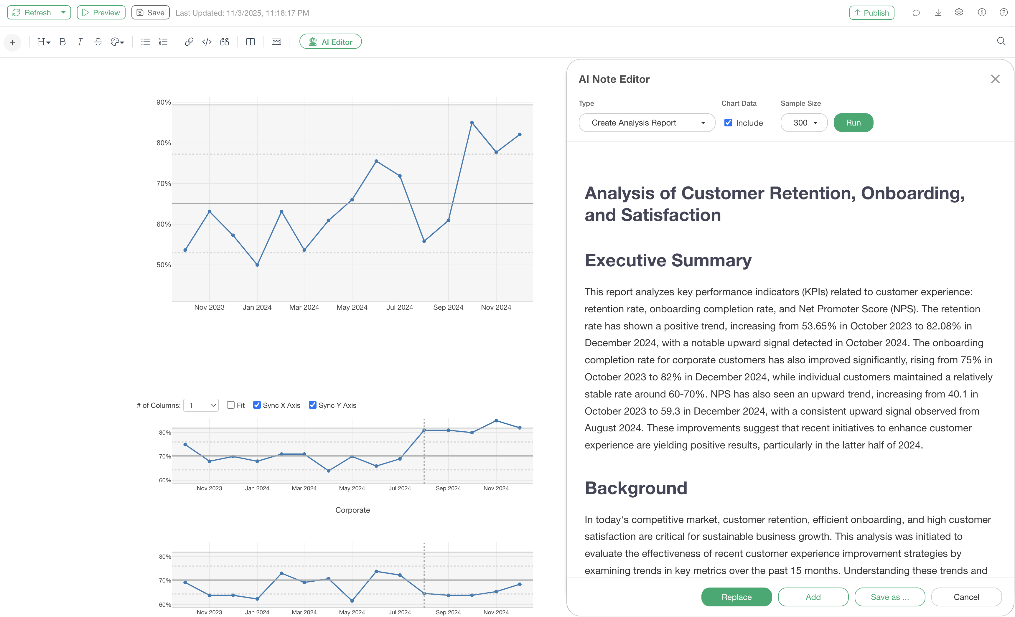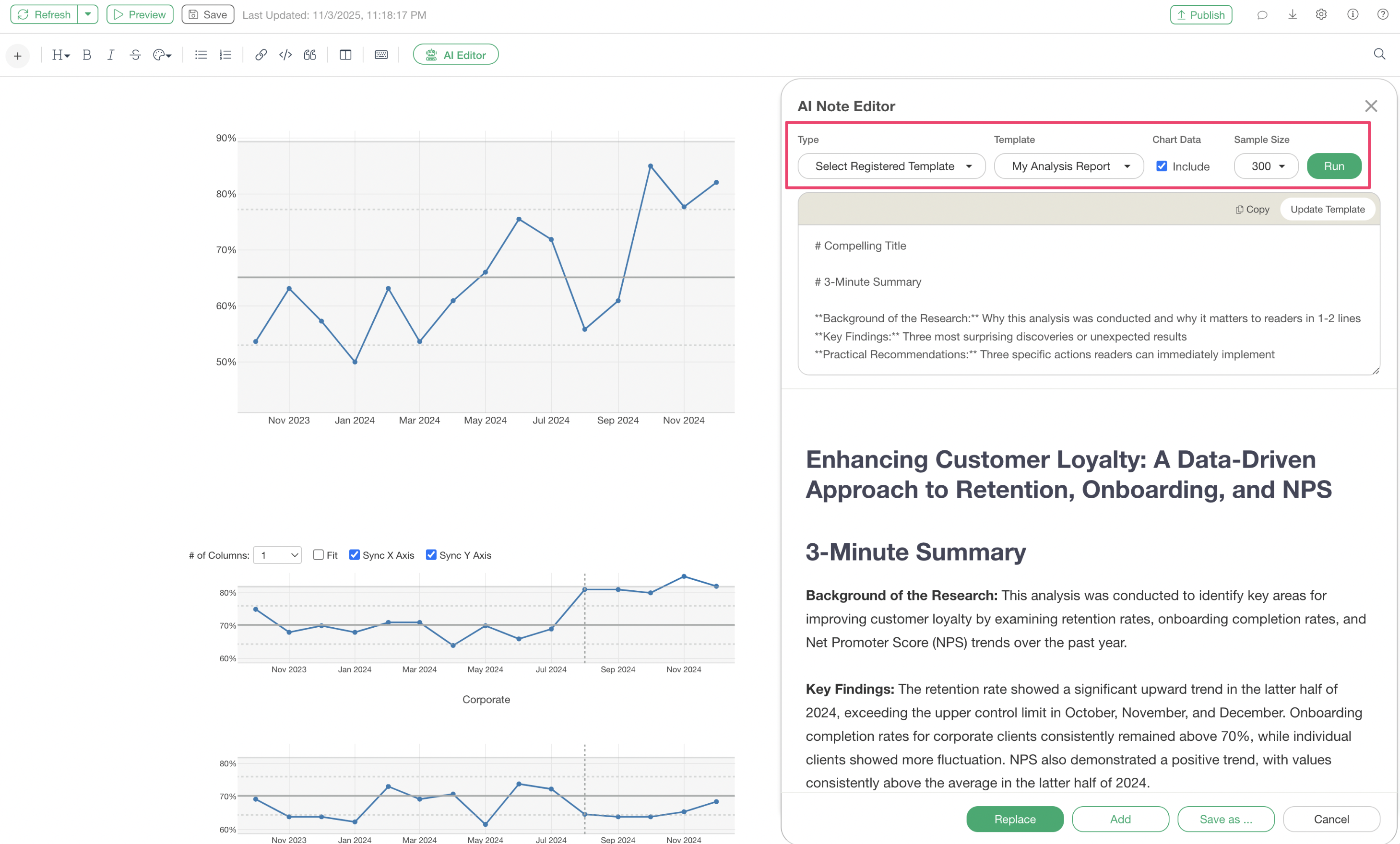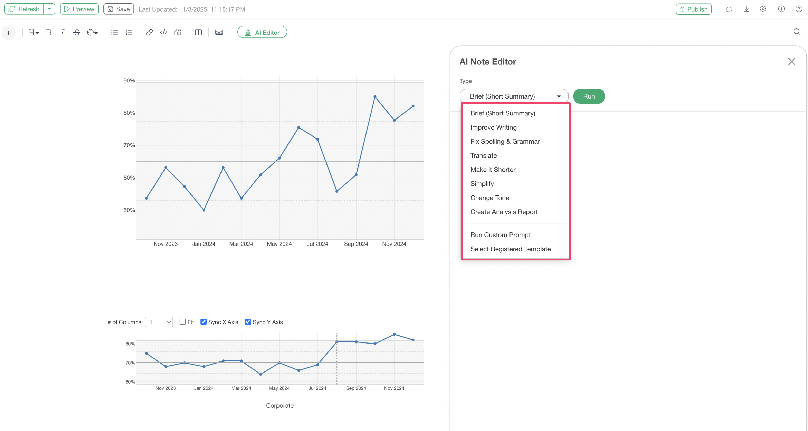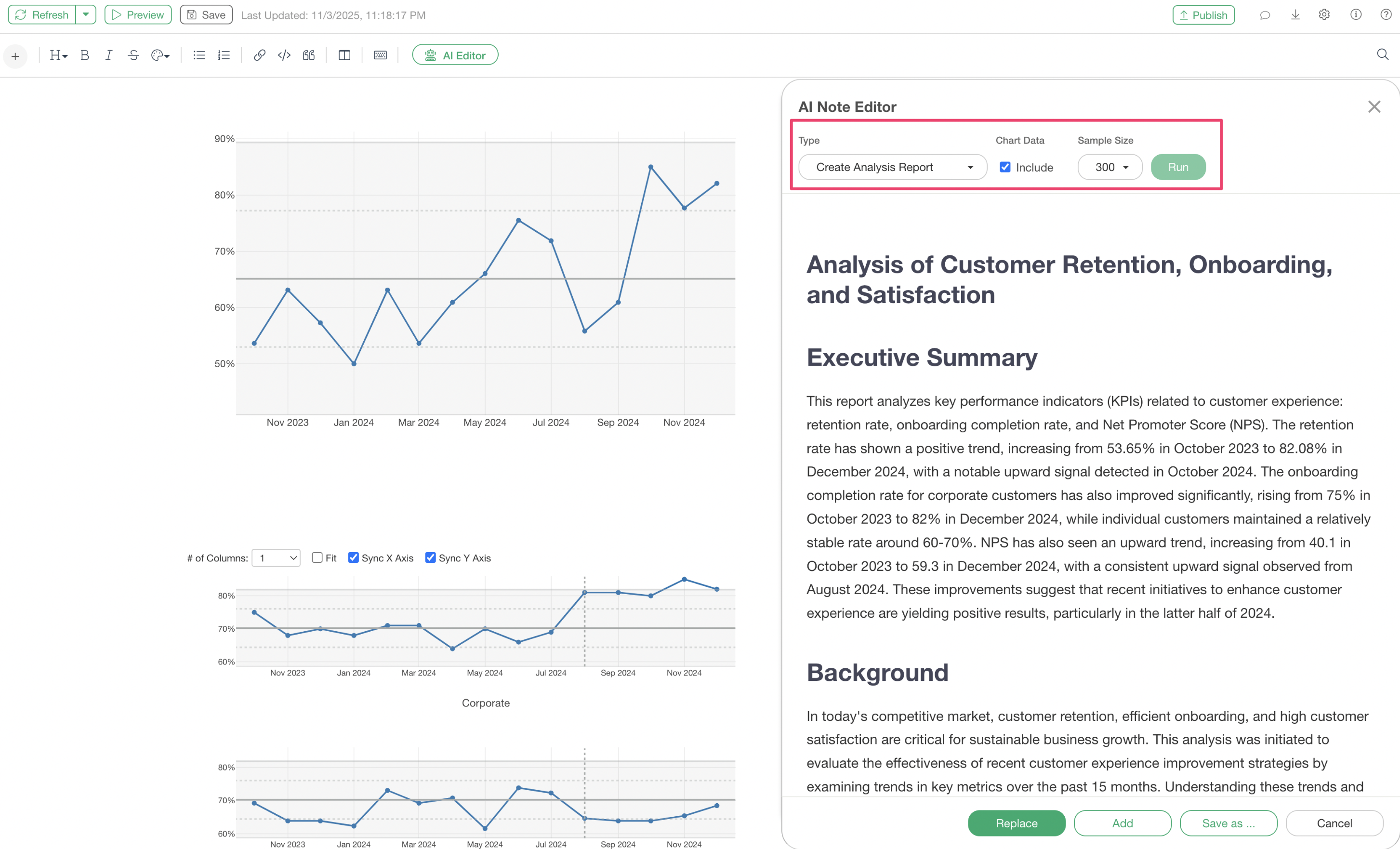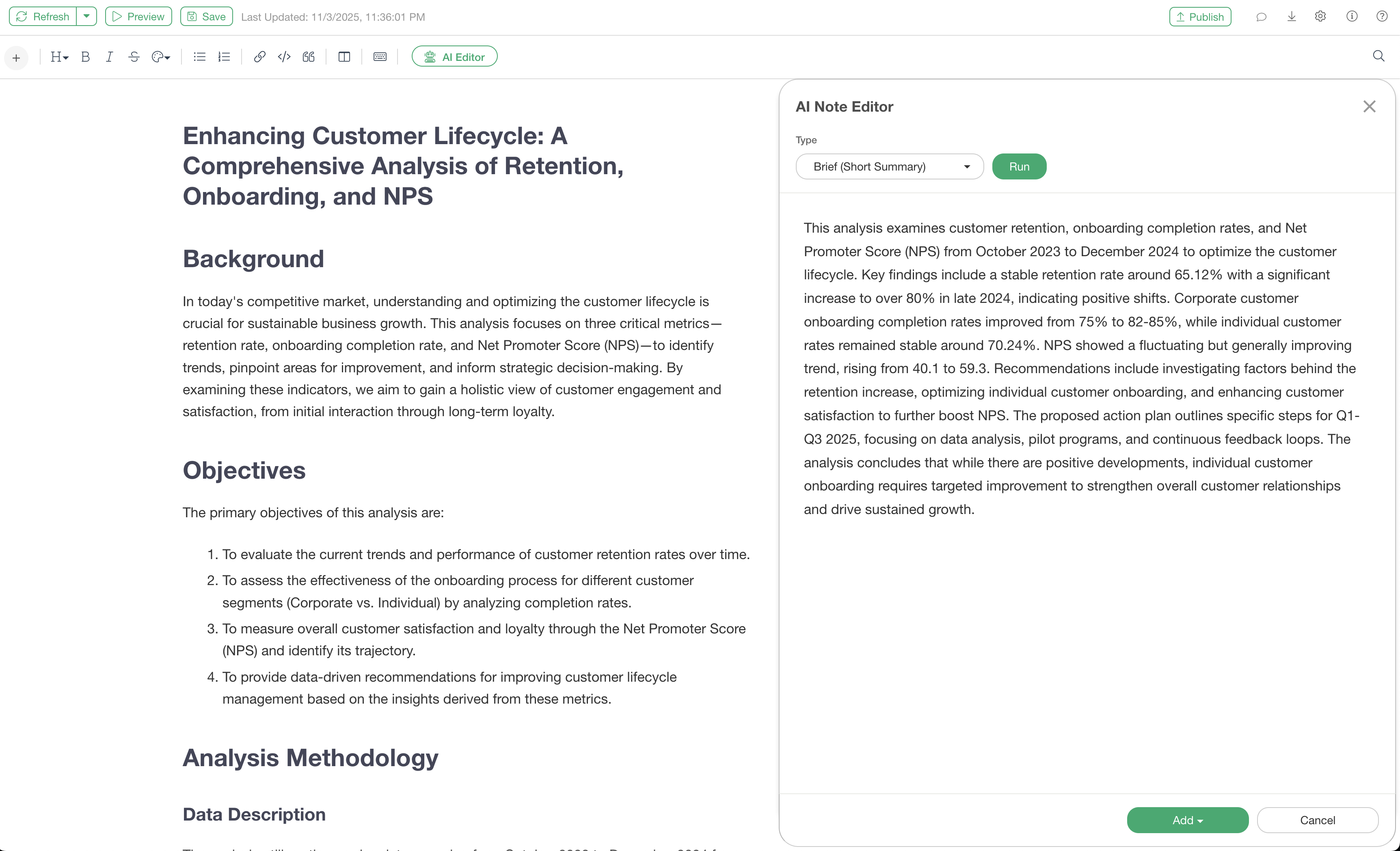 Experience the efficiency of report creation in data analysis through new features like the AI Note Editor.