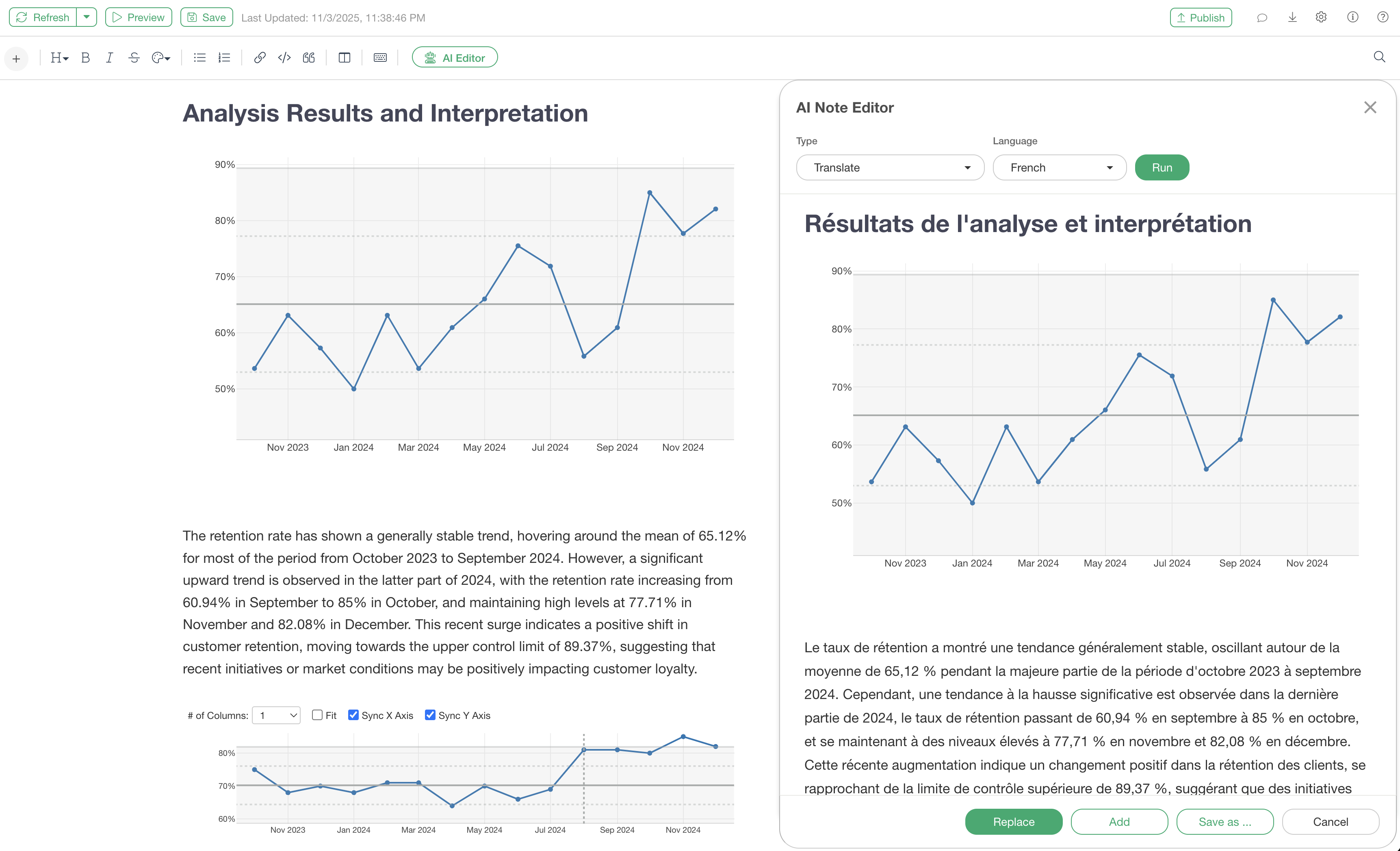 When documents need to be created in multiple languages, such as English or French, users typically have to move to another tool for translation and then bring it back to Exploratory. This back-and-forth process is inefficient and carries the risk of format disruption for charts, formulas, and other elements.