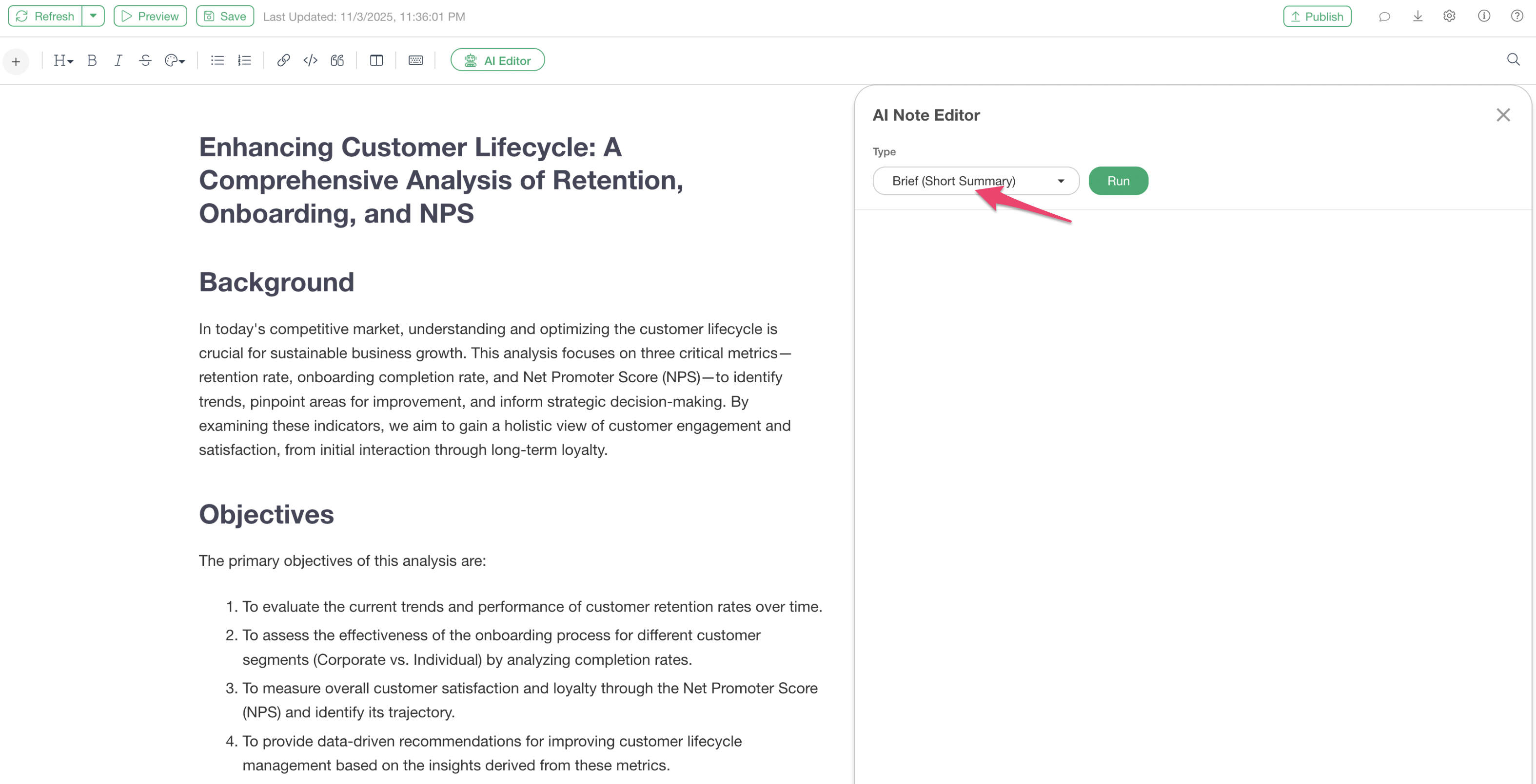 “Create Analysis Report” is one of the most powerful features of the AI Note Editor.