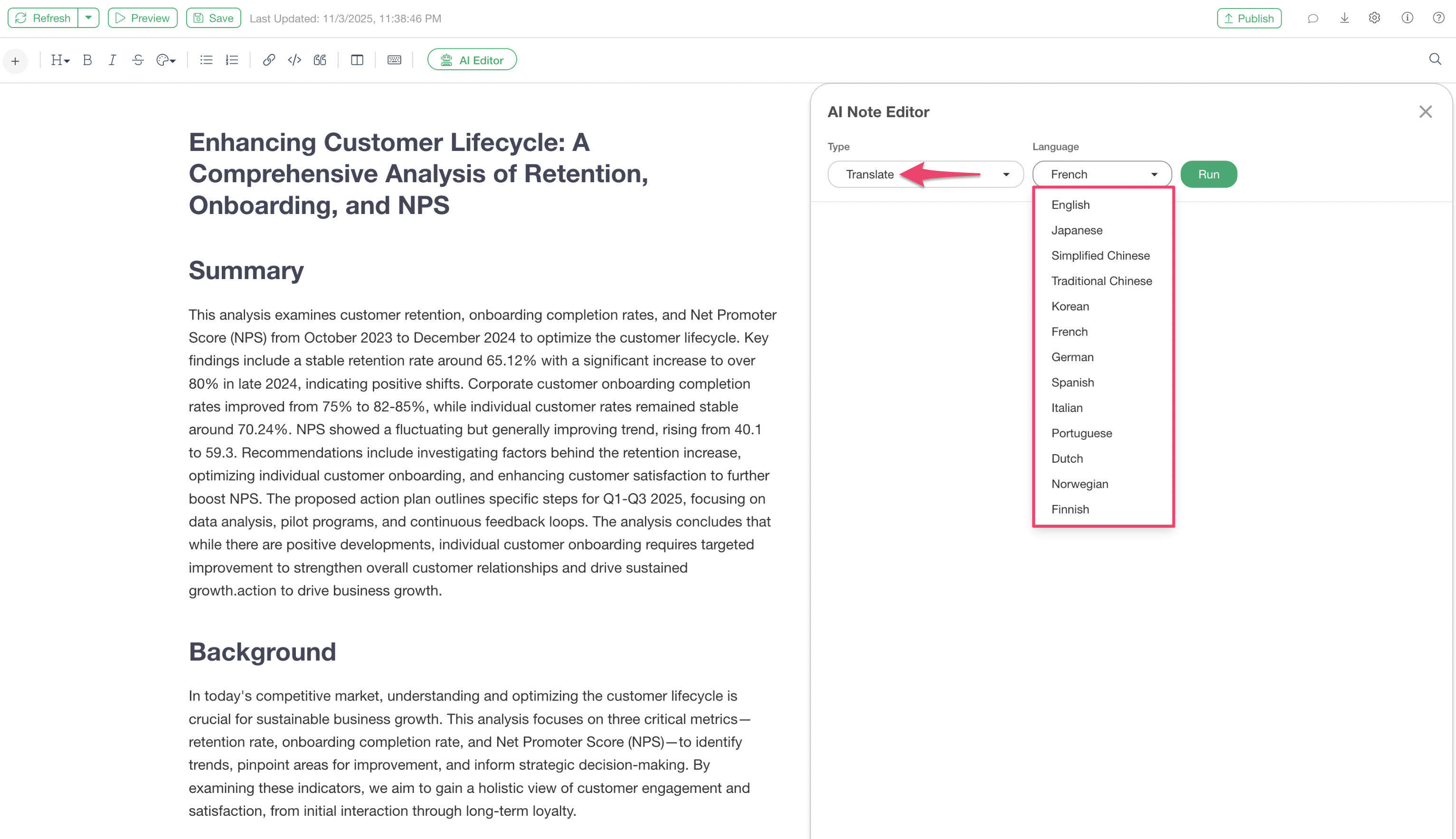 For example, if you want to publish a note created in English as an French or Japanese version, traditionally you would have to translate it using another tool and then bring it back to Exploratory. With the AI Note Editor, this can be done with a single click.