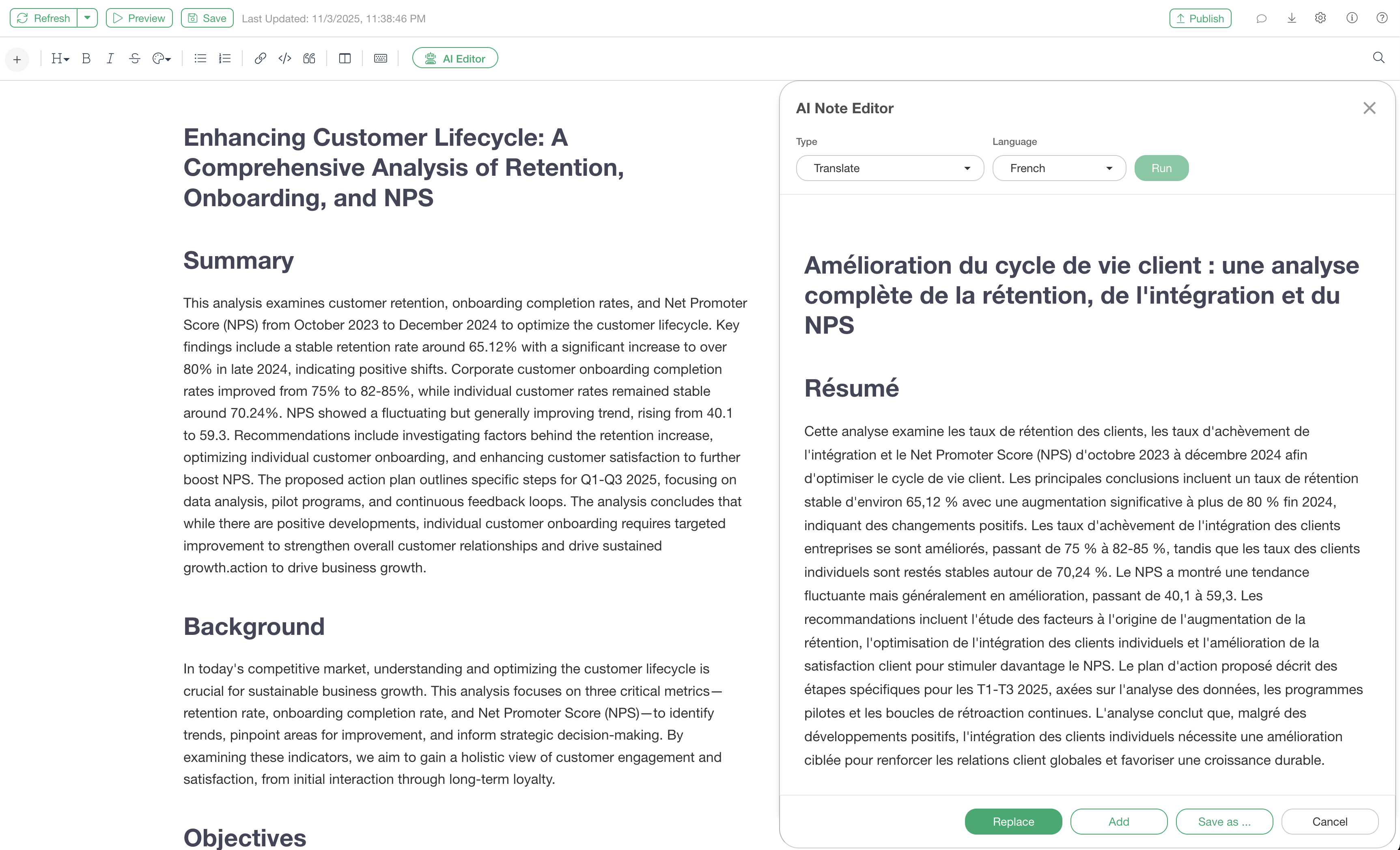 By clicking “Replace,” the original note content can be replaced with the generated analysis report.