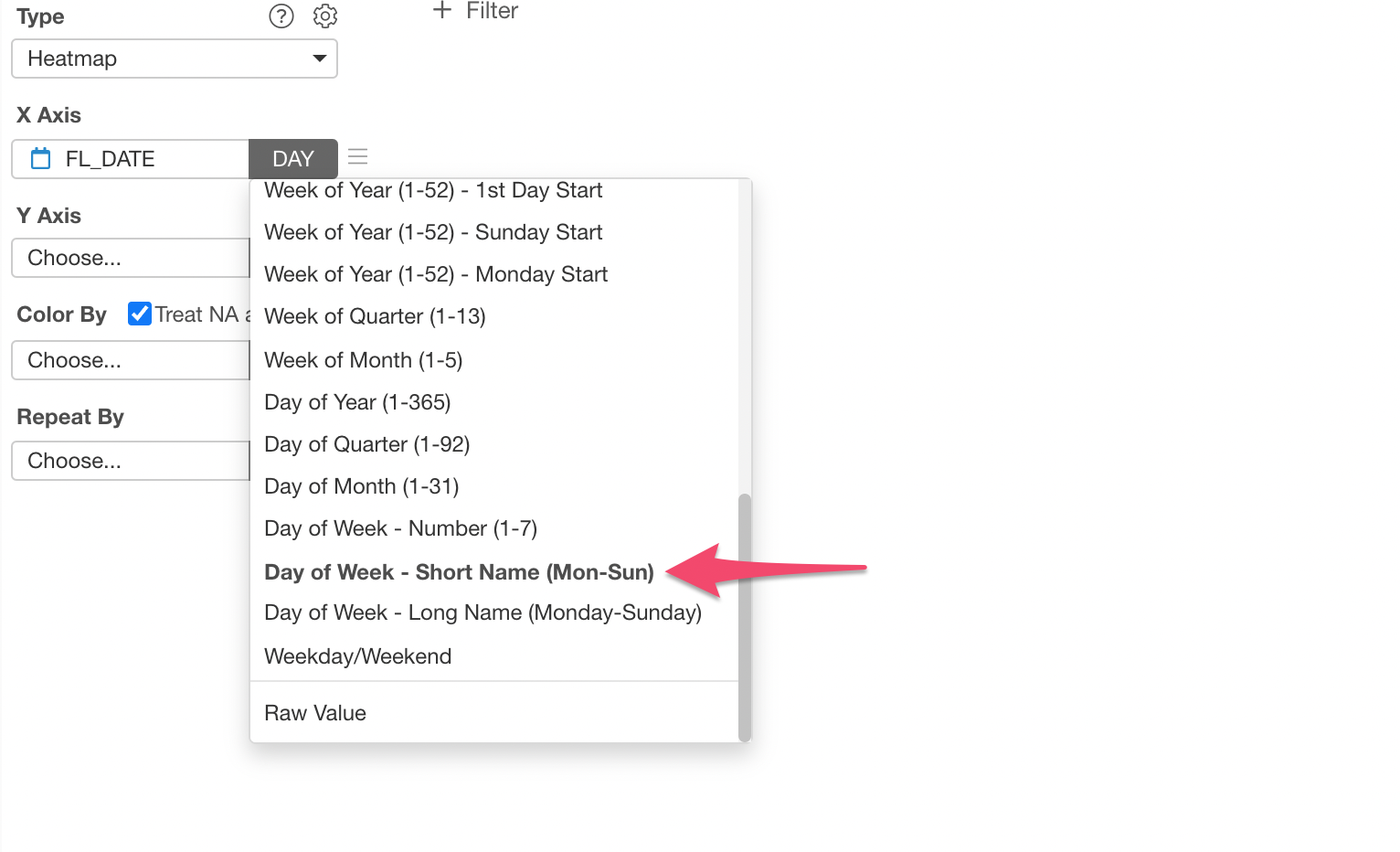 First, select 'FL_DATE' column to the X-Axis, and select 'Day of Week' for the aggregation level.