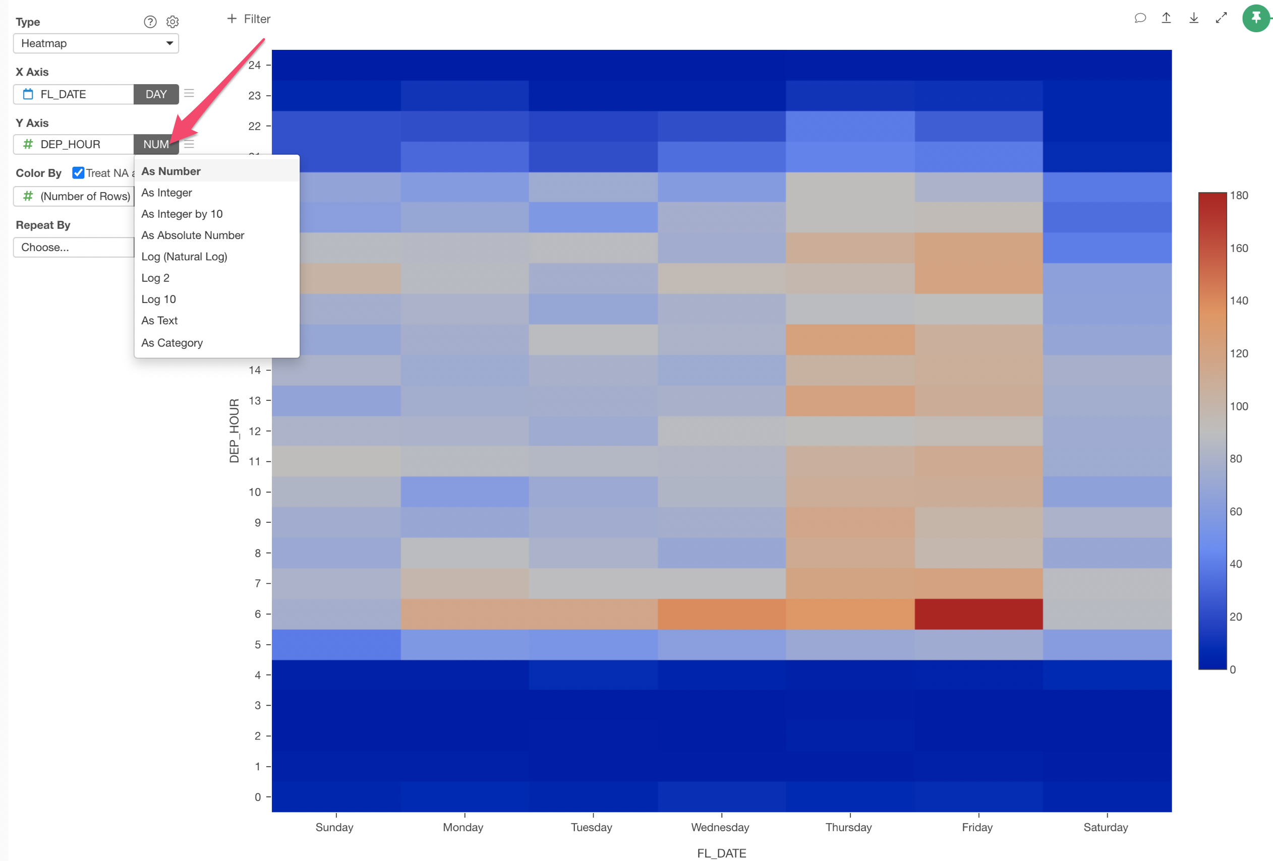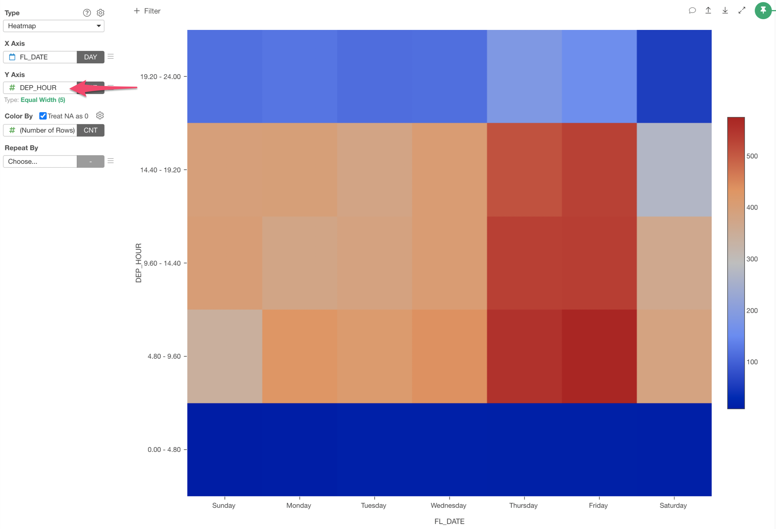 In this example, we'll keep the Value to be the default 'Number of Rows' because we wanted to show the number of flights for each section of the Day of Week and Hour.