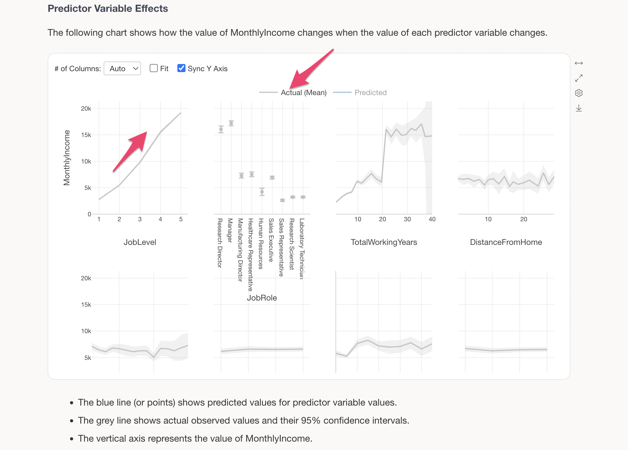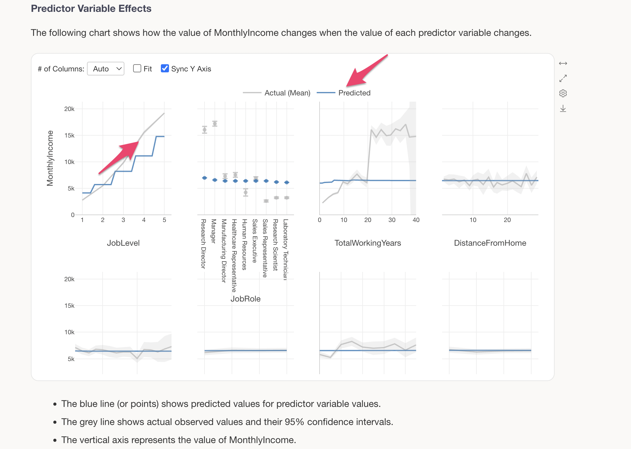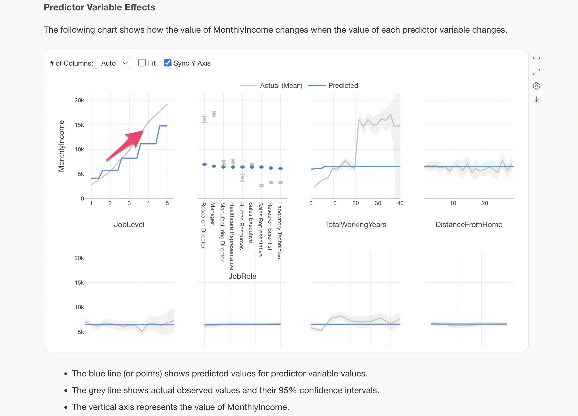 The grey line shows the actual observed values, while the blue line shows the predicted values (values estimated by the model). For example, looking at the change in MonthlyIncome by JobLevel, we can see a clear trend of MonthlyIncome increasing significantly as JobLevel goes up.