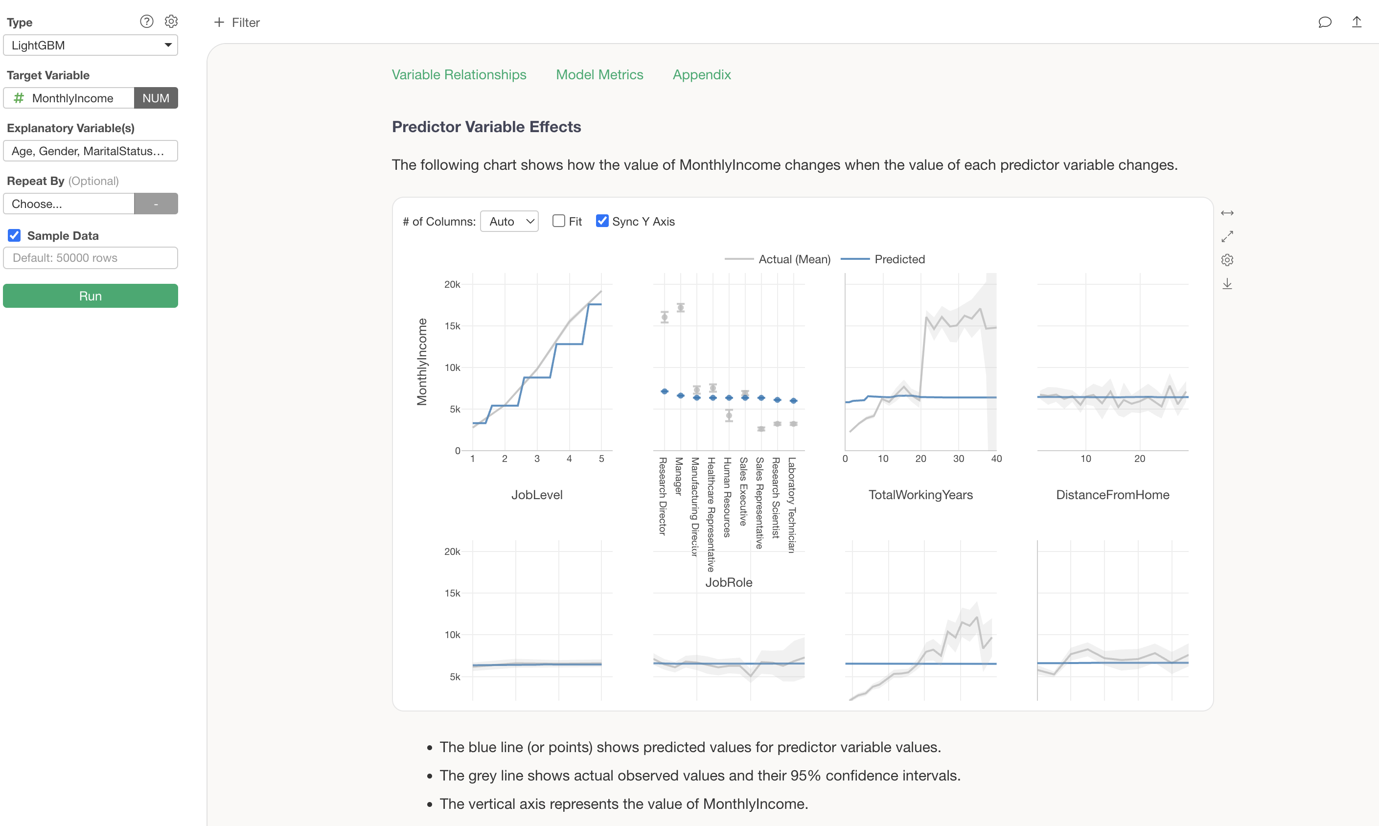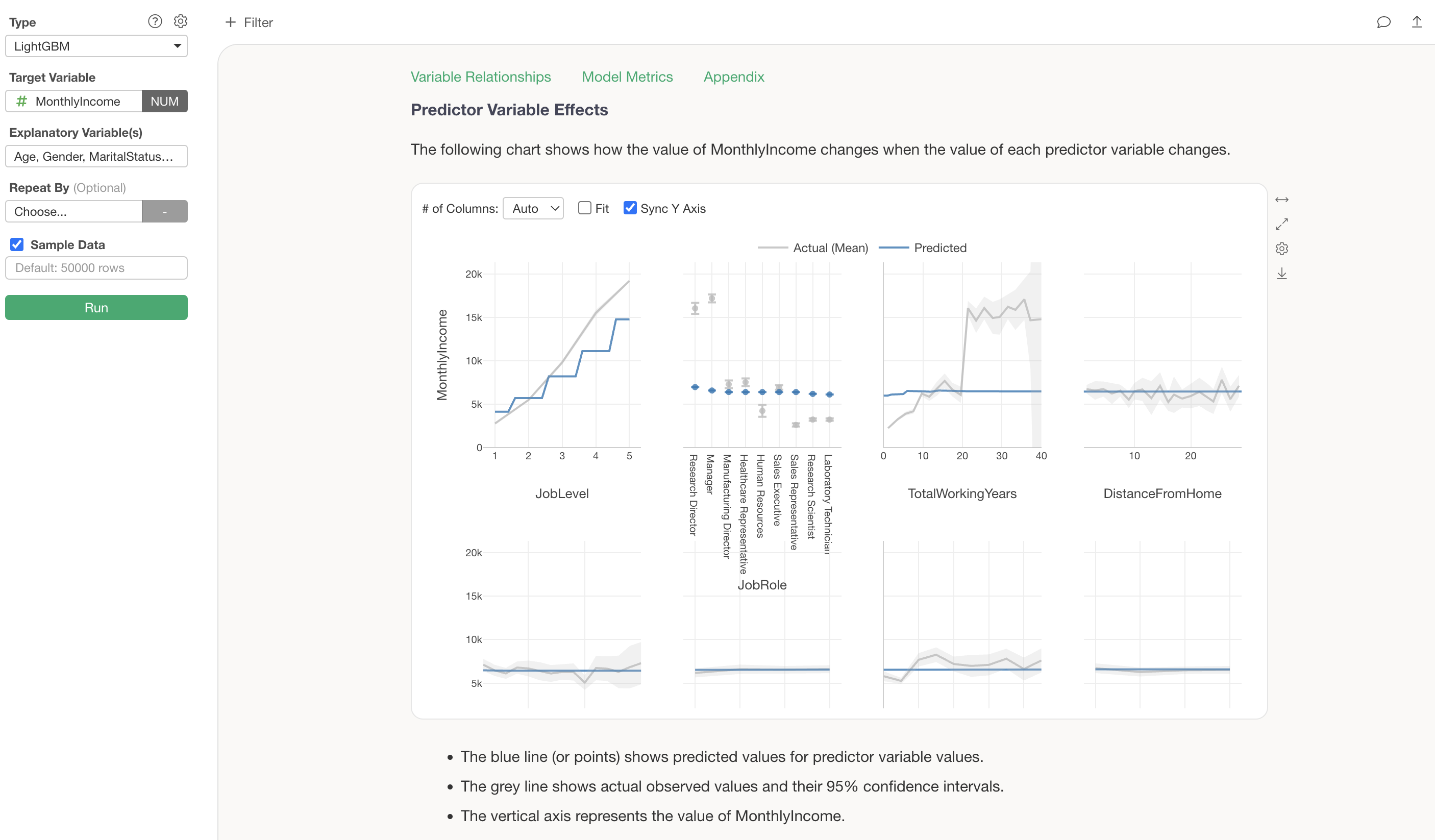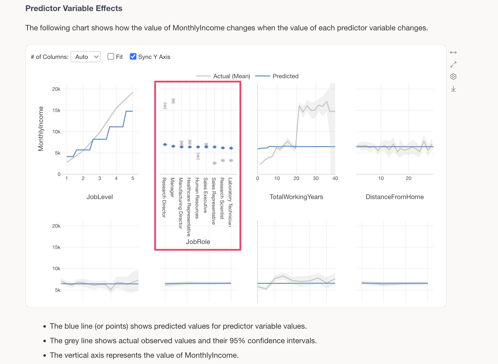 The grey line shows the actual observed values, while the blue line shows the predicted values (values estimated by the model). For example, looking at the change in MonthlyIncome by JobLevel, we can see a clear trend of MonthlyIncome increasing significantly as JobLevel goes up.