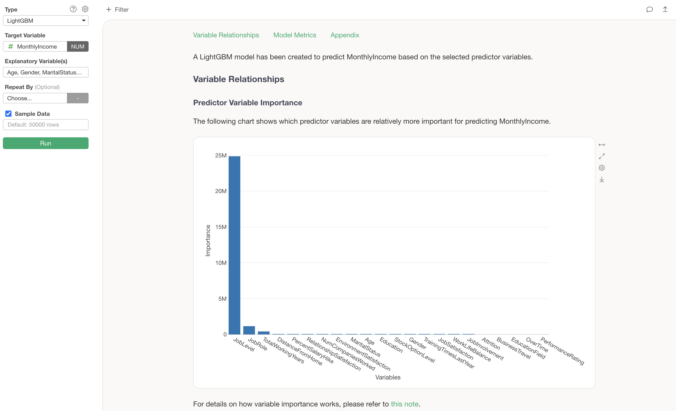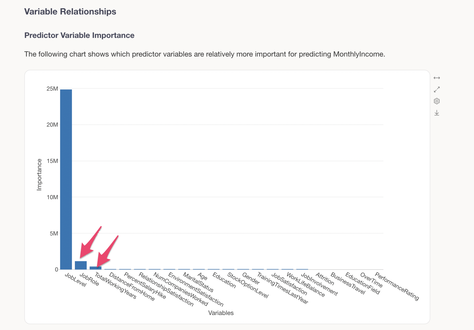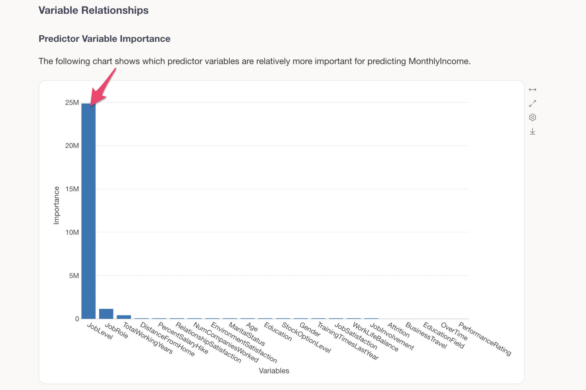 The Predictor Variable Importance section shows which variables have a stronger correlation with the target variable and are more important for making predictions.