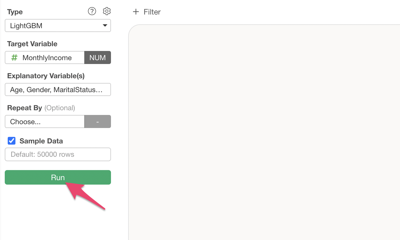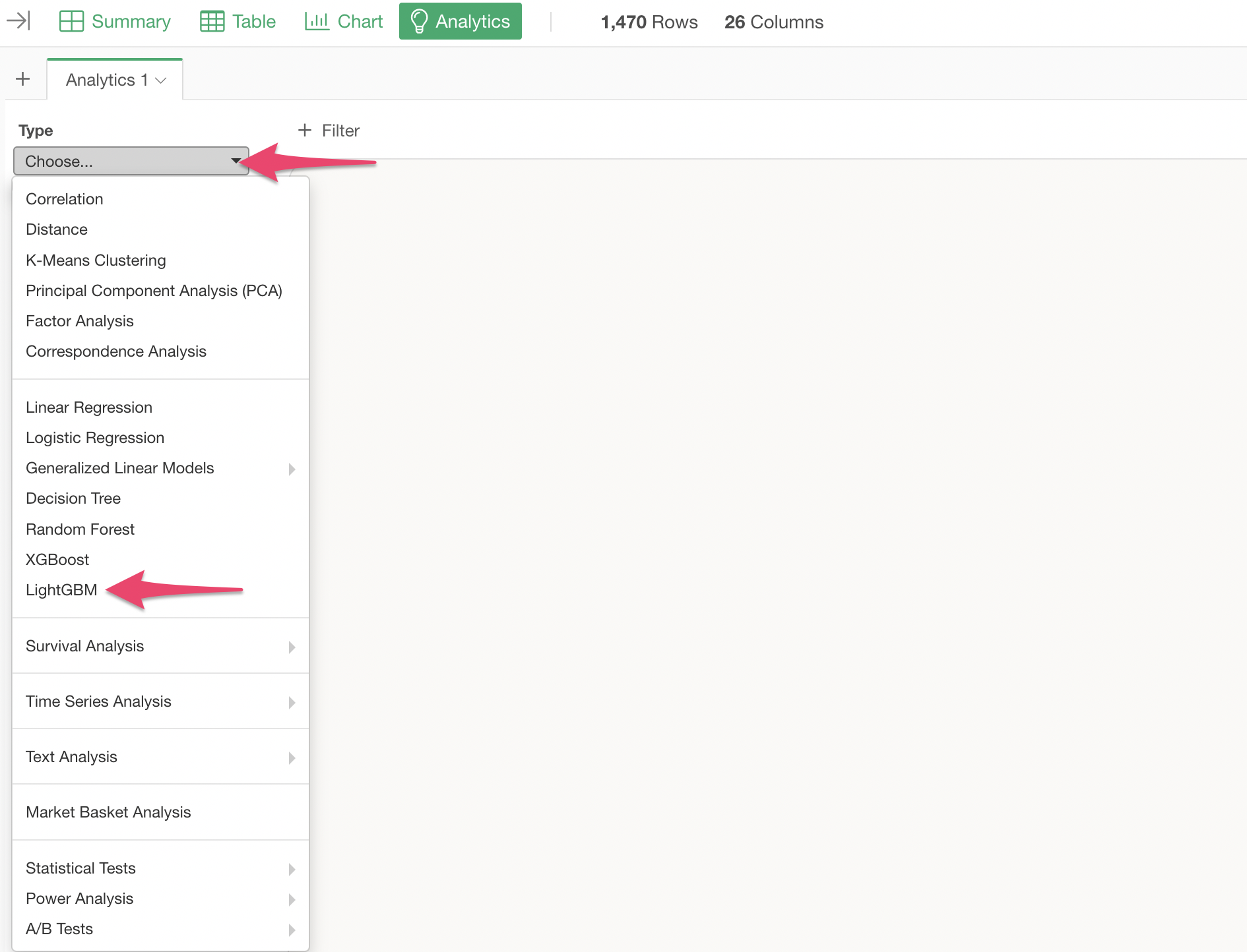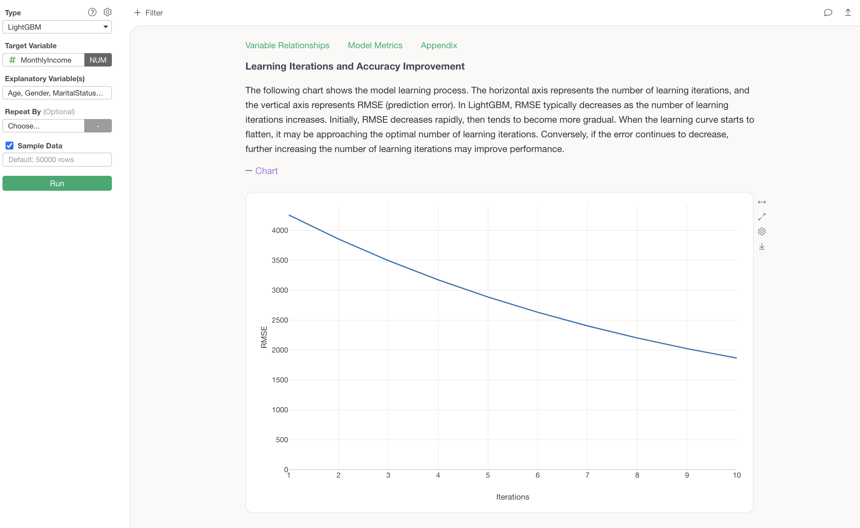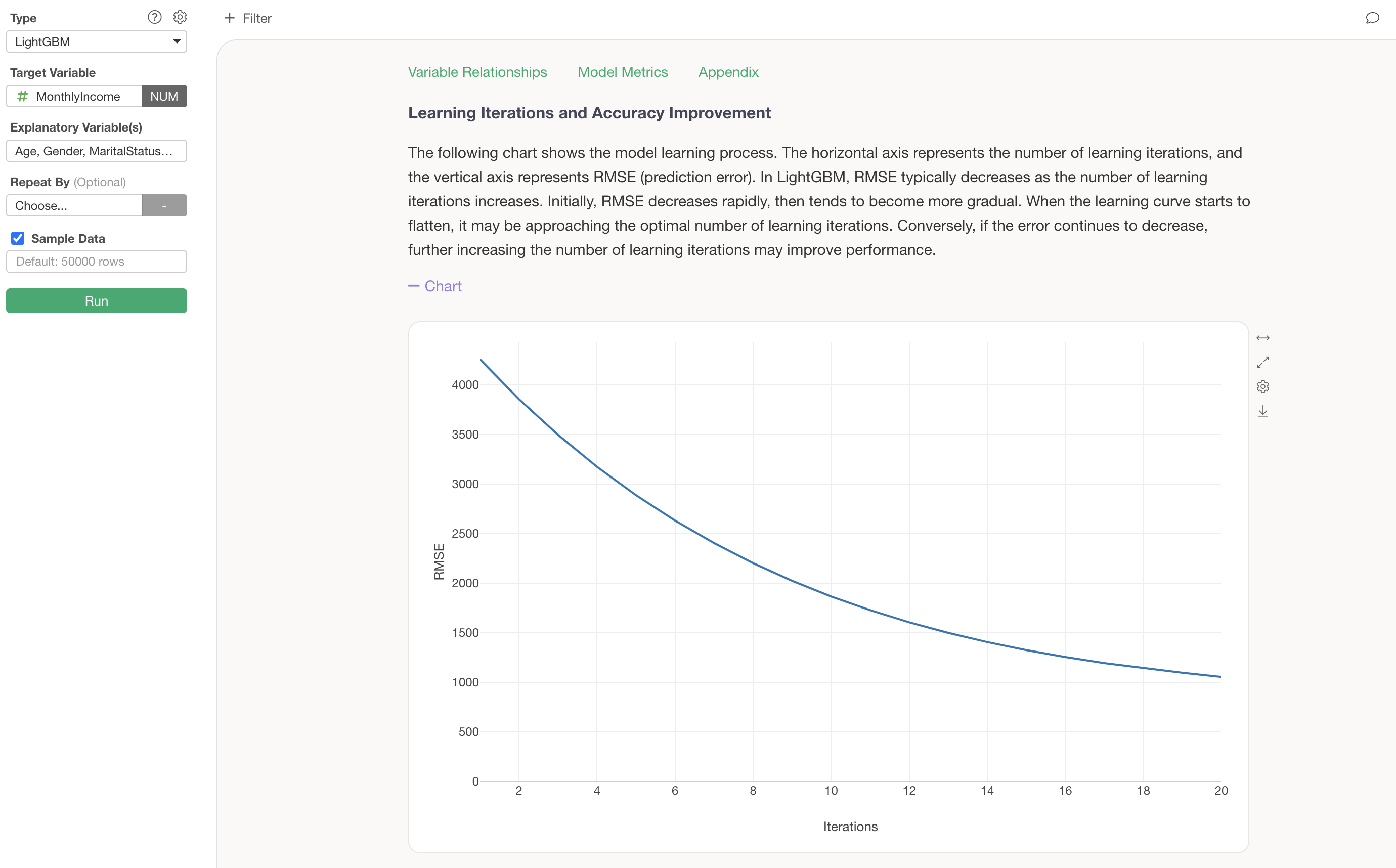 LightGBM is a gradient boosting framework developed by Microsoft that, like XGBoost, improves prediction accuracy by building multiple decision trees sequentially. In Exploratory’s Analytics view, you can simply select “LightGBM” as the type, specify the target variable and explanatory variables, and run it to immediately see results including variable importance, predictor variable effects, the learning process, and prediction accuracy.