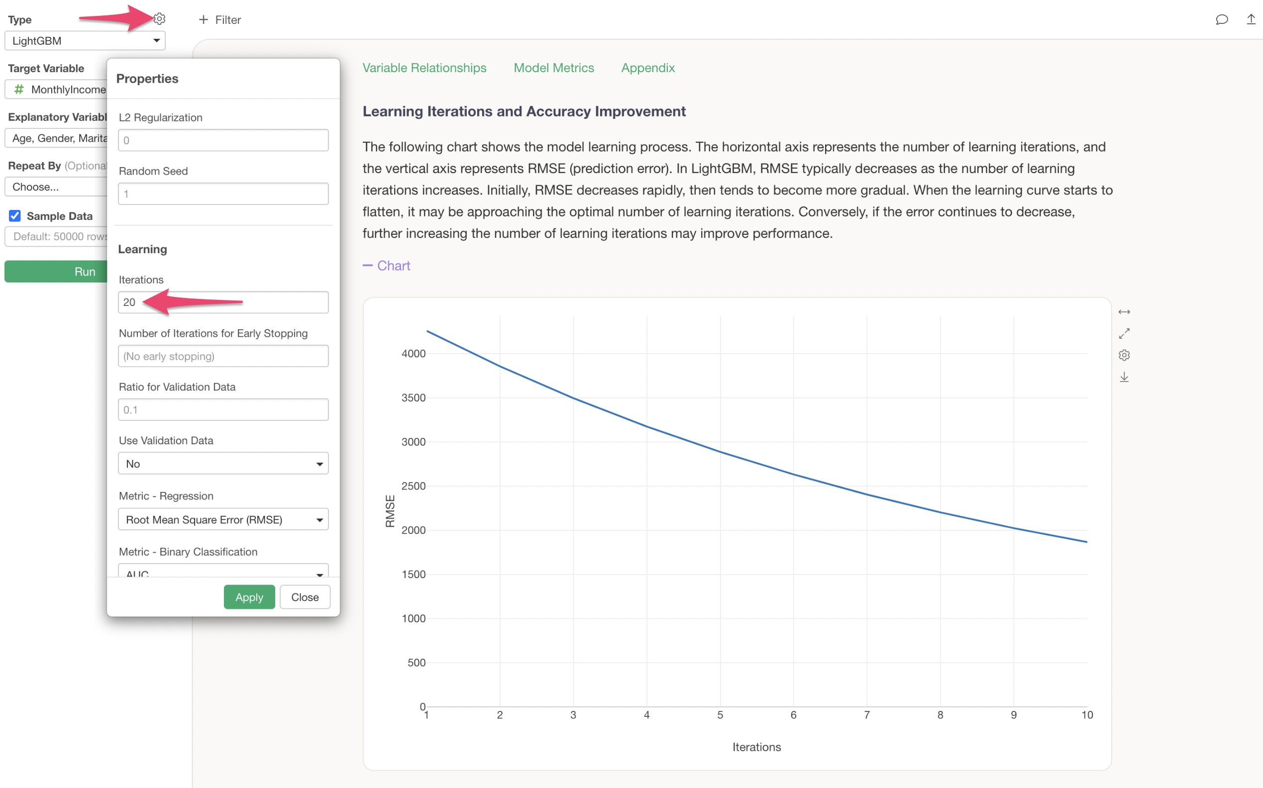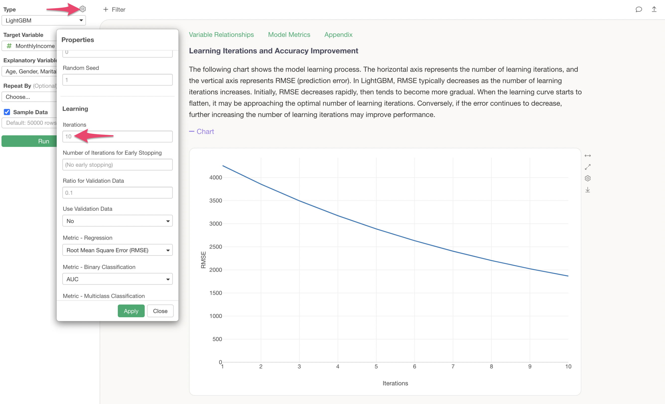 The default number of learning iterations is 10, but this can be changed in the properties. Additionally, you can also adjust the Early Stopping rounds (the number of iterations after which training stops if prediction accuracy does not improve) and the metric used during training.