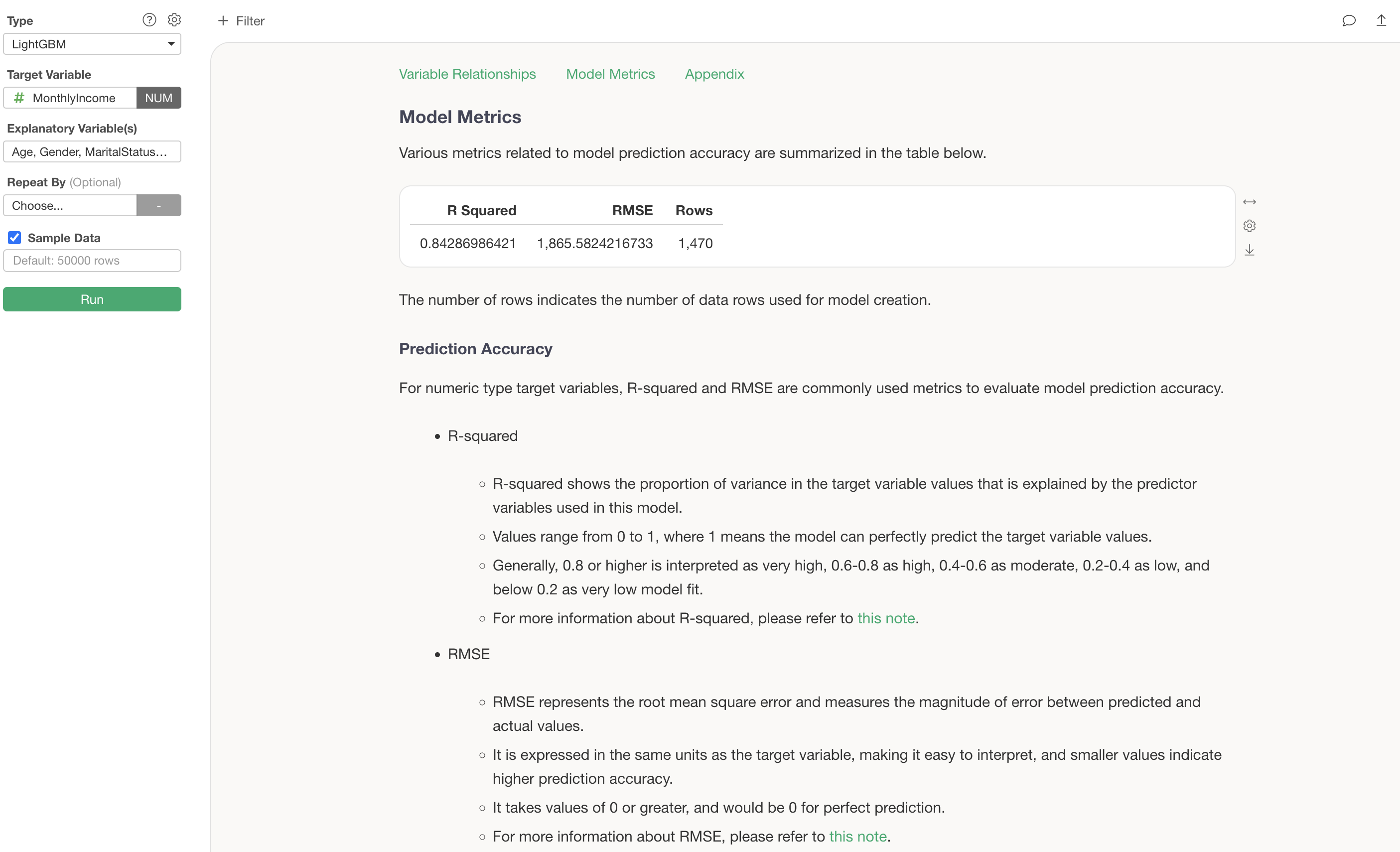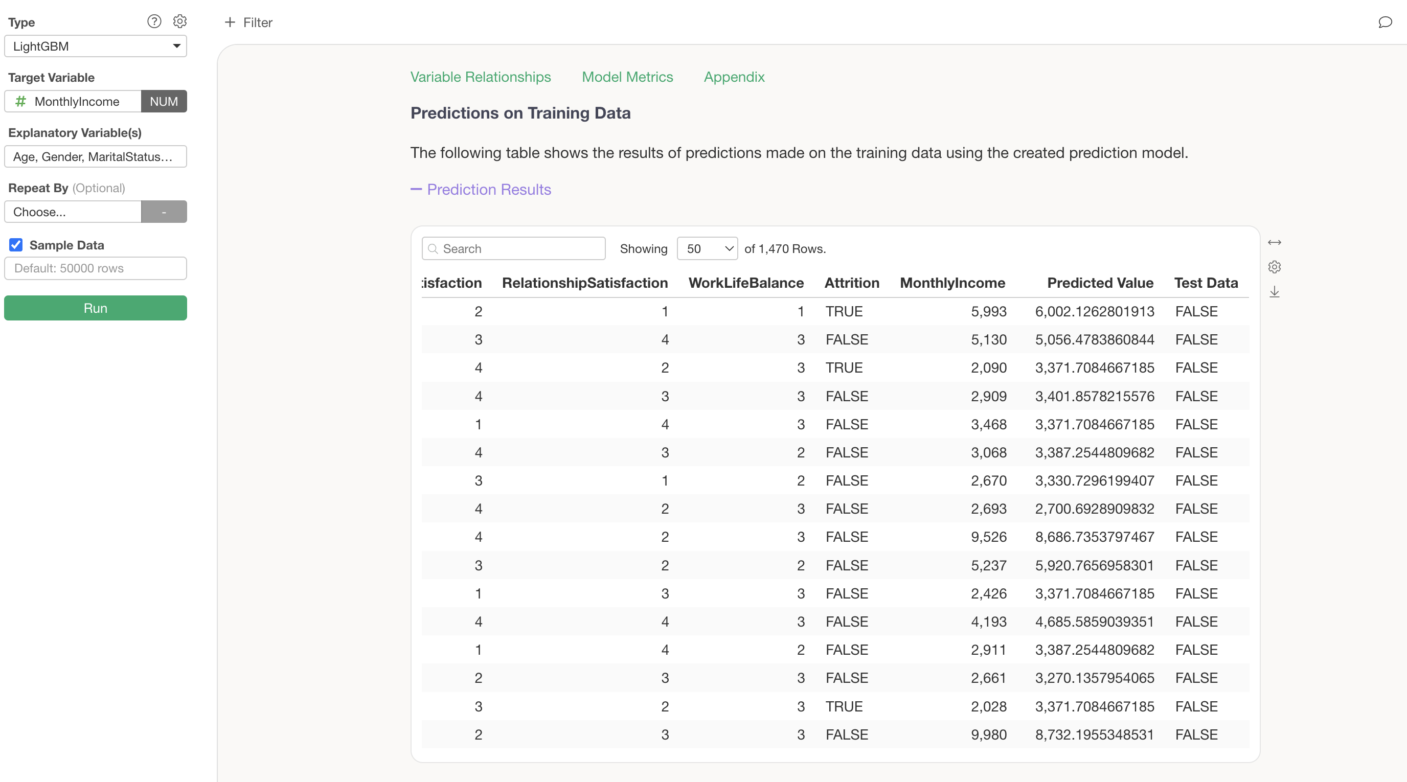 The Predictions on Training Data section allows you to view the data used for the model and the predicted values in a table format. By comparing the target variable MonthlyIncome side by side with the Predicted Value calculated by this model, you can assess how accurate the model’s predictions are at the individual data level.