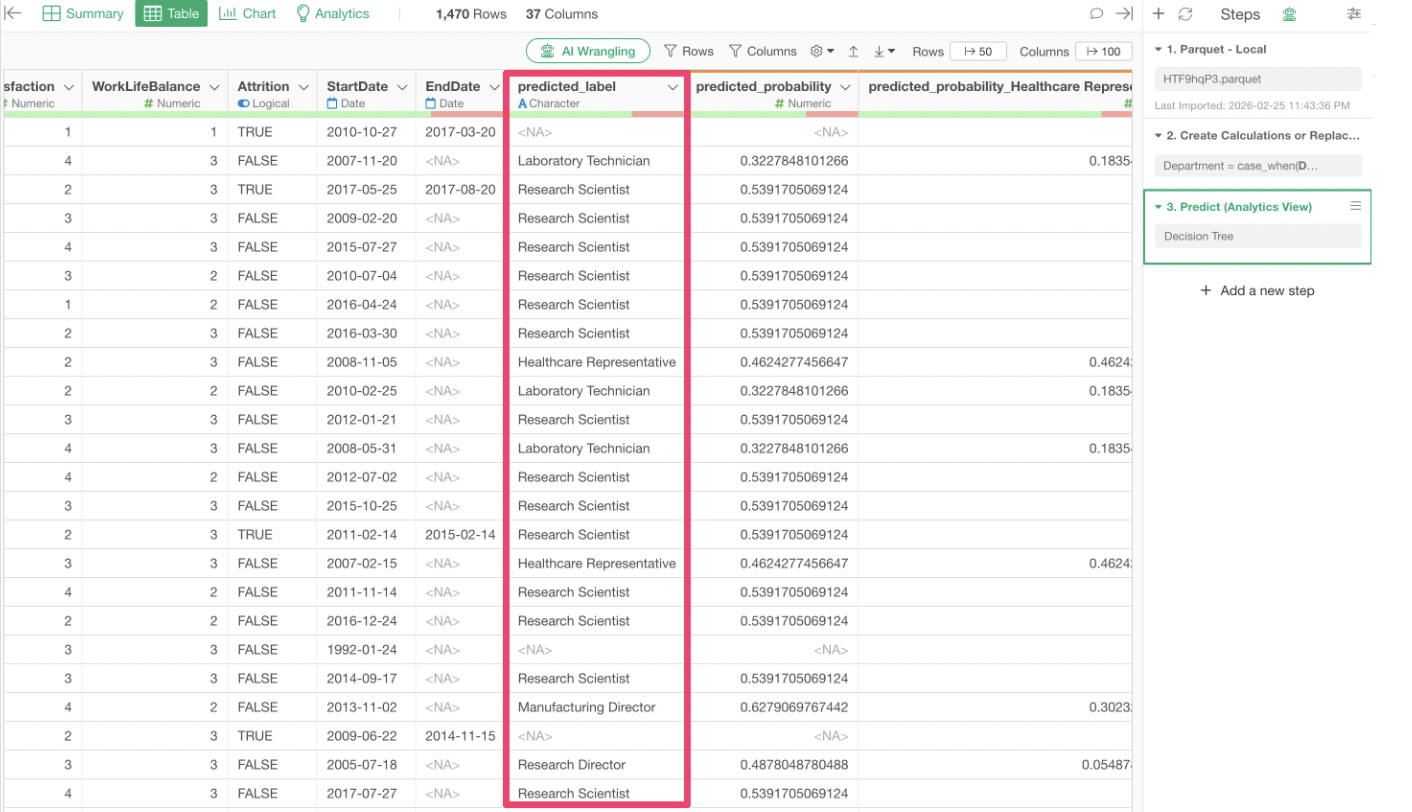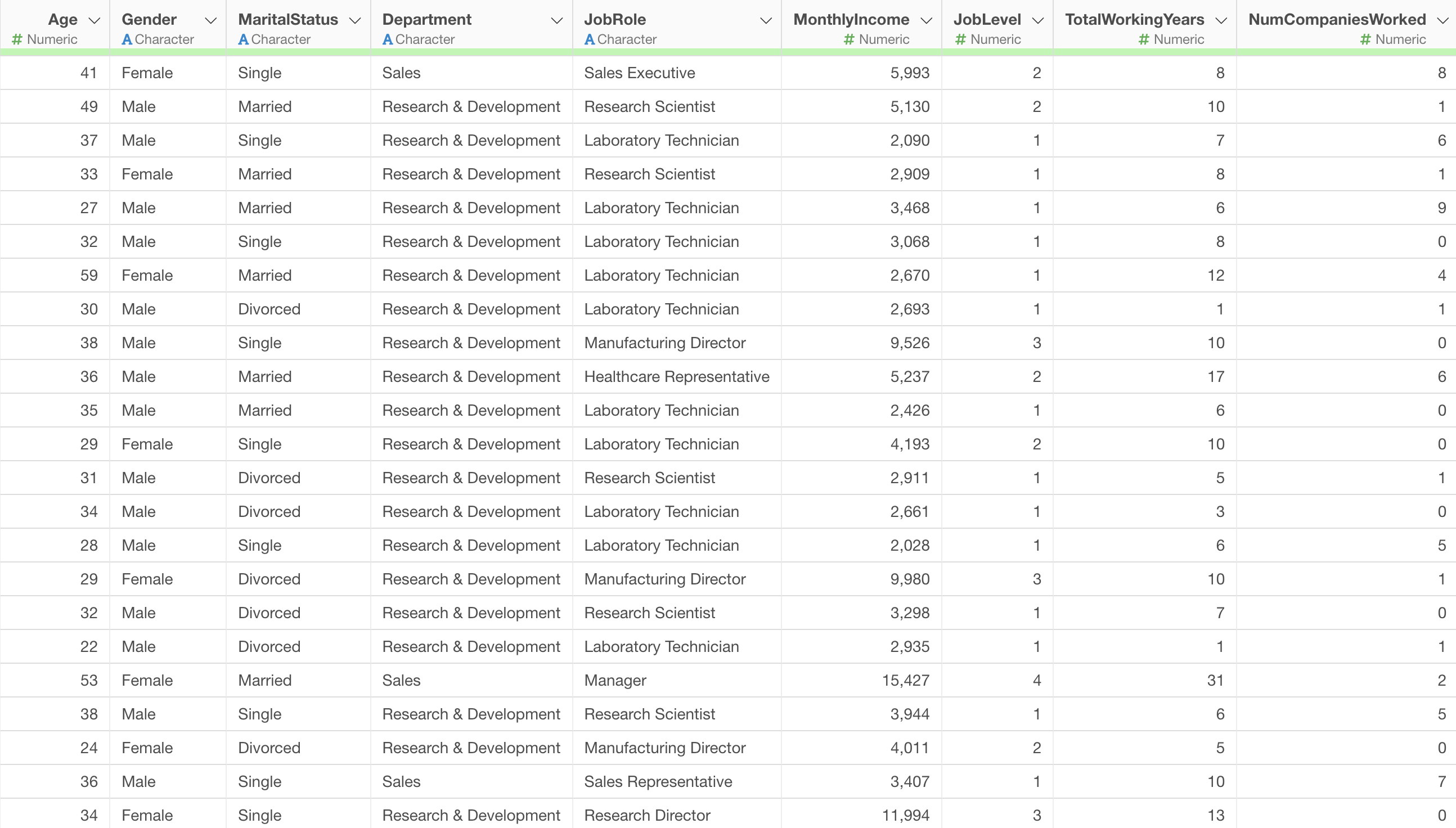 In this data, each row represents one employee, and the columns contain attributes such as age, salary, job role, and other employee characteristics.