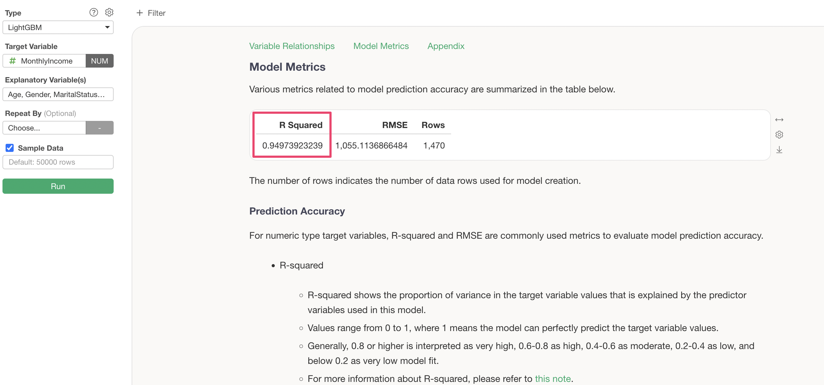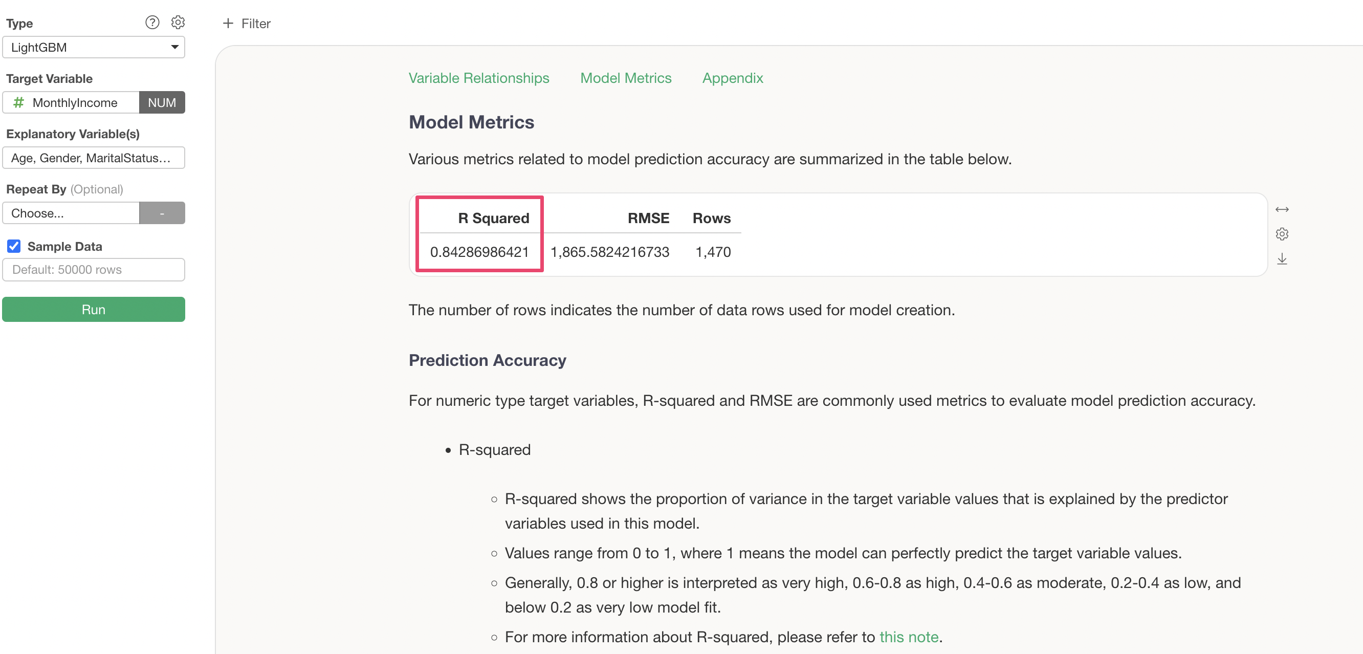 The Model Metrics section allows you to check the prediction accuracy of this model.