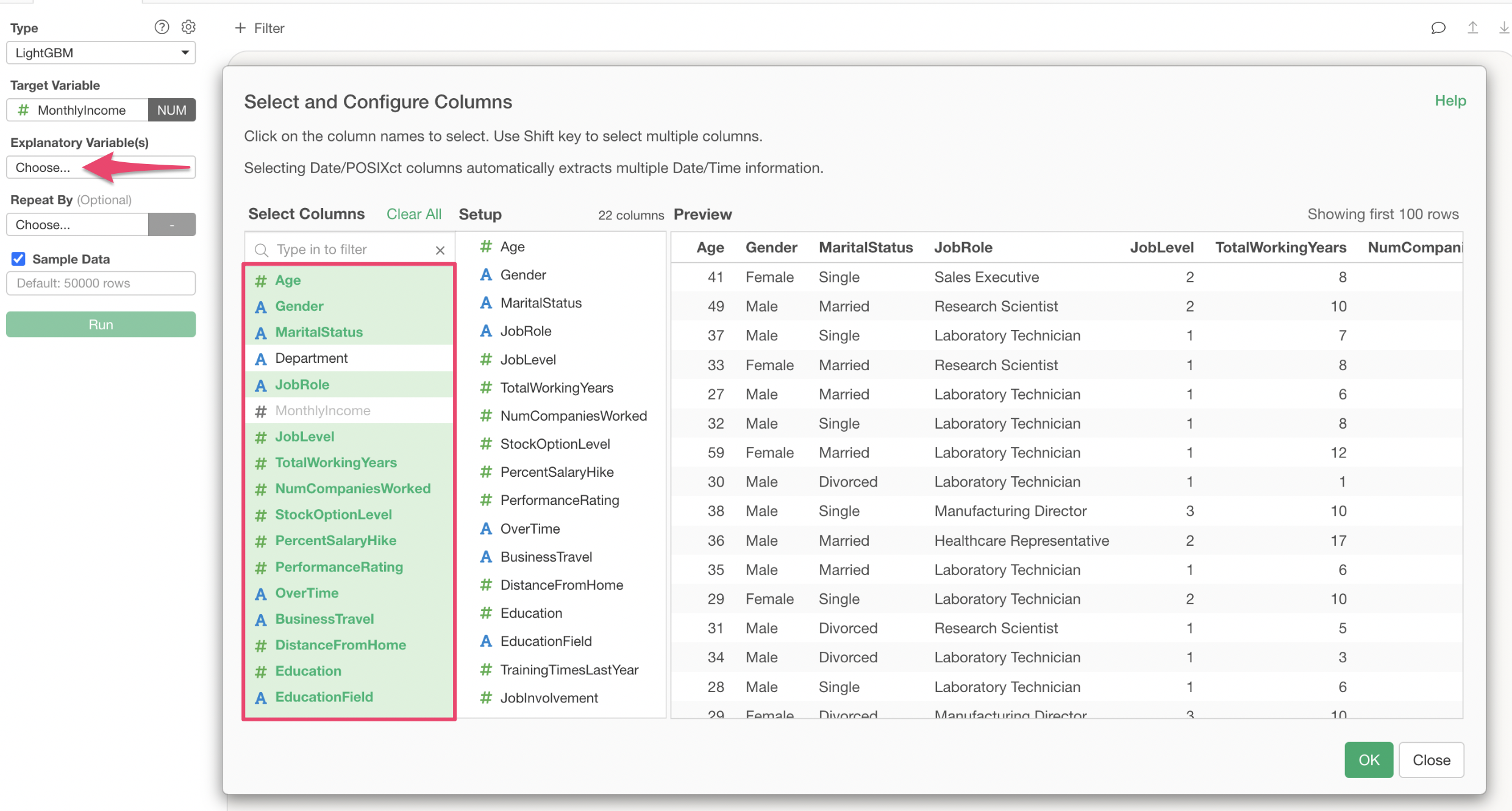 Click on the explanatory variables column and select the columns to use for predicting MonthlyIncome. In the column selection screen, you can either select columns individually or specify a range of columns to select them all at once.