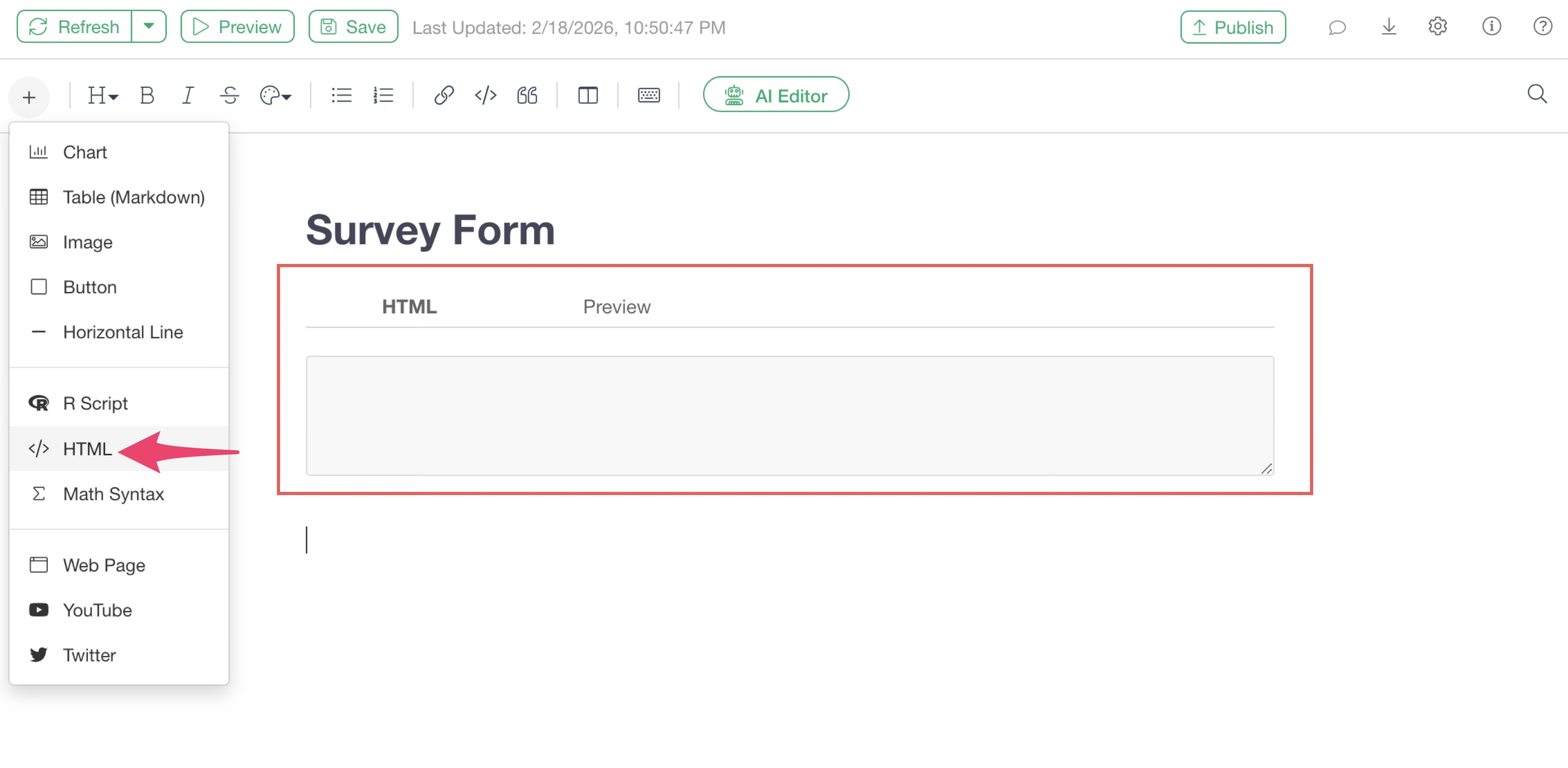 Selecting “HTML” from the Add Content menu adds a code block for writing HTML.