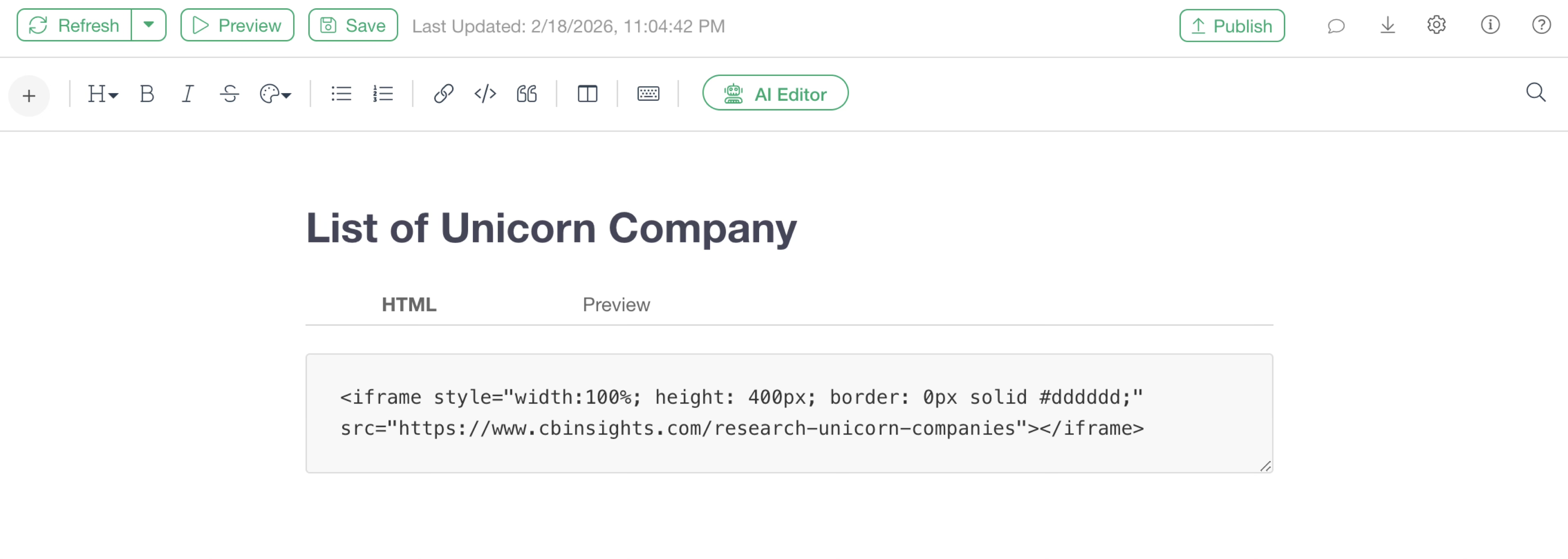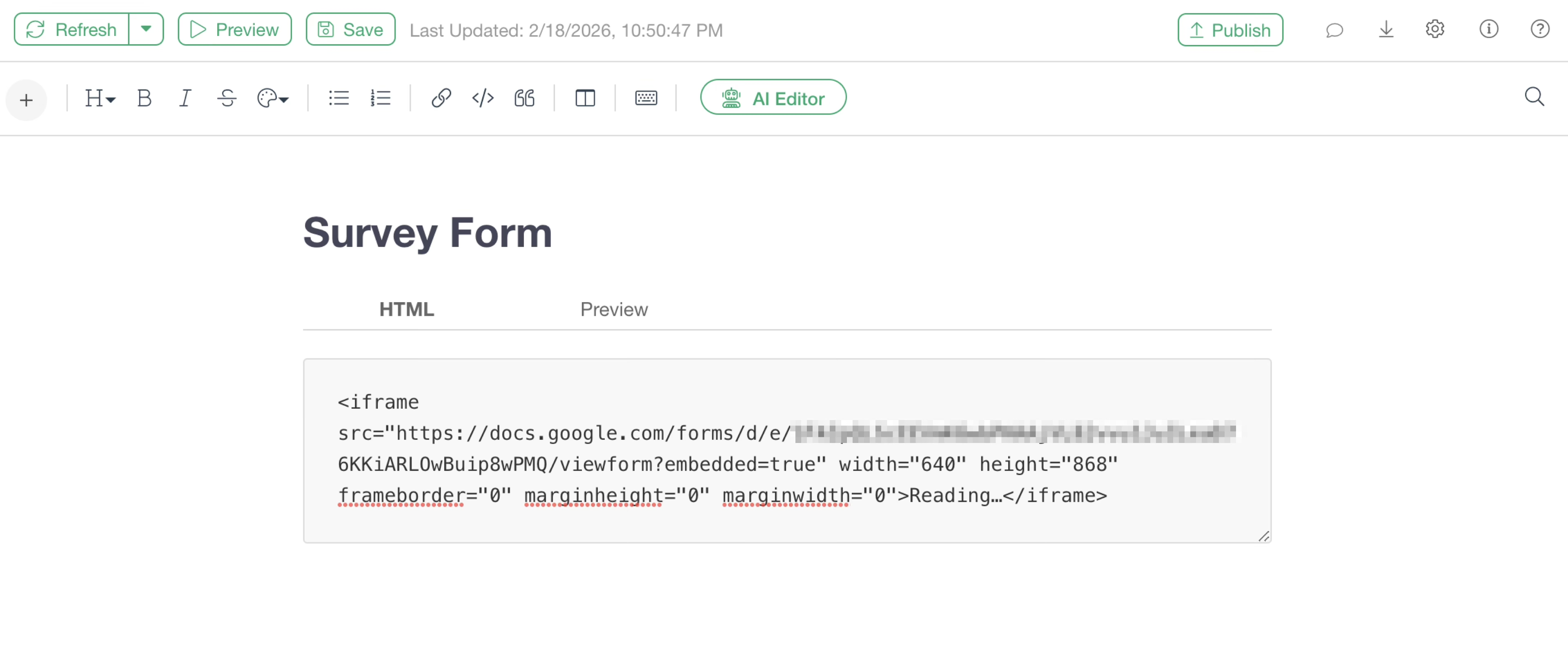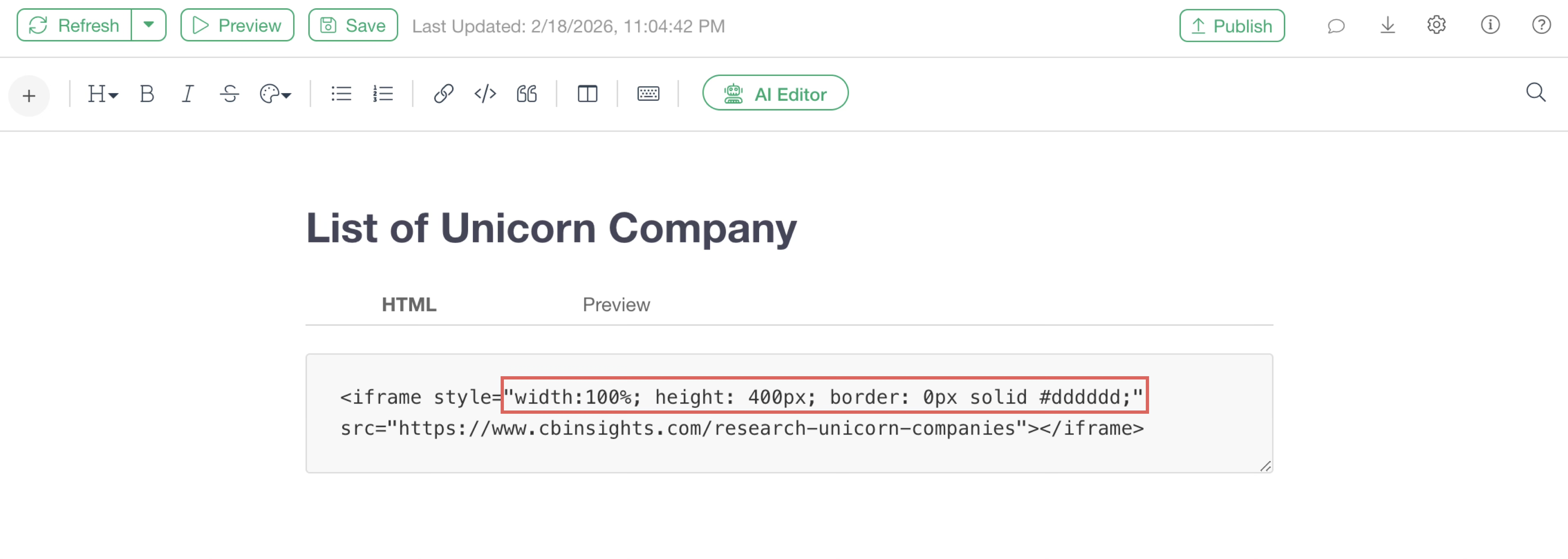Once the URL is entered, a code block containing the embed code for the web page using an iframe (HTML) will be added.