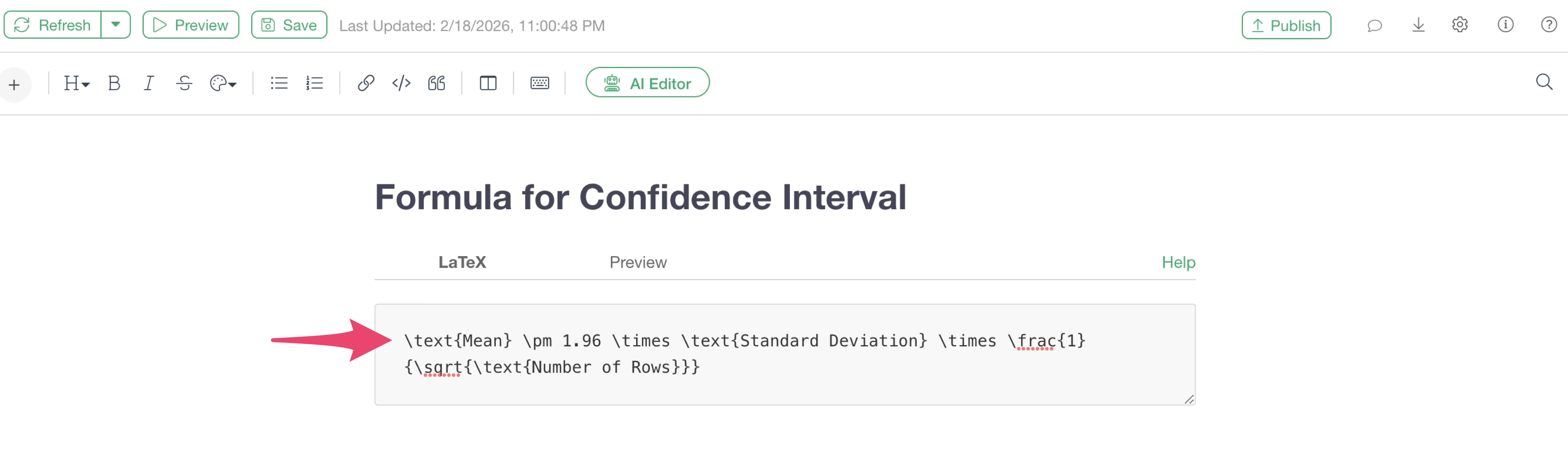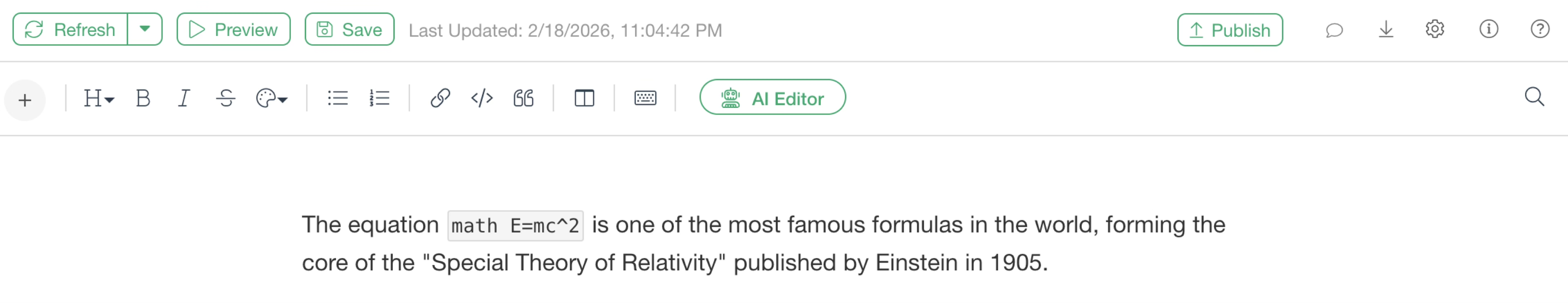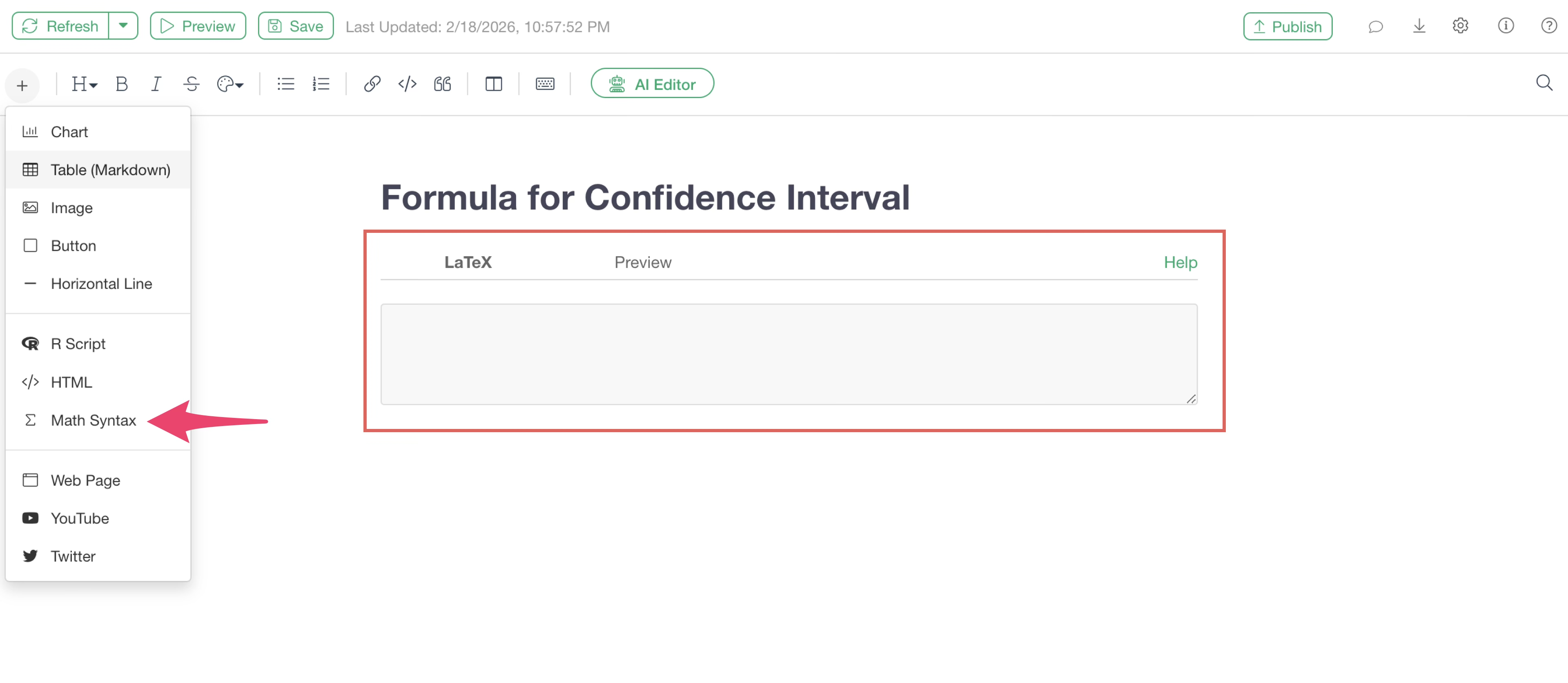 Selecting “Equations” from the Add Content menu adds a code block where you can write mathematical formulas in LaTeX format.