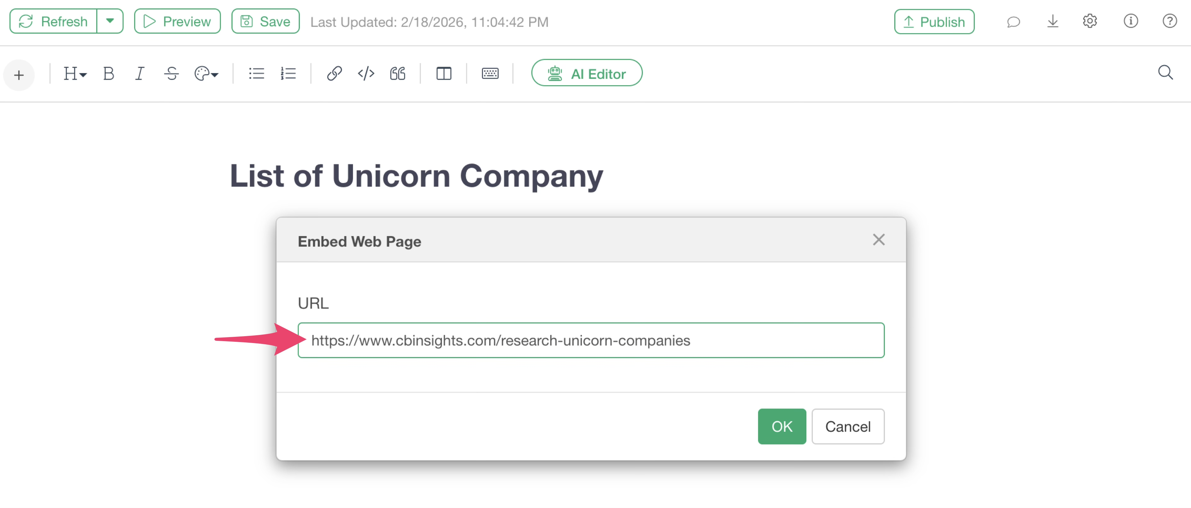 A dialog box will appear for you to specify the web page you want to embed. Enter the URL of the web page.