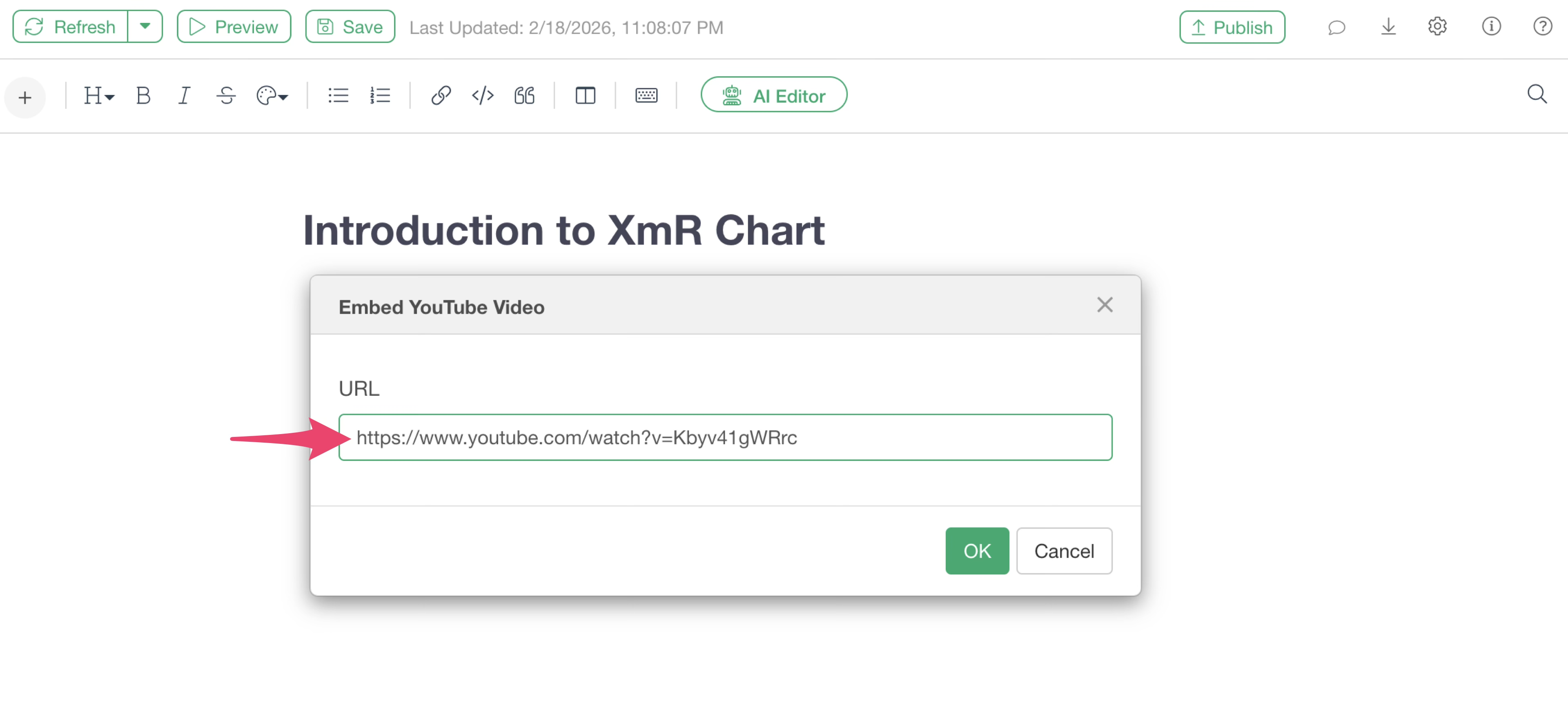 A dialog box will appear for you to specify the YouTube video page. Enter the URL of the YouTube video.