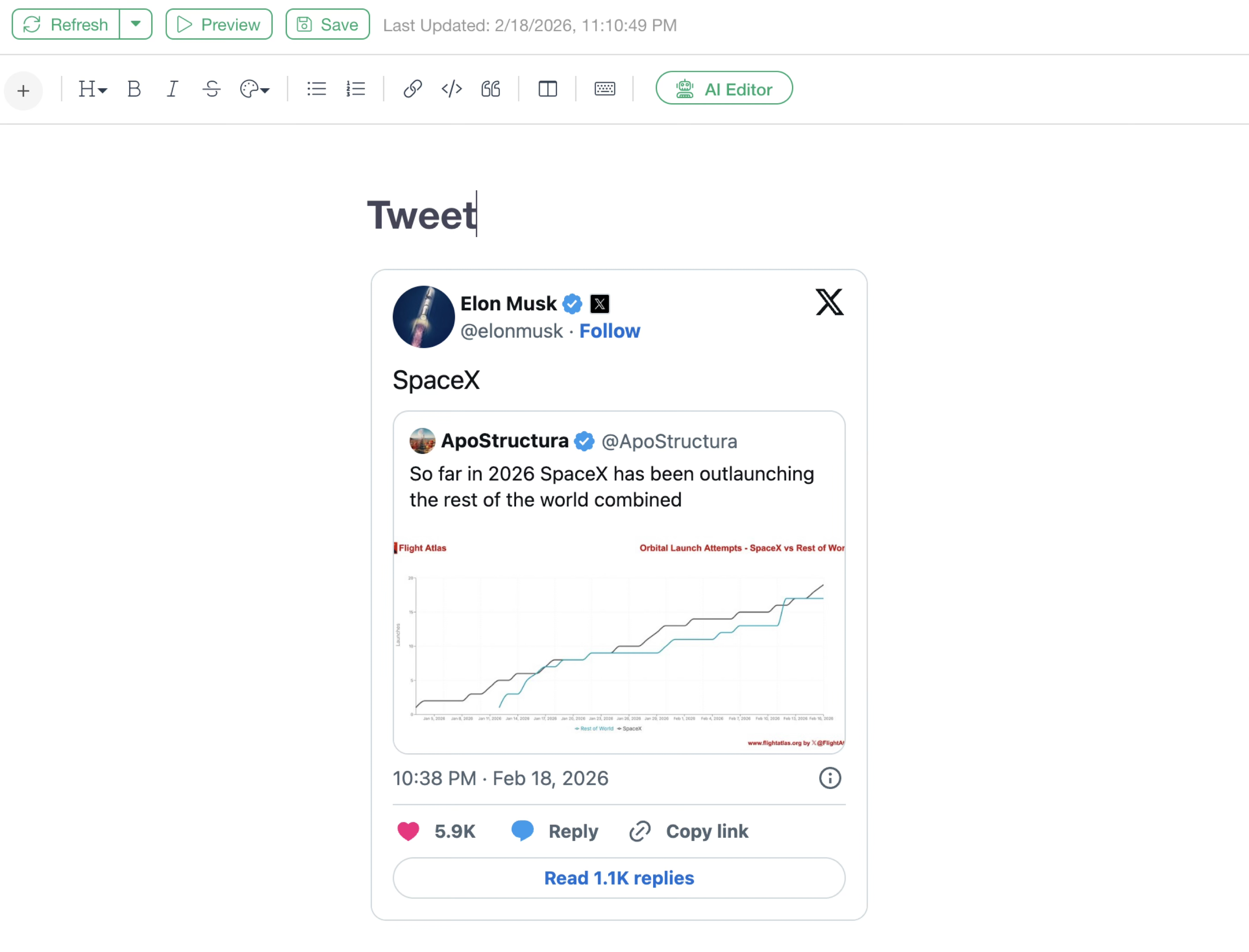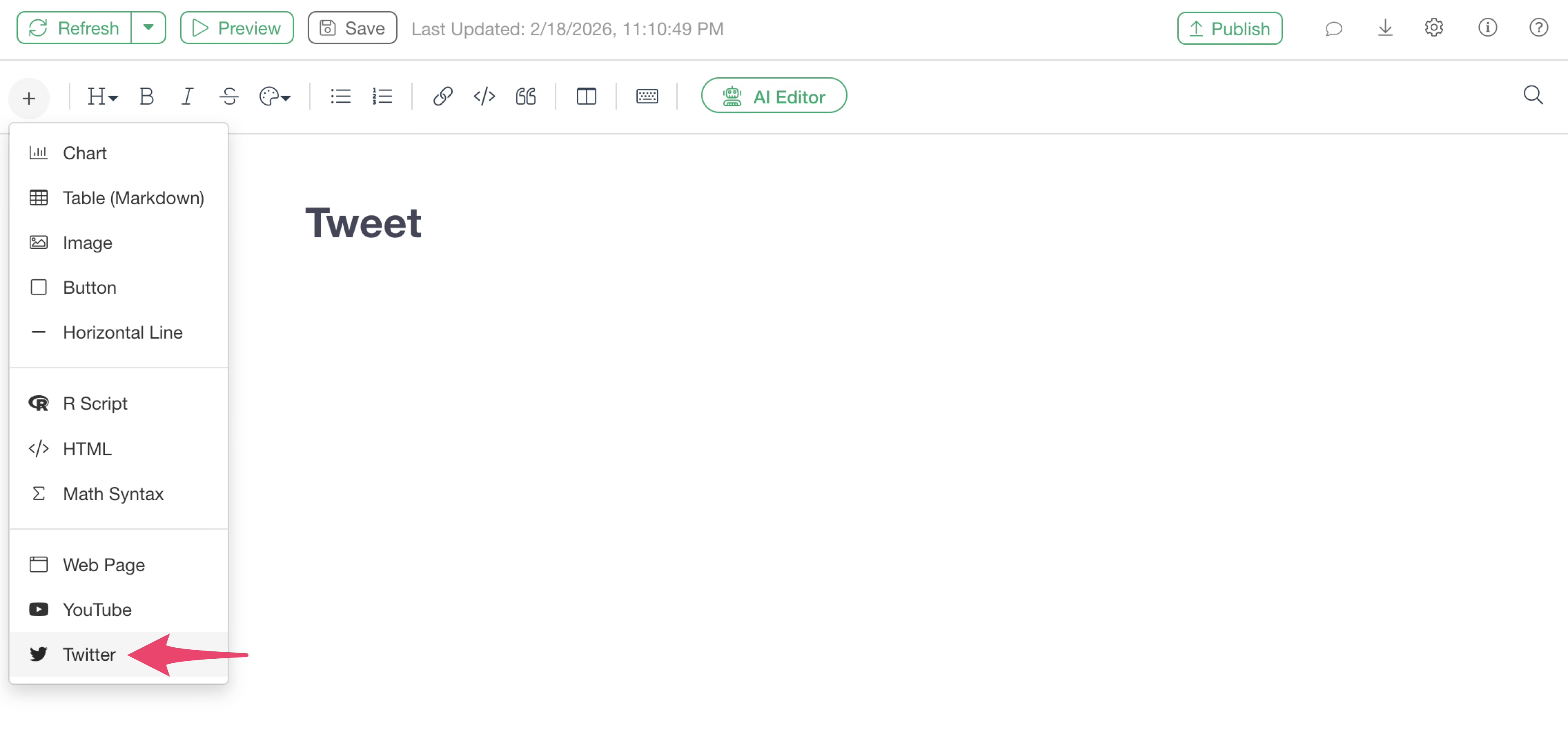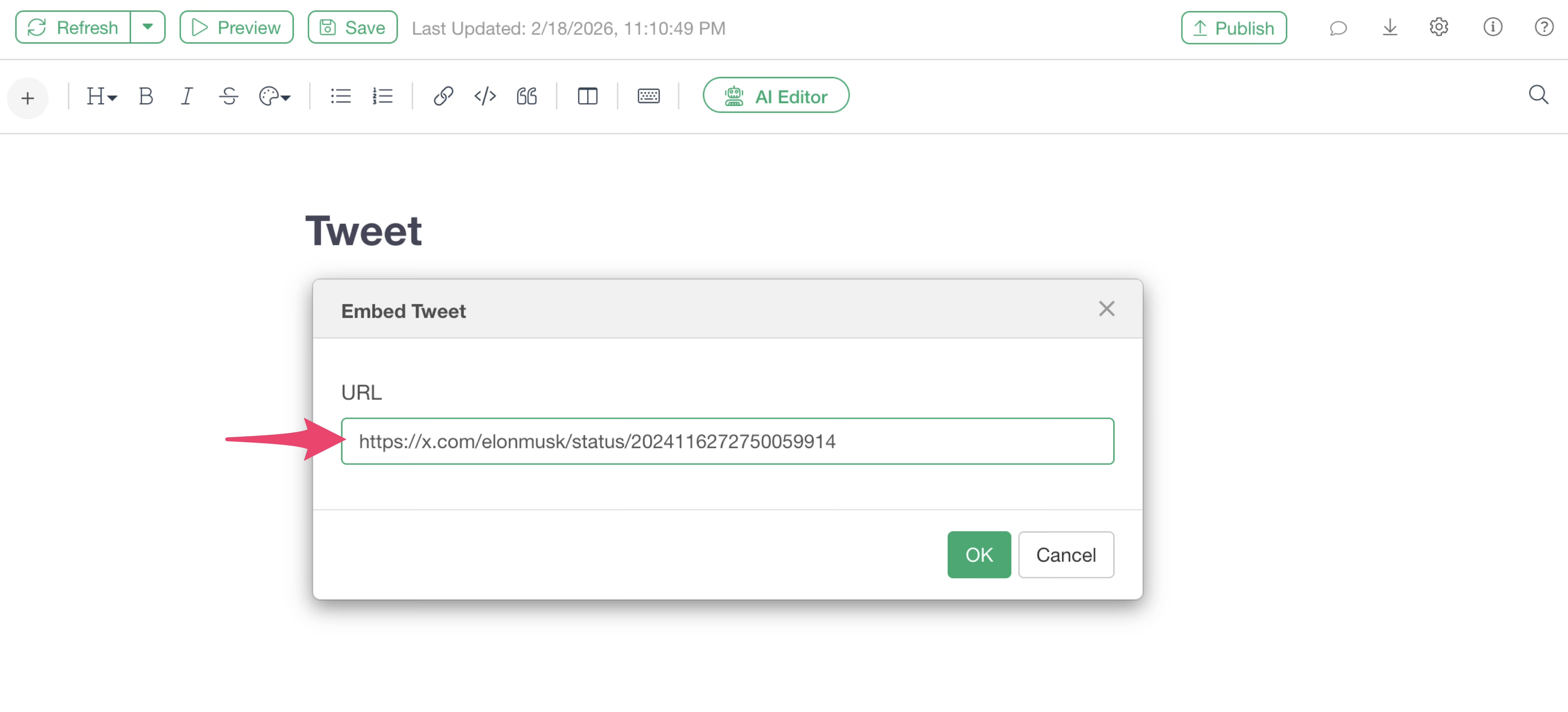 A dialog box will appear for you to specify the Tweet. Enter the URL of the Tweet you want to embed.