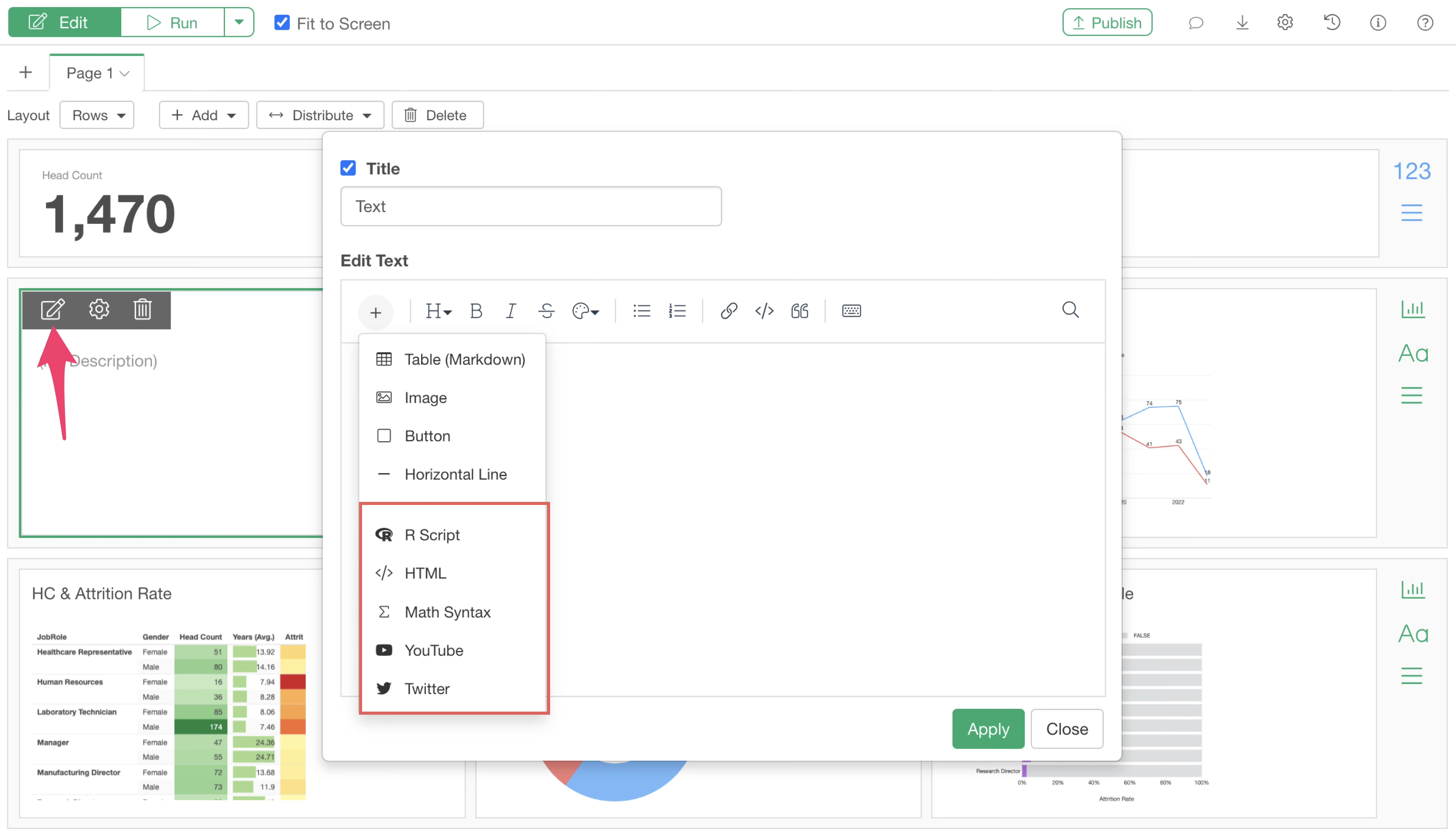 In this R code block, you can write R scripts directly to create charts or analytics that are not supported by default in Exploratory and add them to your Notes or Dashboards.