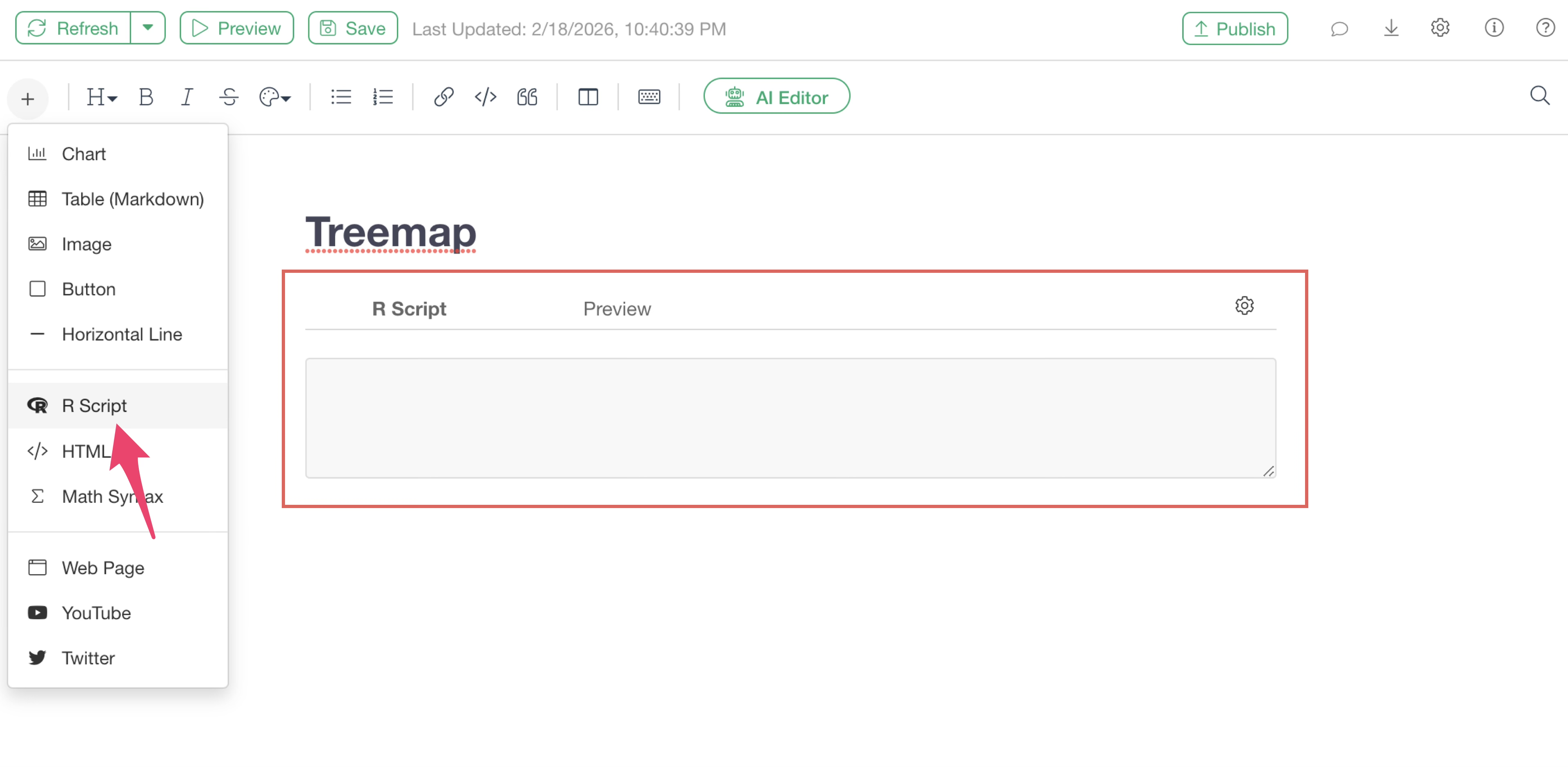 When you select “R Script” from the Add Content menu, an R code block is added.