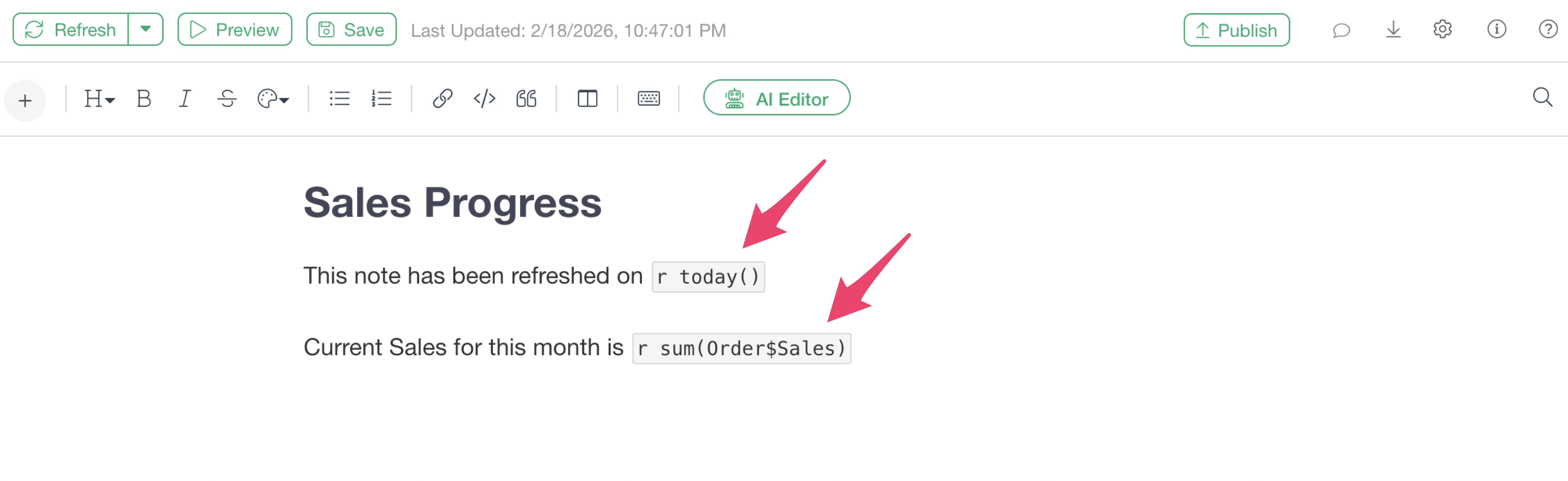 R code can also be used inline, allowing R to dynamically generate parts of your text.