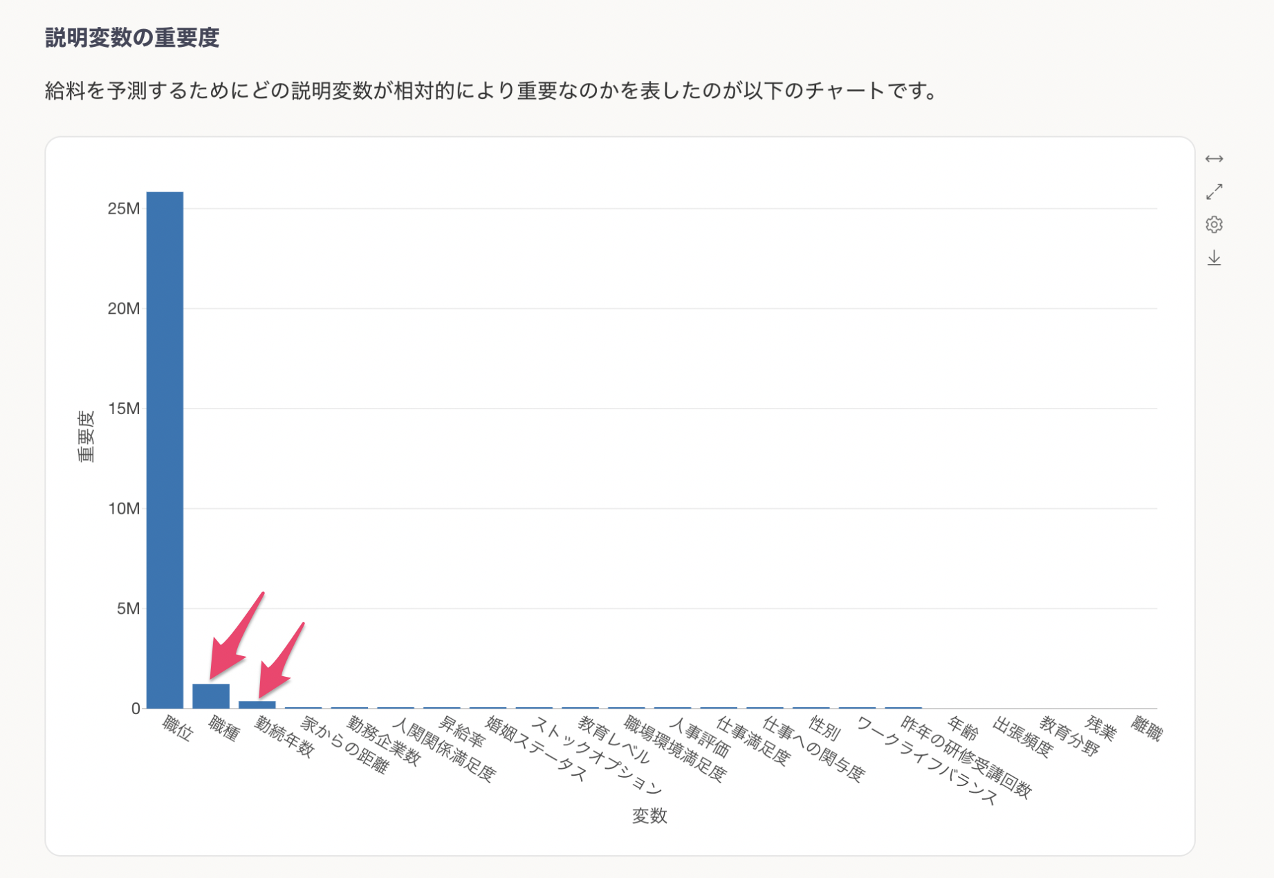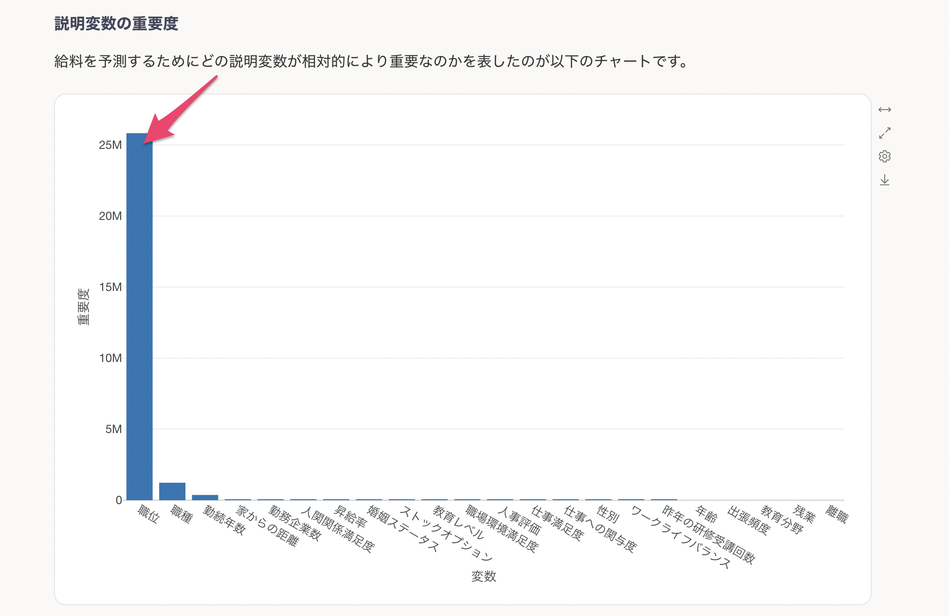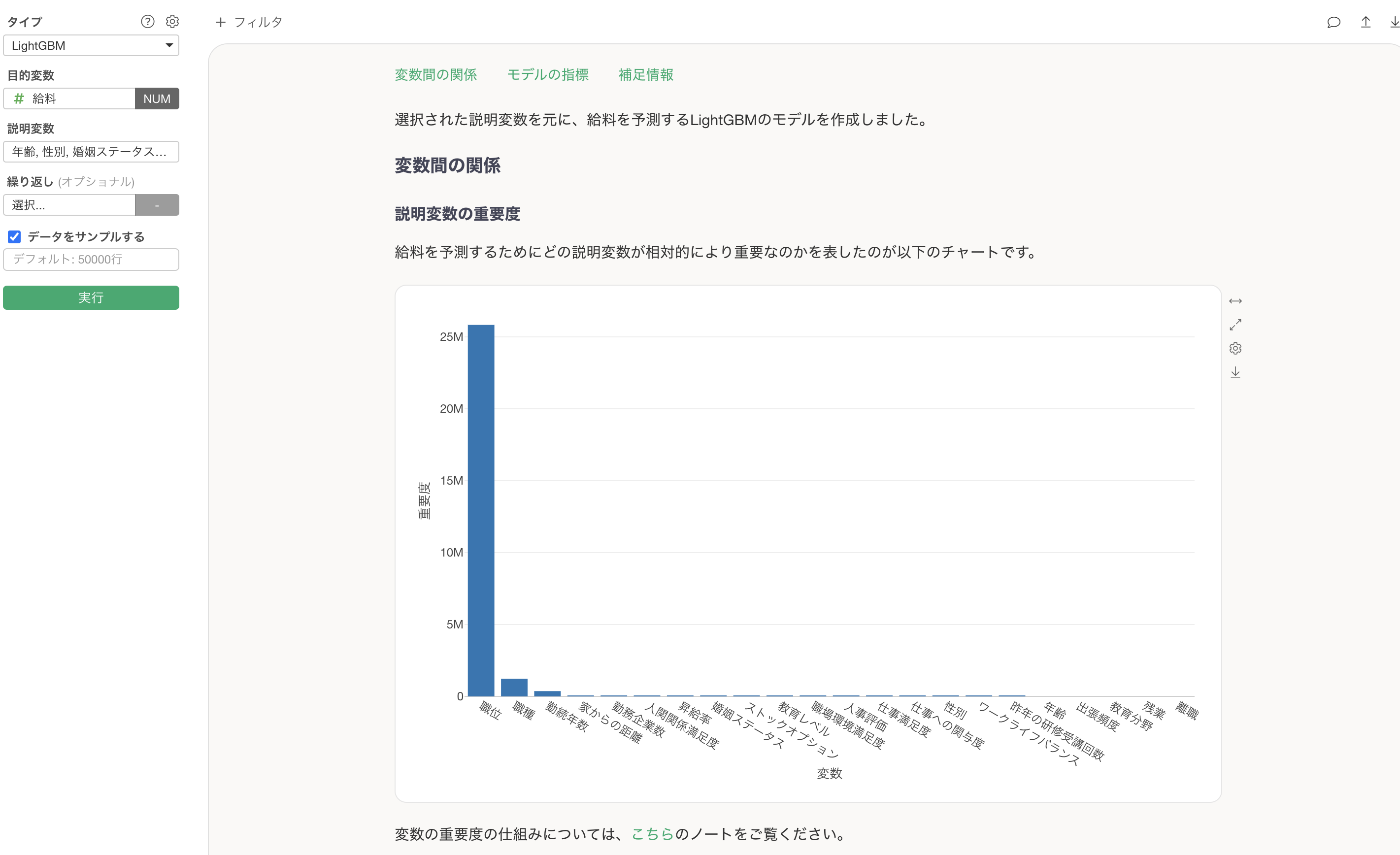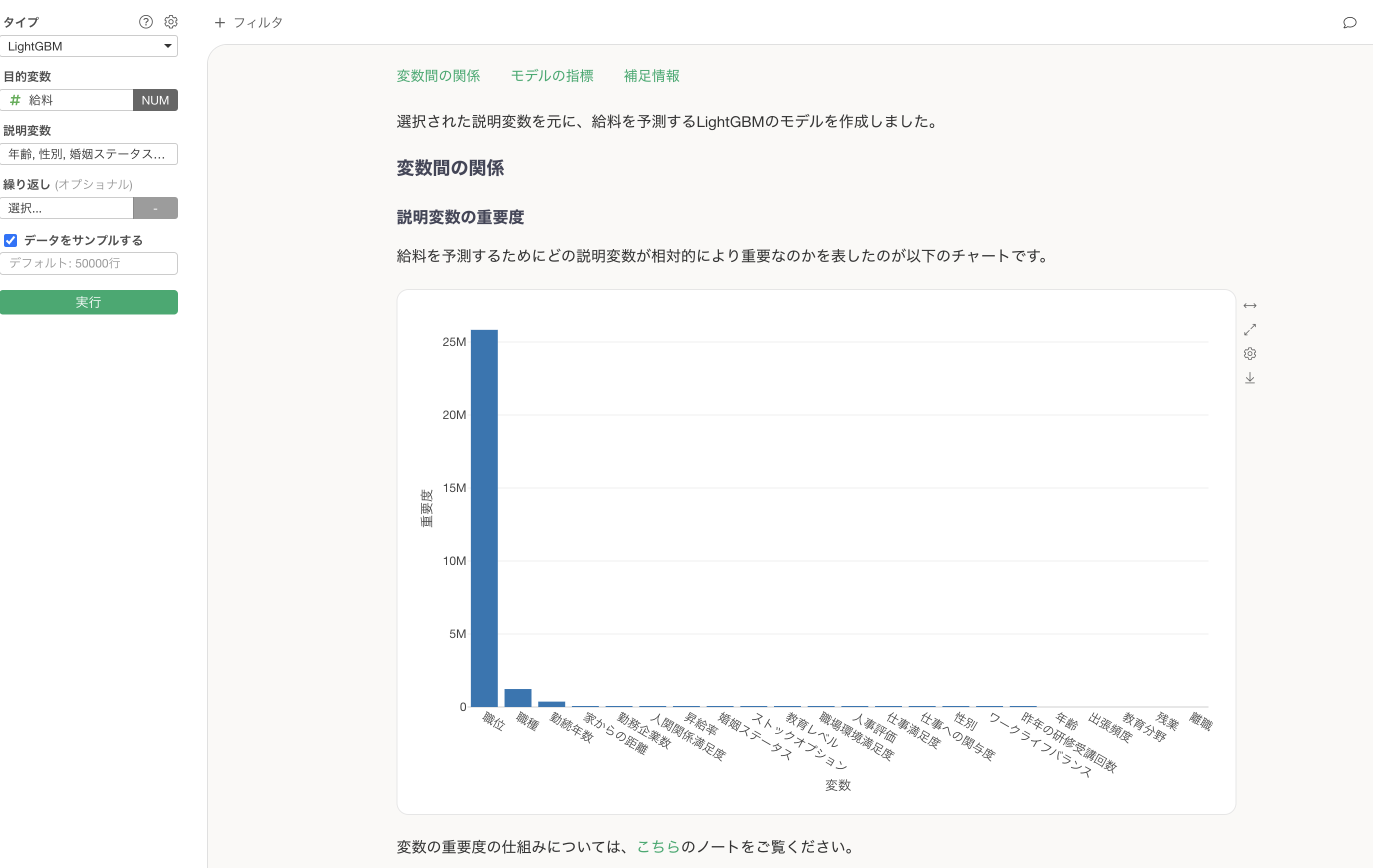 説明変数の重要度のセクションでは、どの変数が目的変数とより相関が強いのか、予測する時により重要なのかを調べることができます。