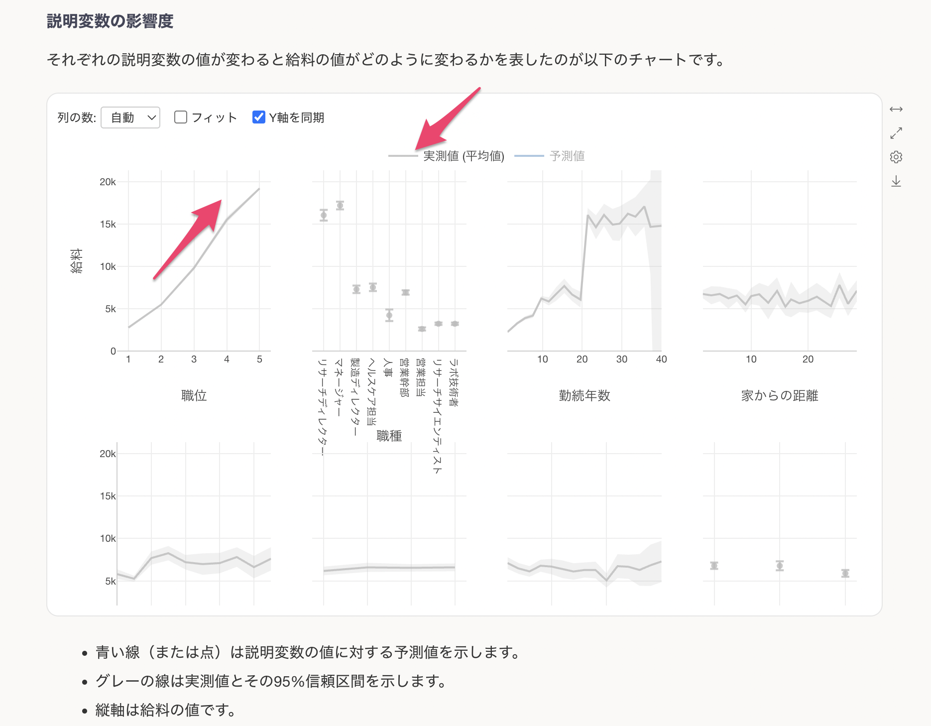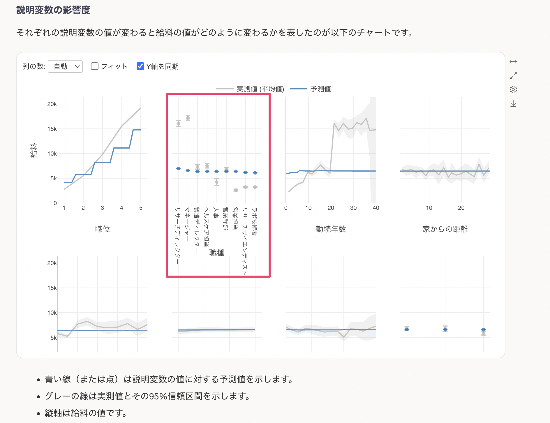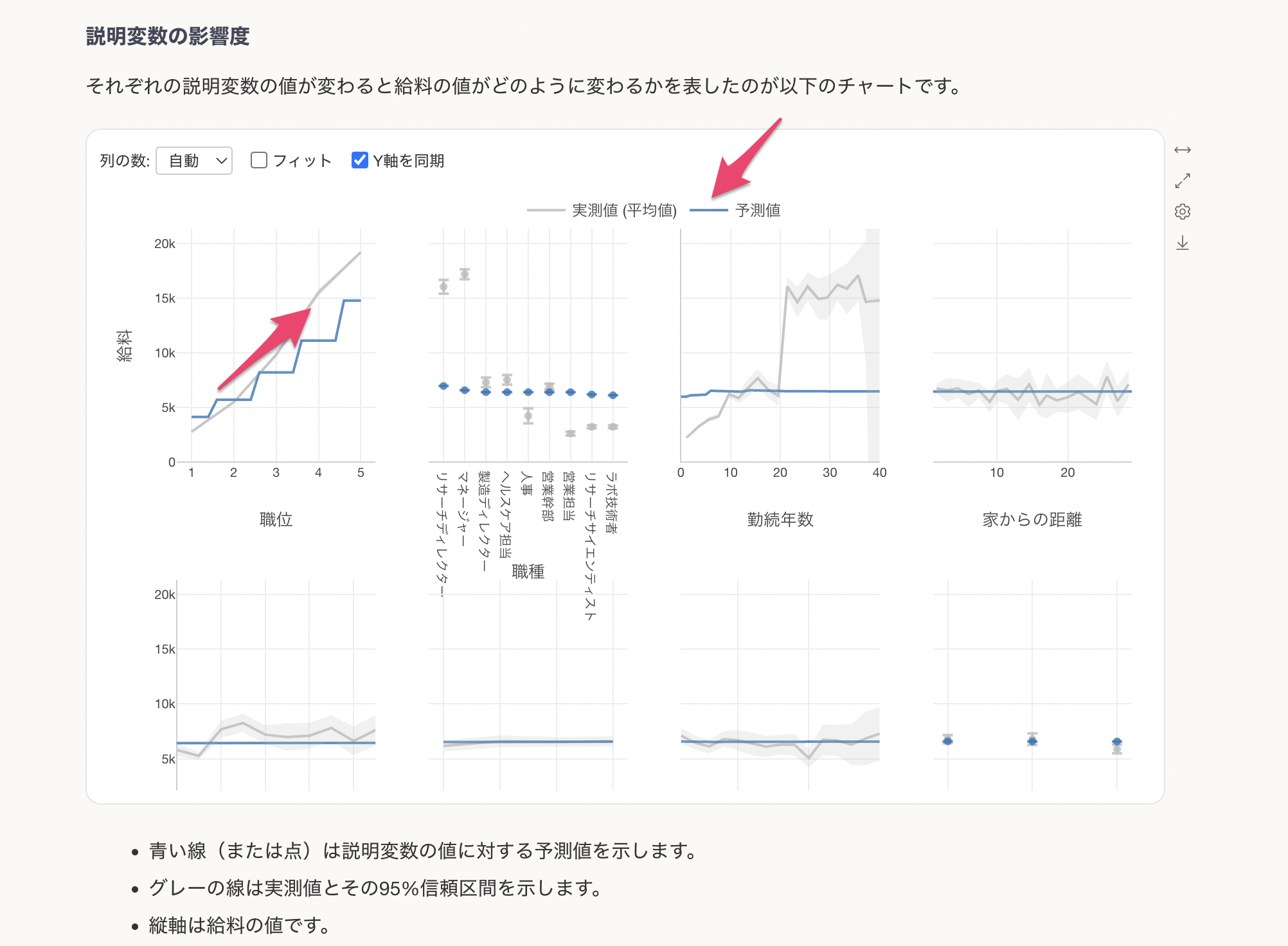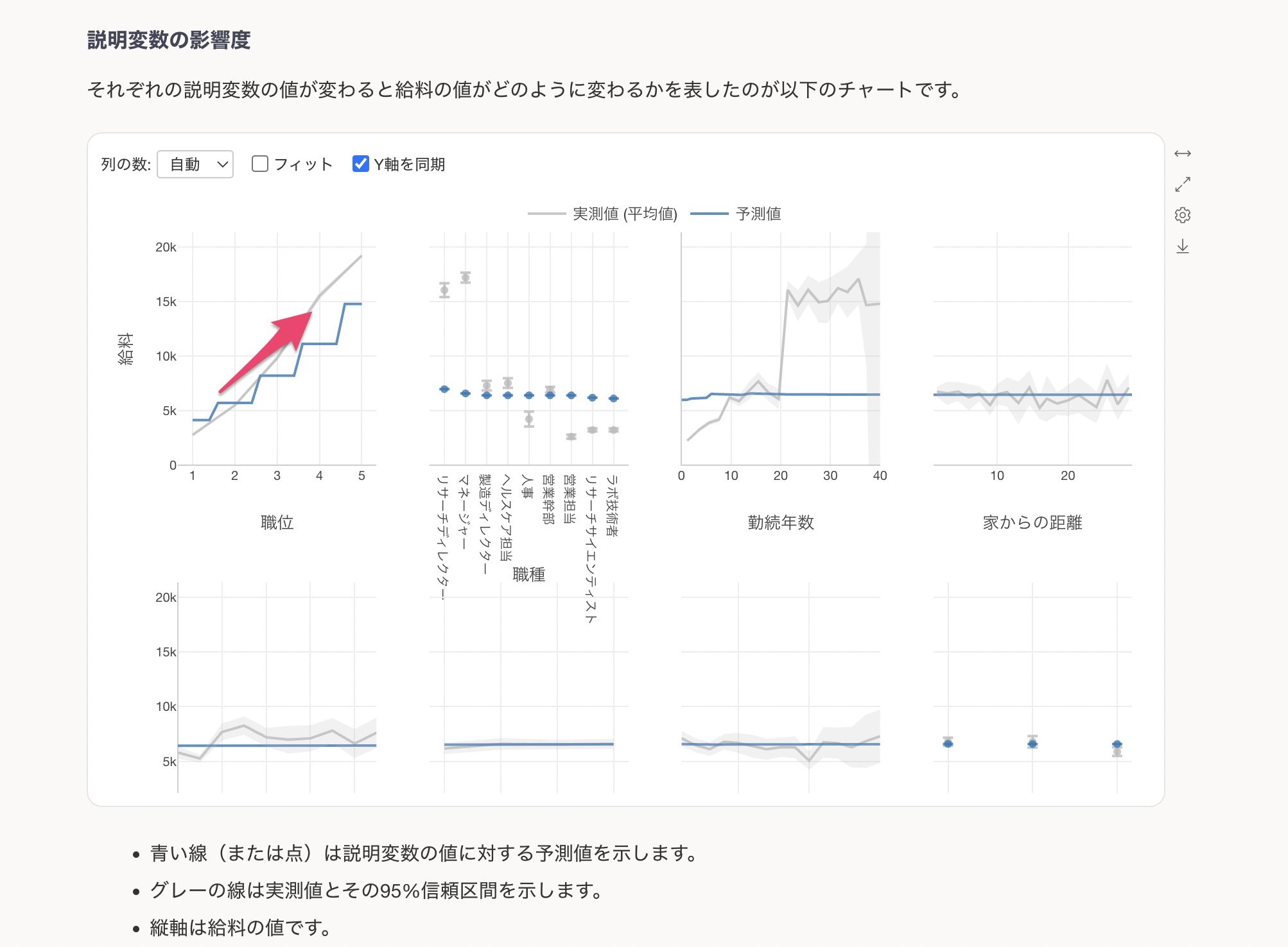 グレーの線は実測値を、青い線は予測値(モデルが推定した値)を示しています。例えば、職位ごとの給料の変化を見ると、職位が上がるにつれて給料が大きく上昇する傾向が確認できます。