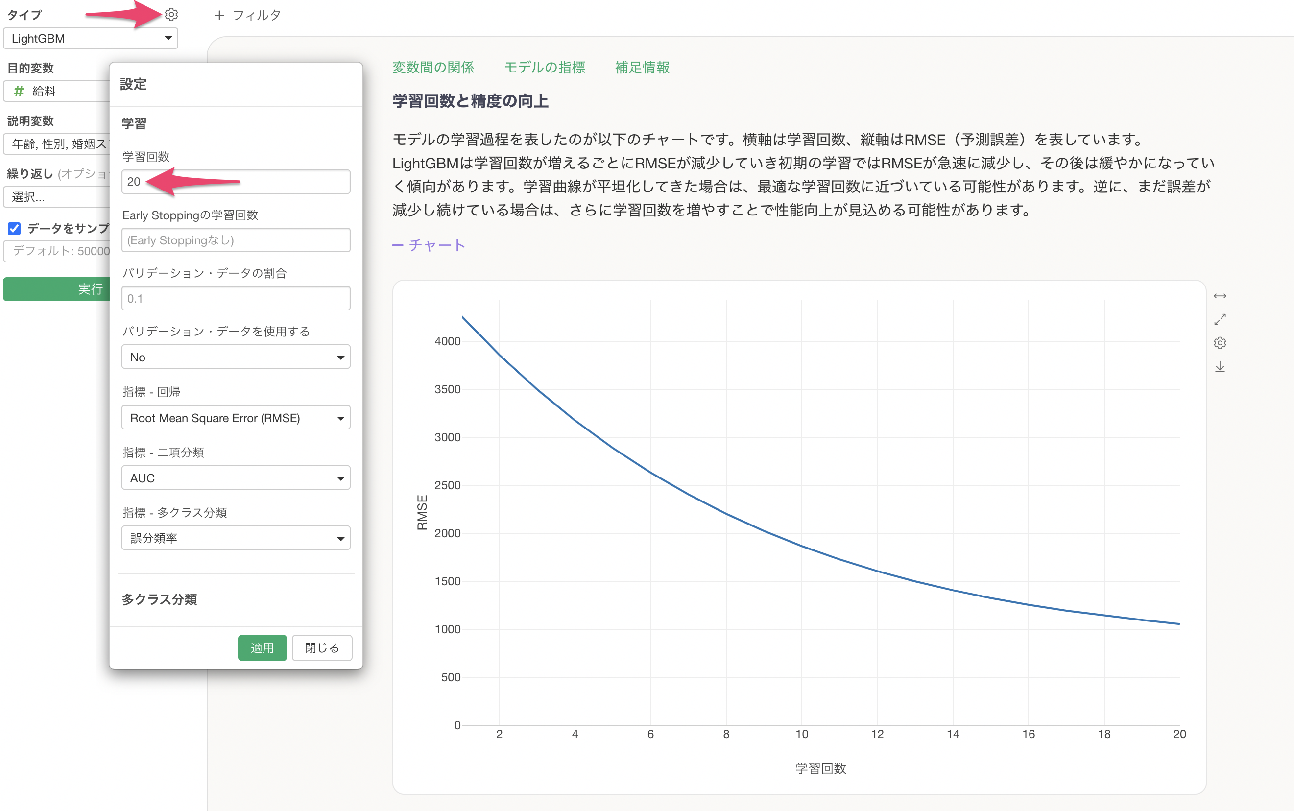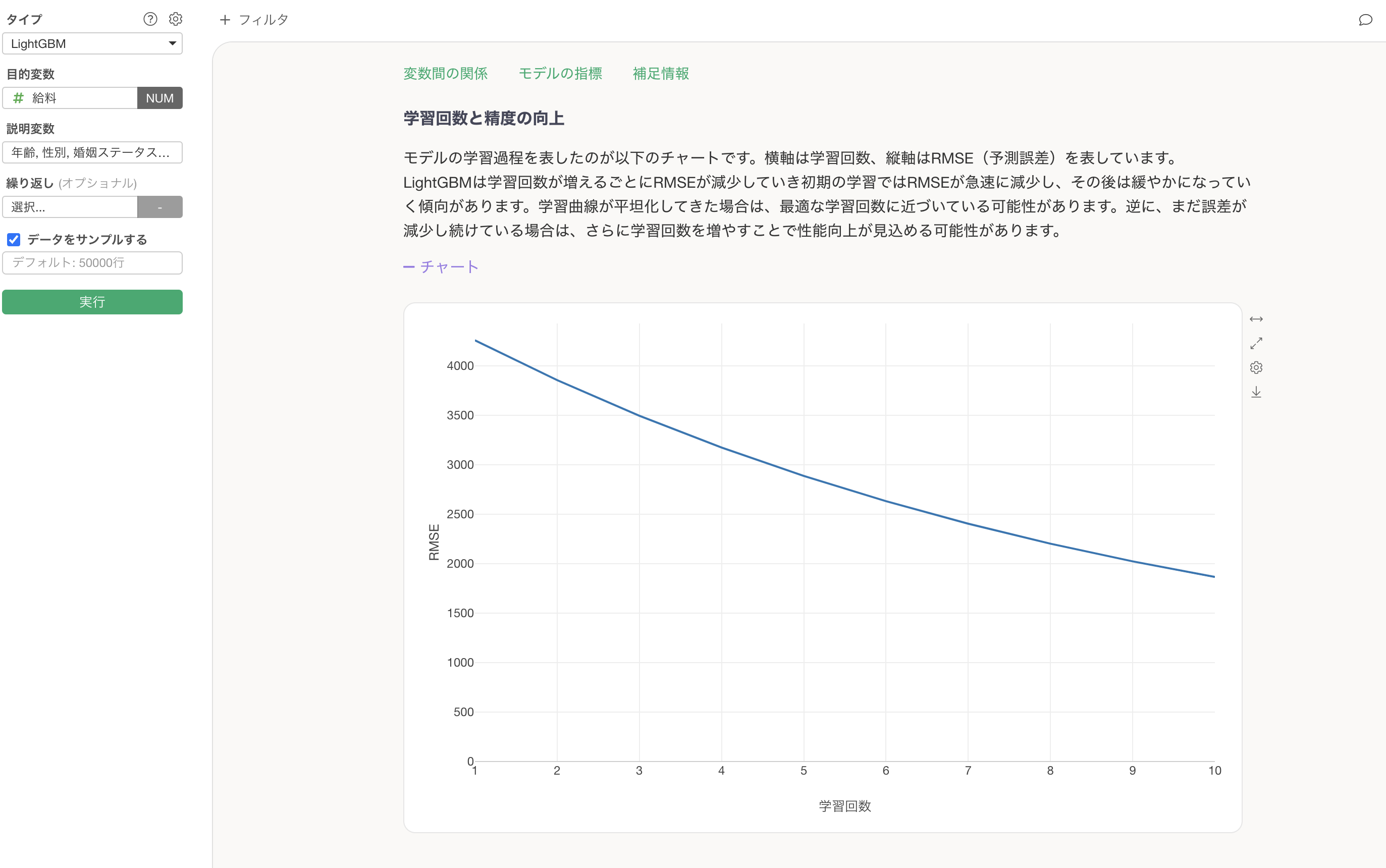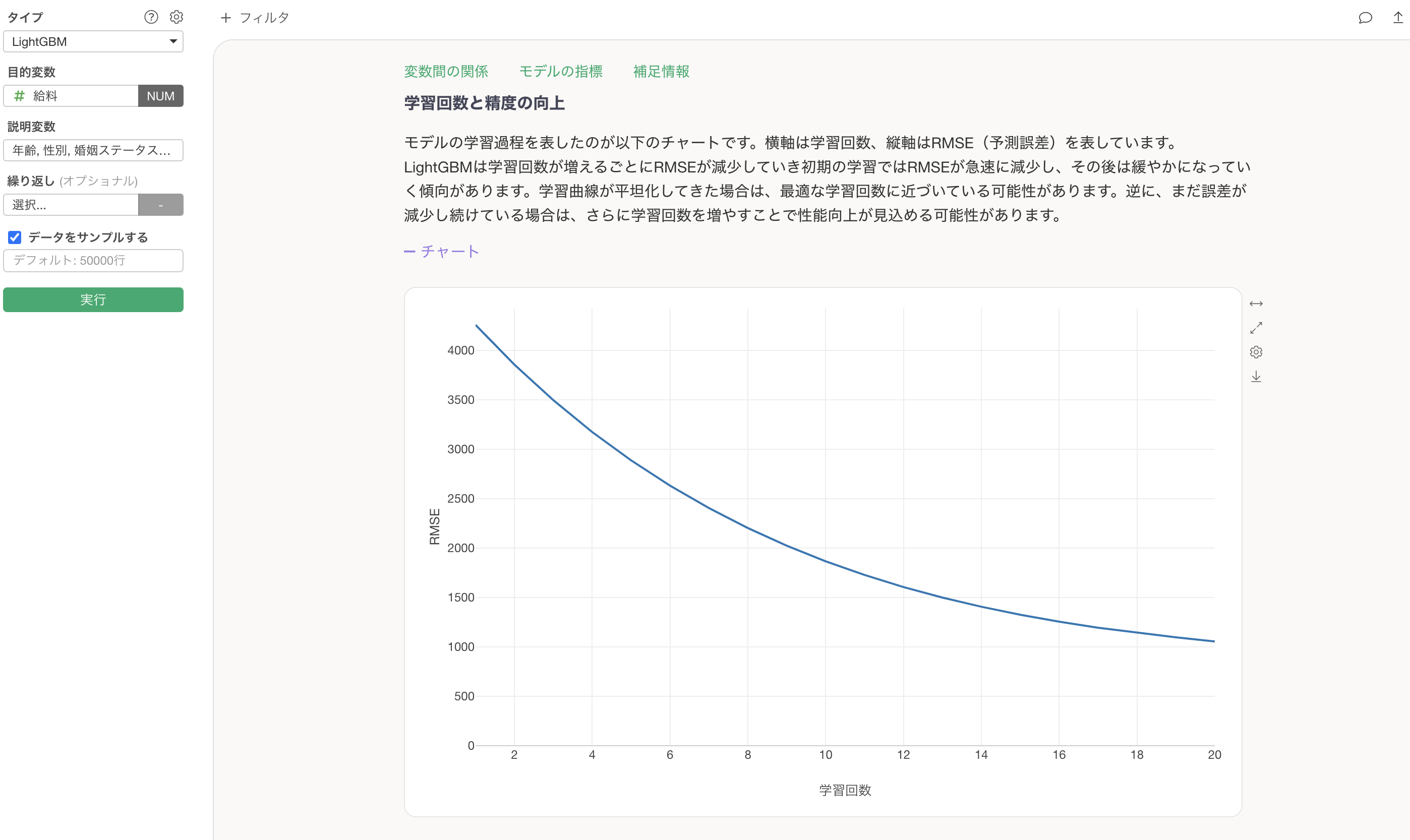 学習回数と精度の向上のセクションでは、学習回数(作成された決定木の数)によって、予測精度がどれだけ向上したかが確認できます。