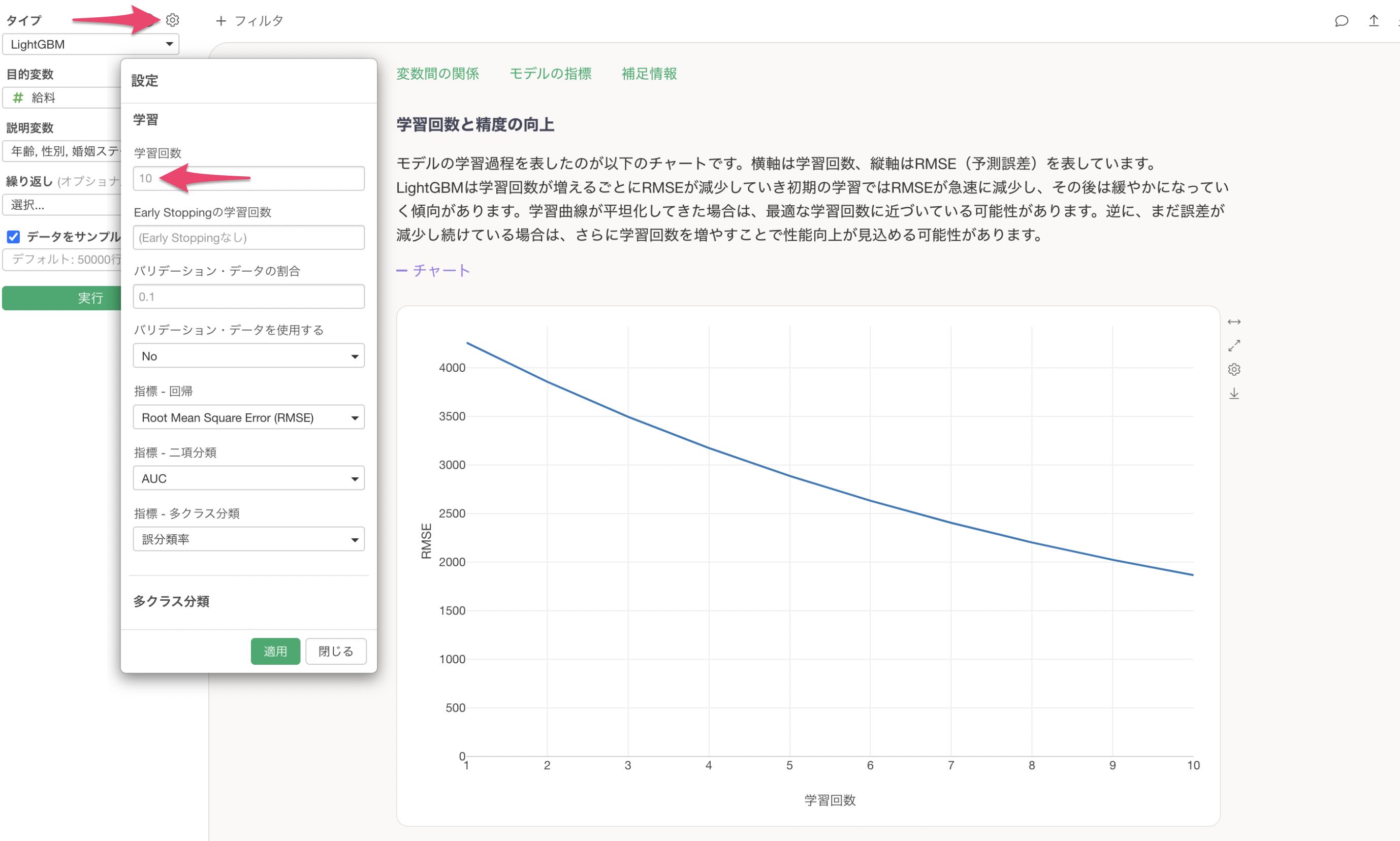 デフォルトの学習回数は10回になっていますが、プロパティから変更いただけます。また、それ以外にもEarly Stoppingの学習回数(学習した結果、予測精度が向上しない時に打ち切る回数)や、学習の際に使用する指標も変更できます。