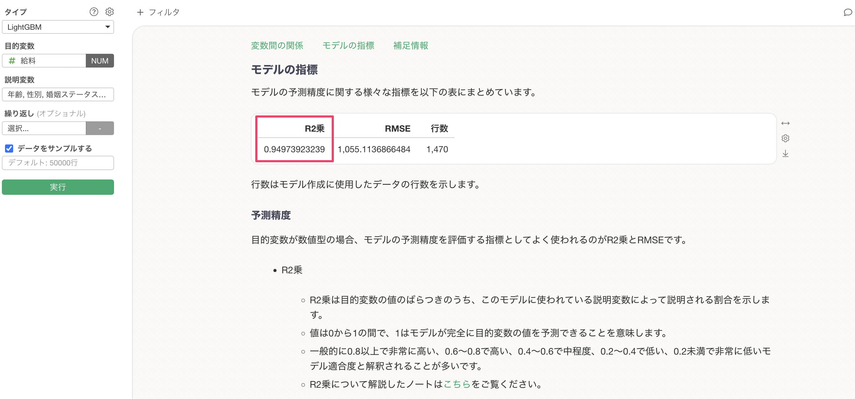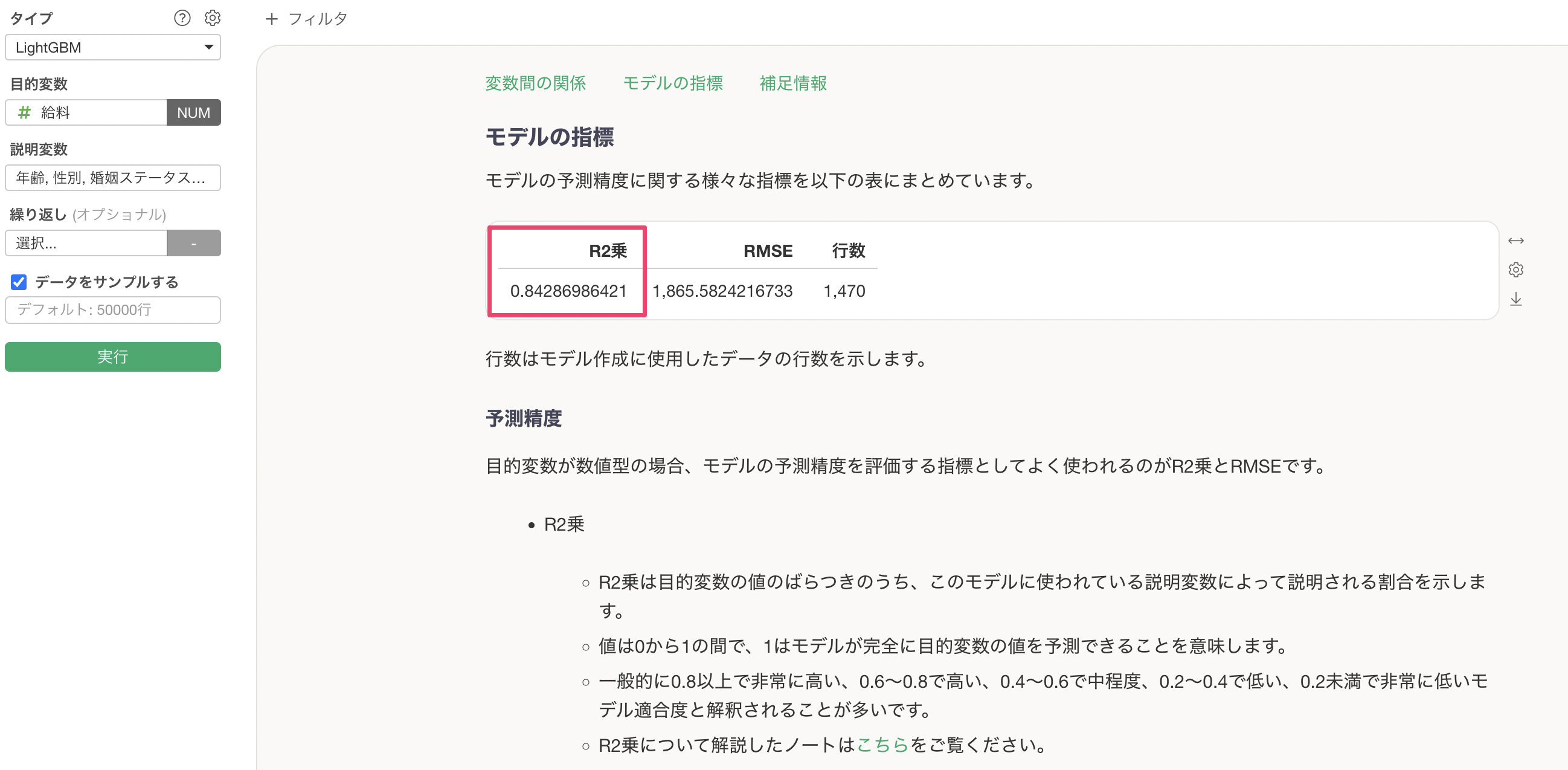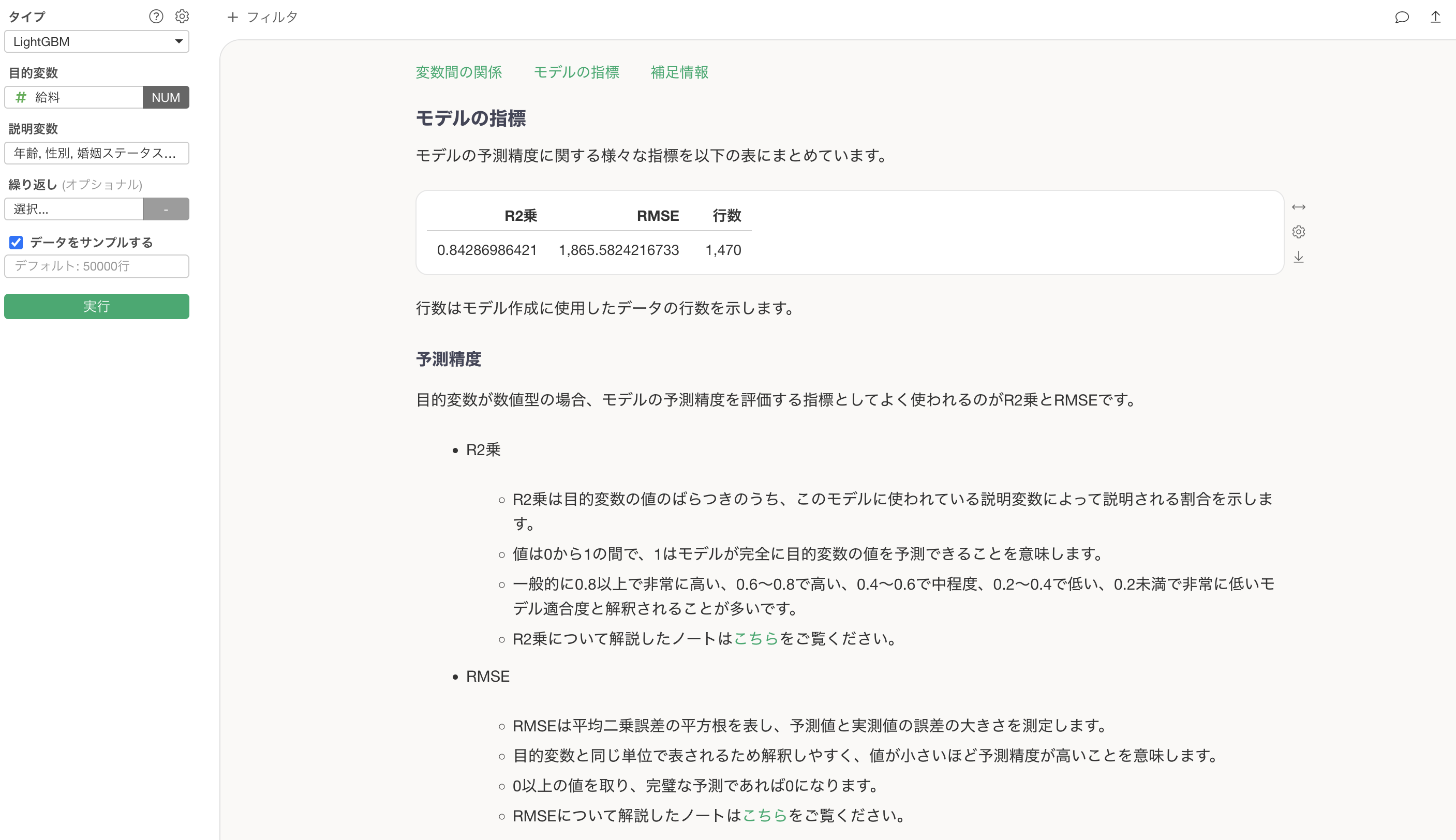 説明変数を設定したら、「実行」ボタンをクリックします。