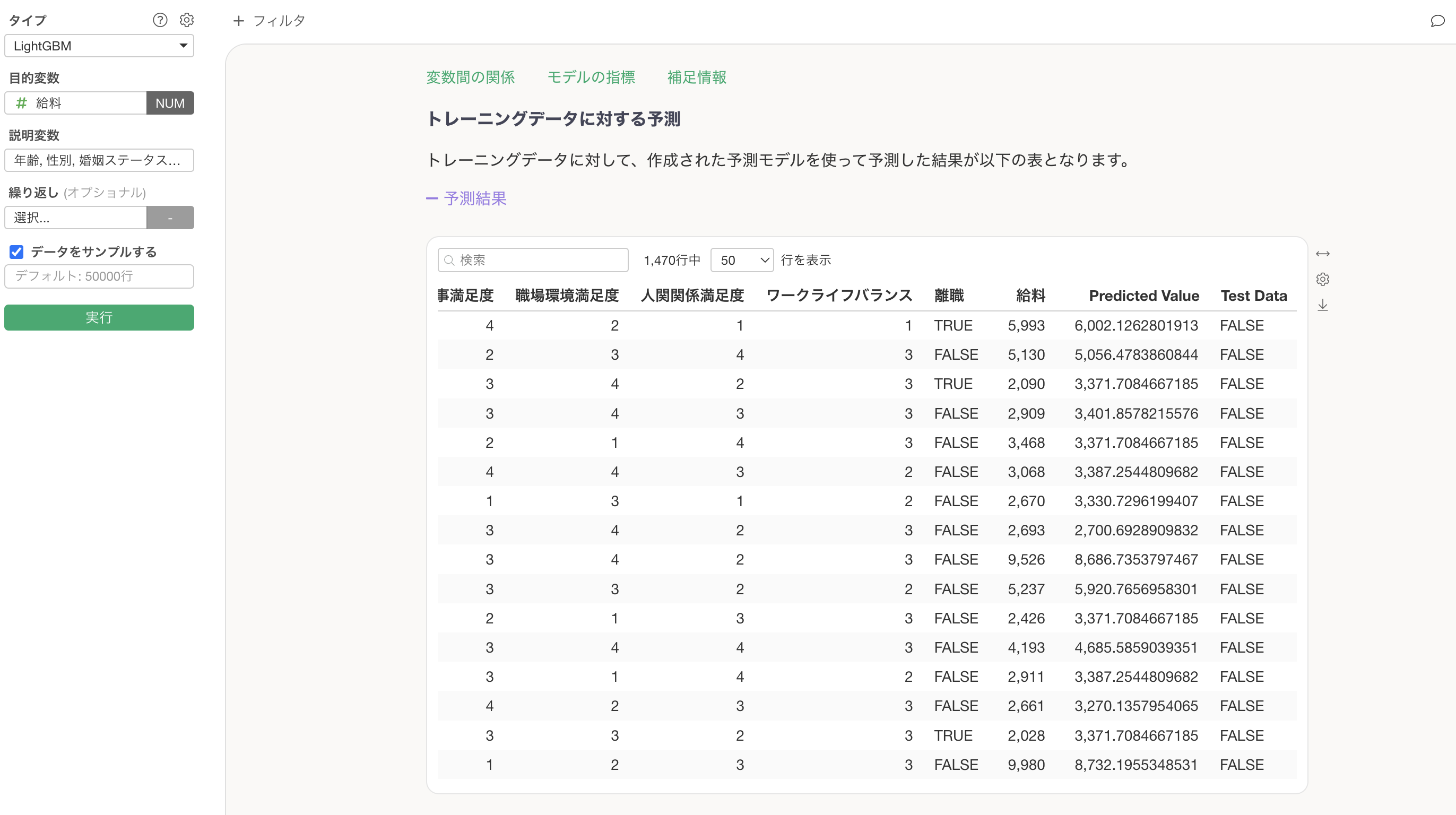 トレーニングデータに対する予測のセクションでは、モデルに使用したデータと予測値をテーブル形式で確認できます。目的変数である給料と、このモデルで算出された予測値(Predicted Value)を並べて確認することで、モデルの予測がどの程度正確かを個別のデータレベルで把握できます。