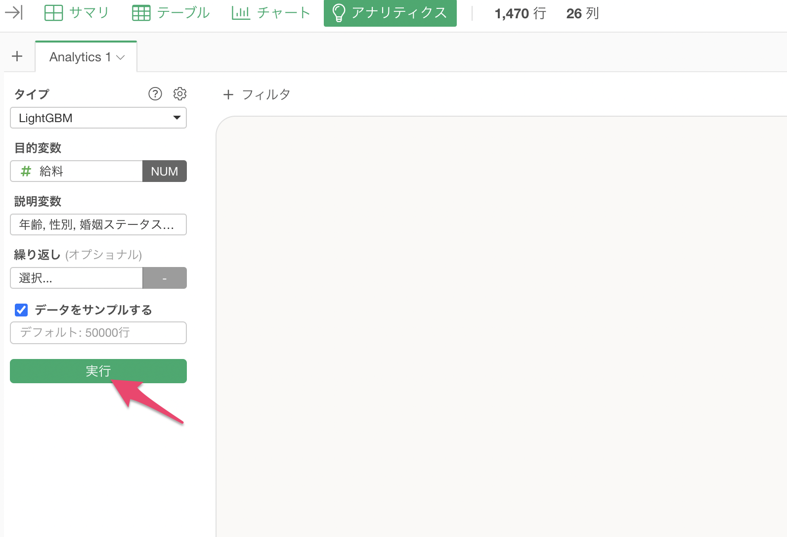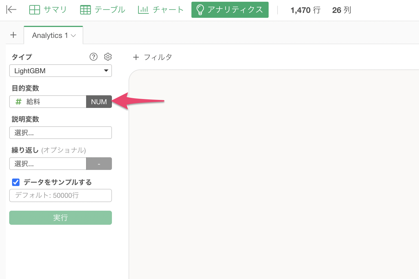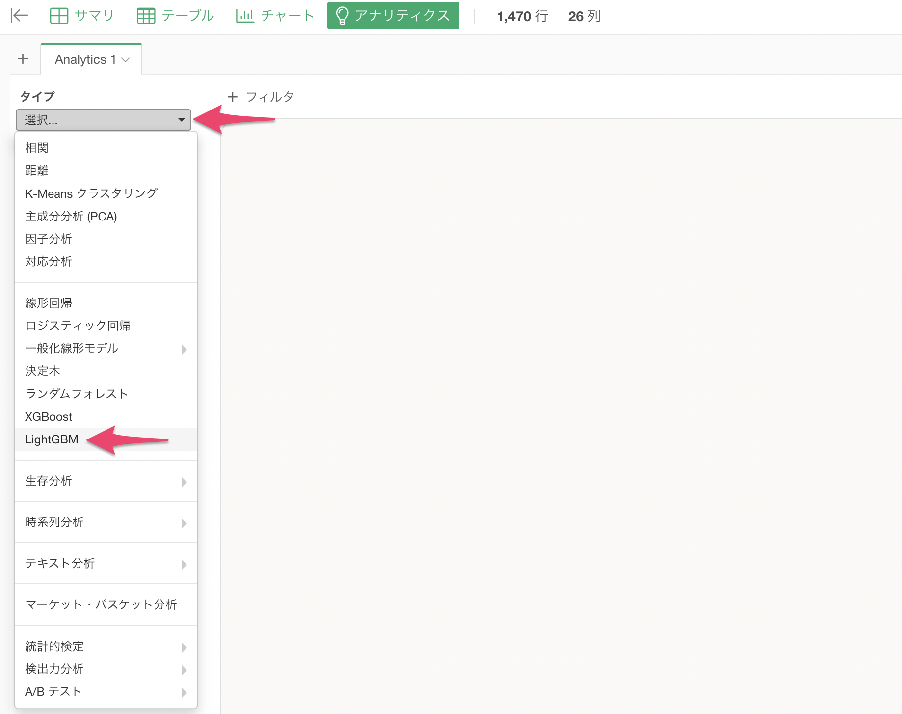 アナリティクスビューを開き、タイプに「LightGBM」を選択します。
